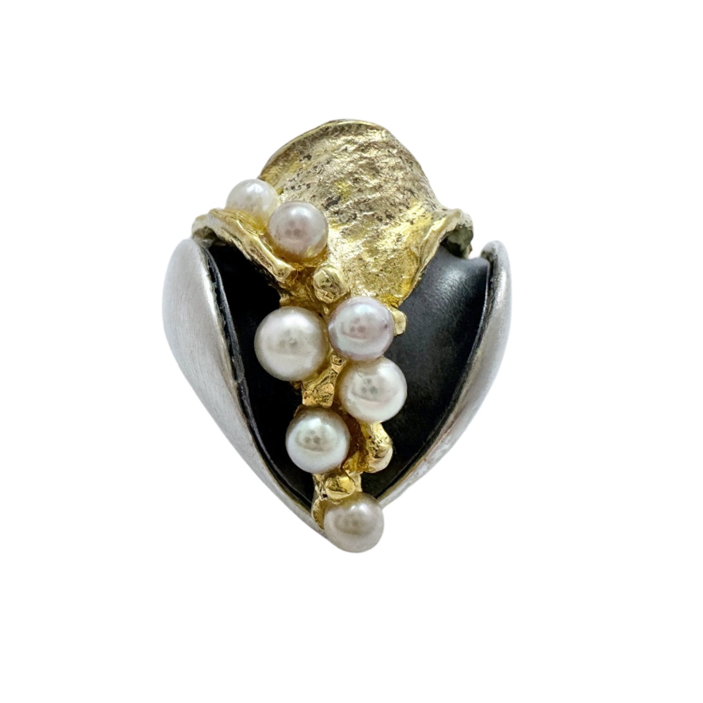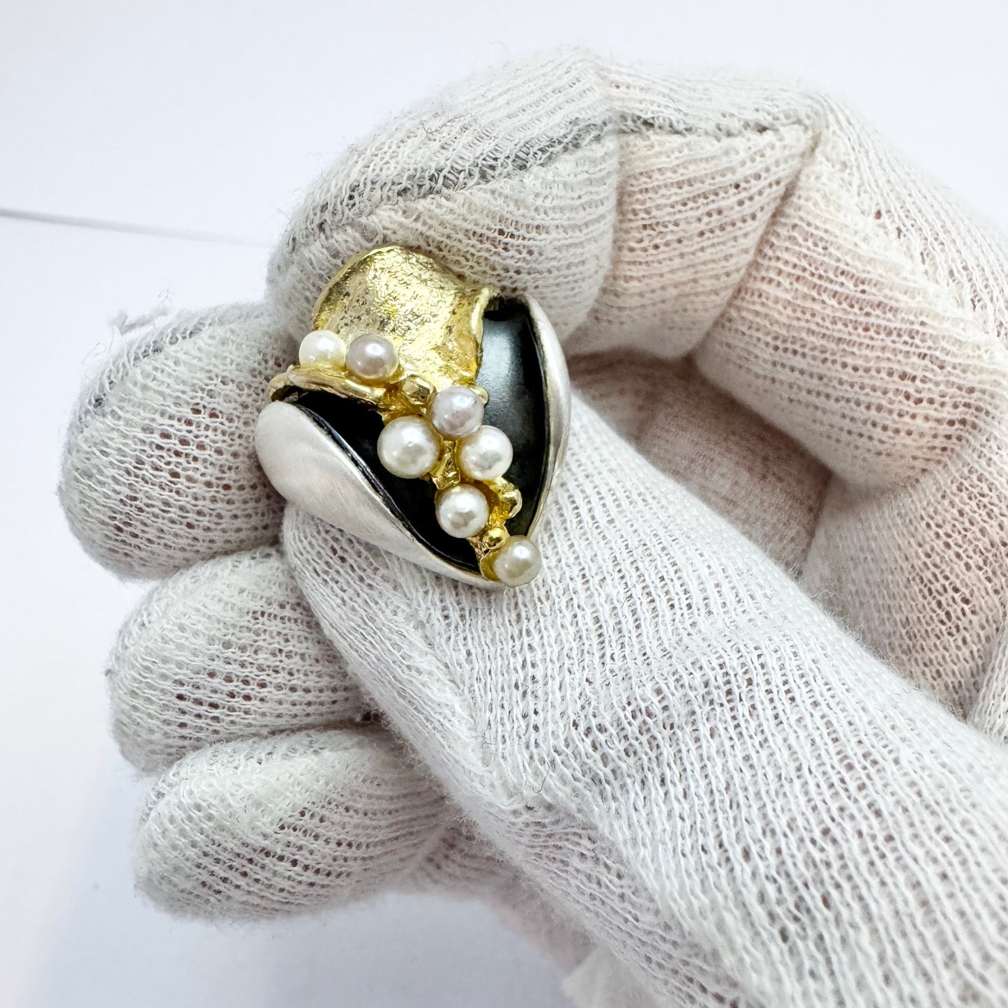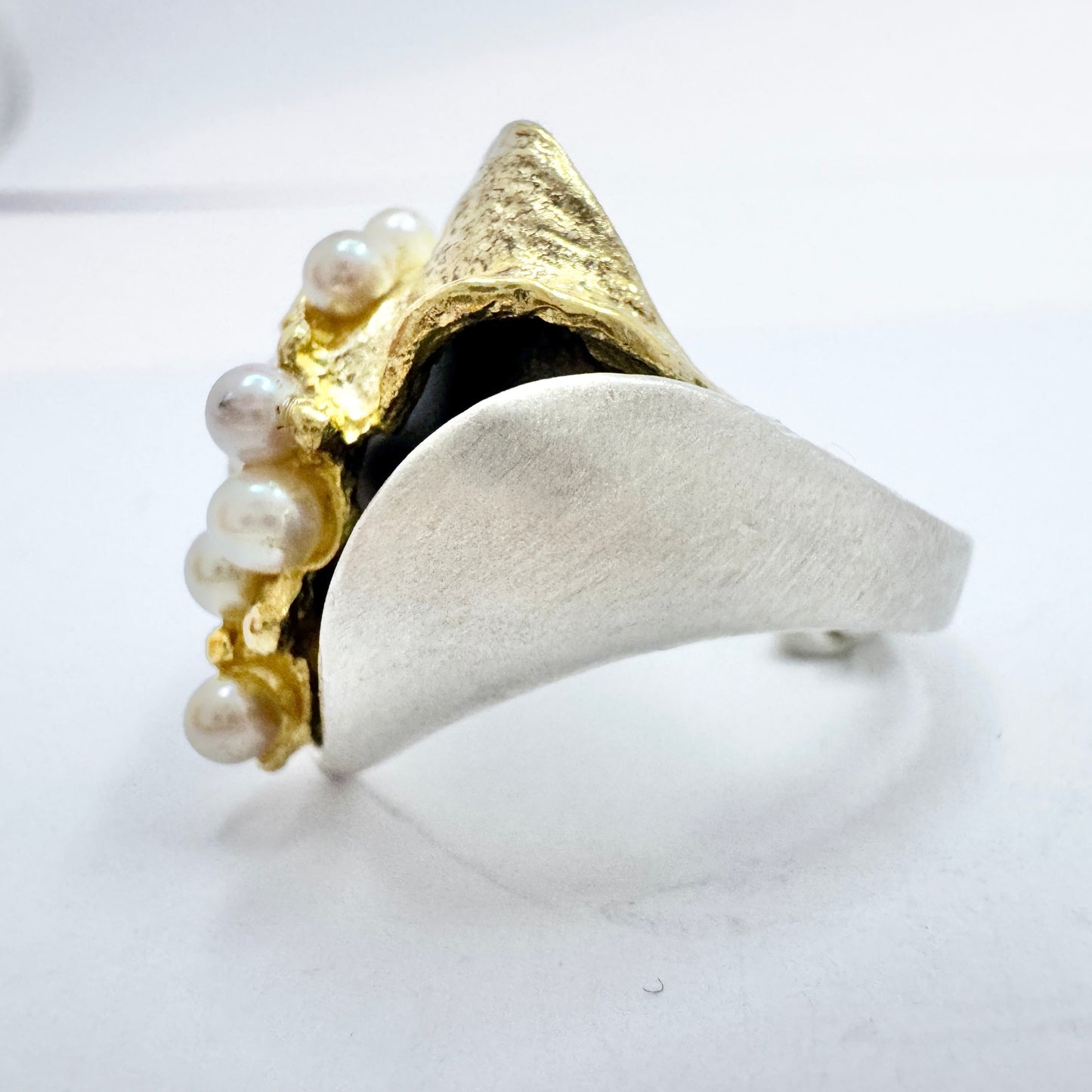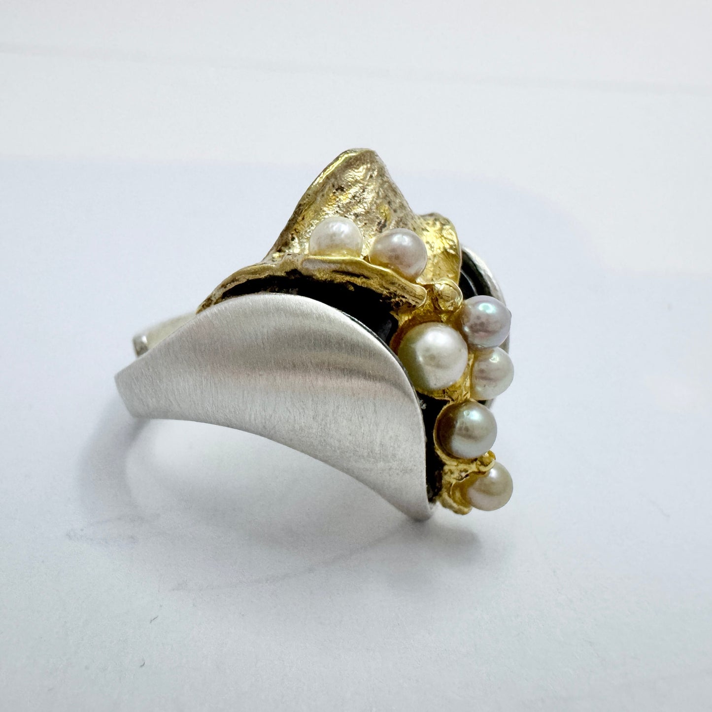 美しいスターリング シルバーの養殖真珠リング。部分的に金メッキされ、黒くなっています。署名/刻印は不明です。