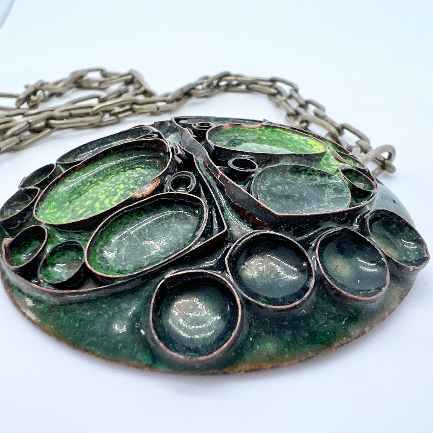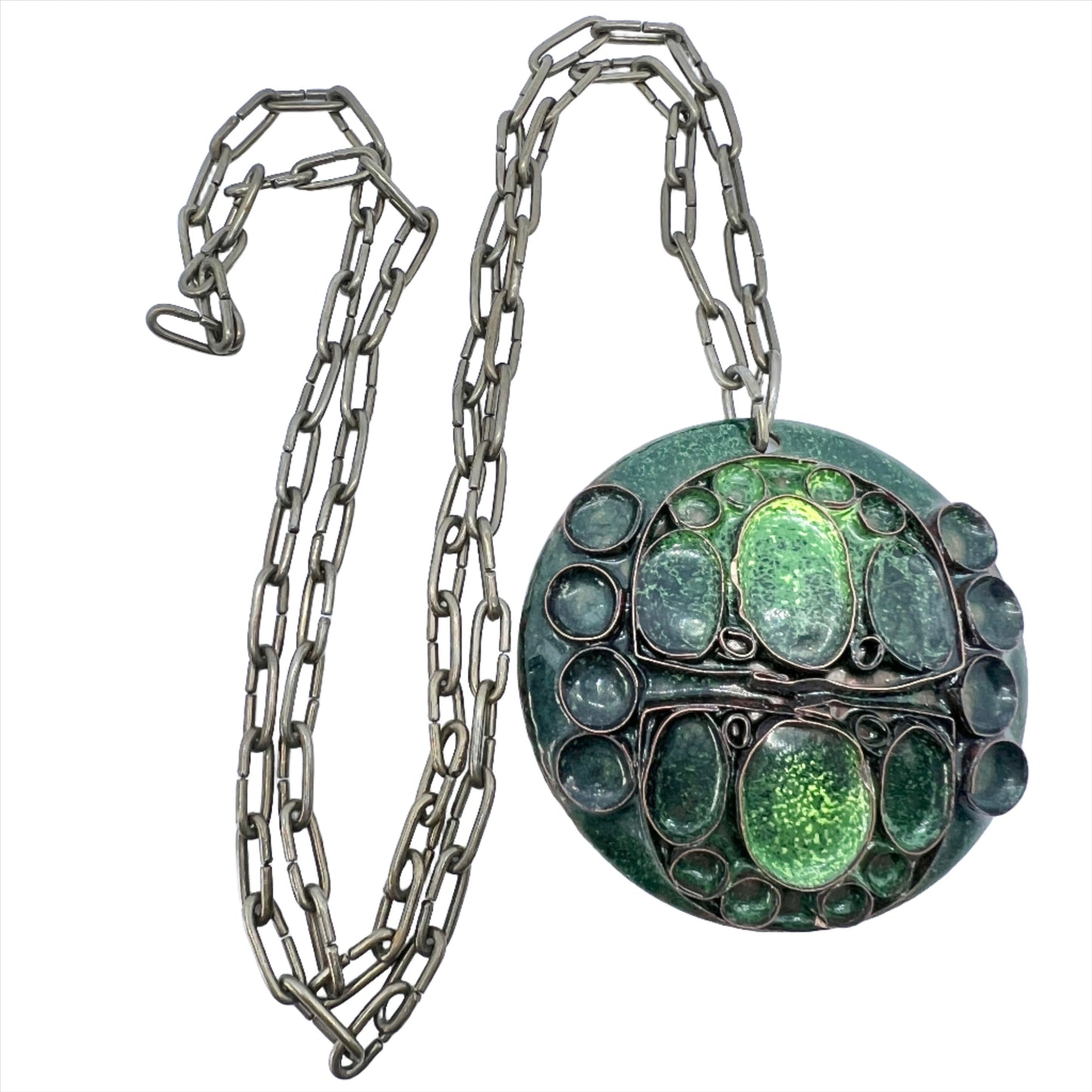 Anja Mäkinen, Finland 1970s. Large Vintage Green Enamel Copper Pendant Necklace.