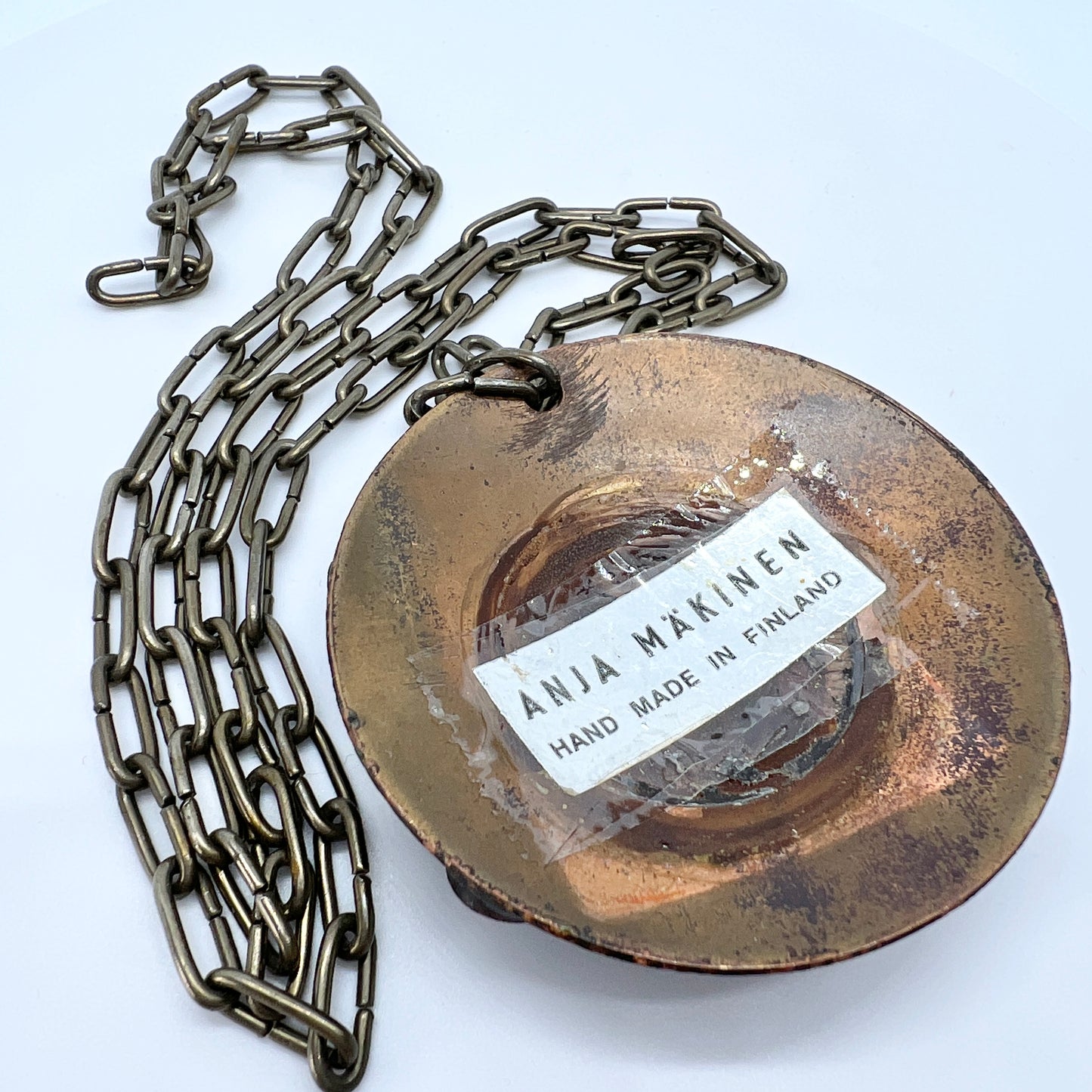 Beautiful vintage enamel on copper pendant necklace. Original sticker: Anja Mäkinen, Finland 1970s