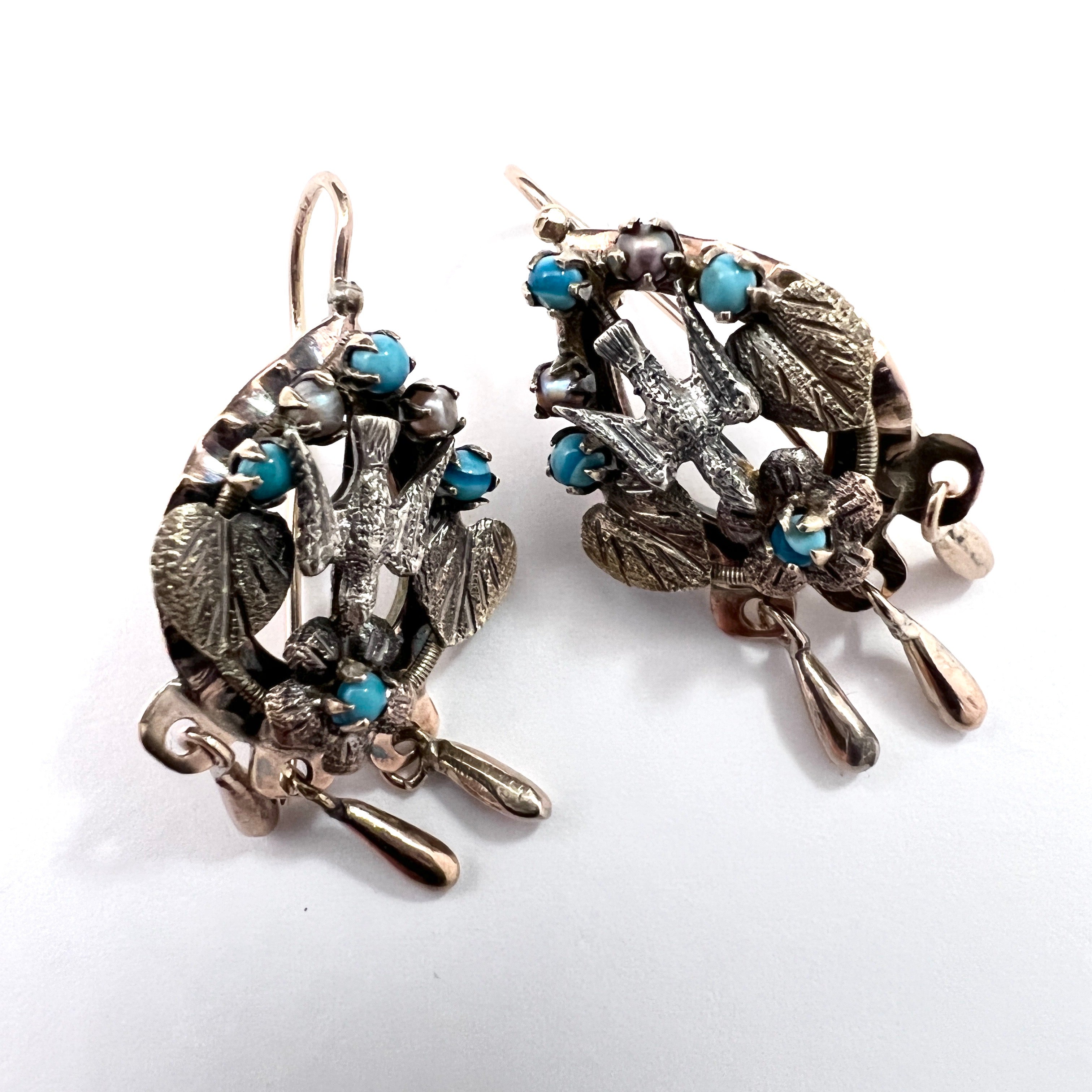 Antique 14k Gold Turquoise Pearl Swallow Earrings.