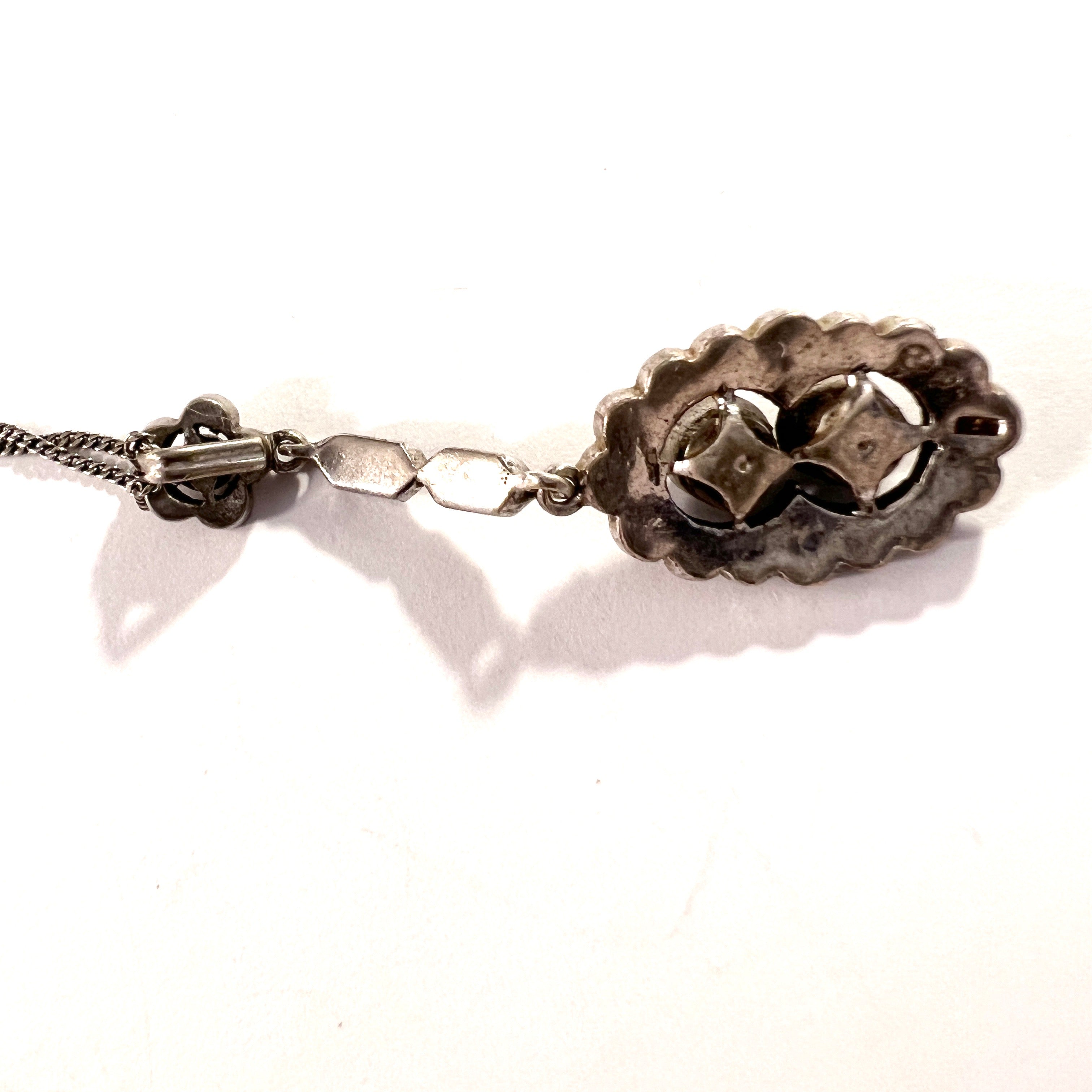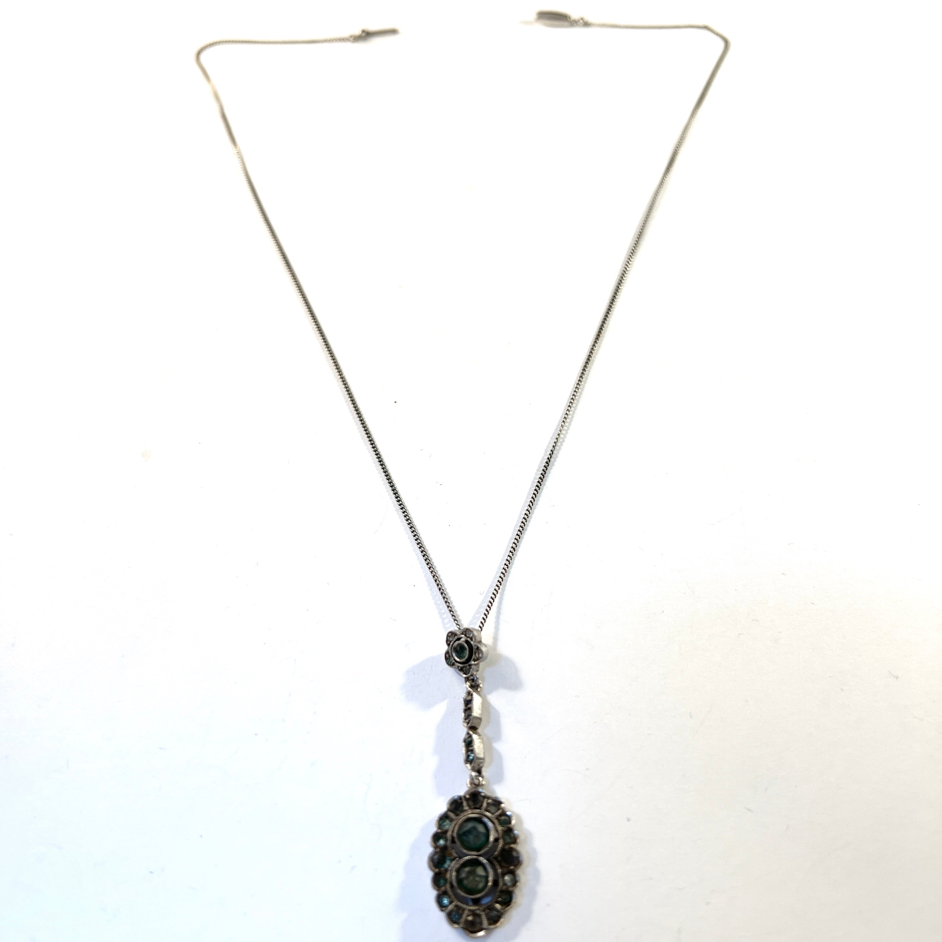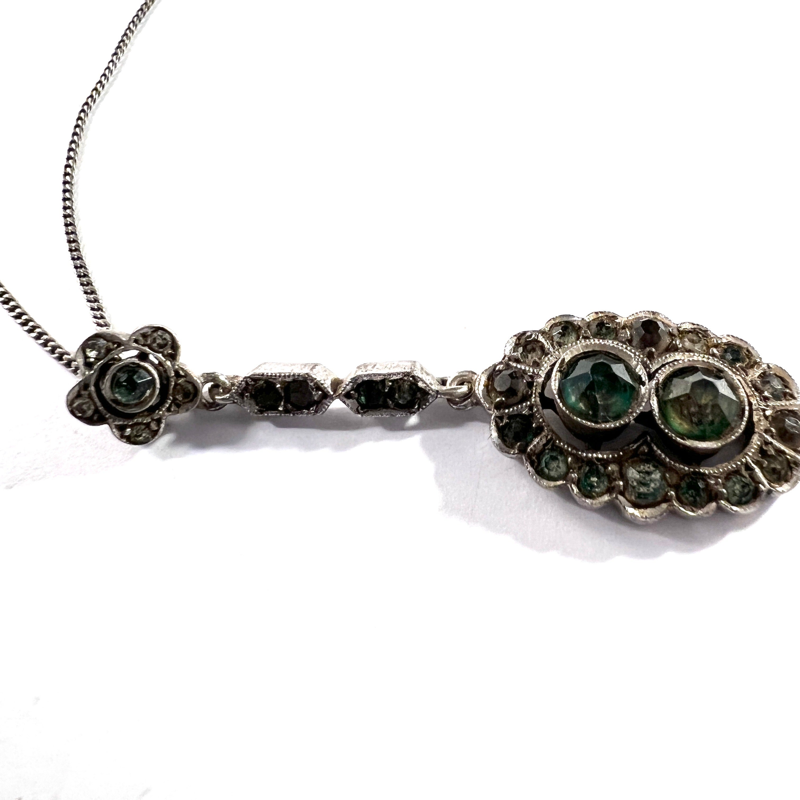 Very charming antique 835 silver green foil back paste stone pendant necklace. Chain and pendant hallmarked for 835 silver and Swedish import marks. Continental Europe c 1920.