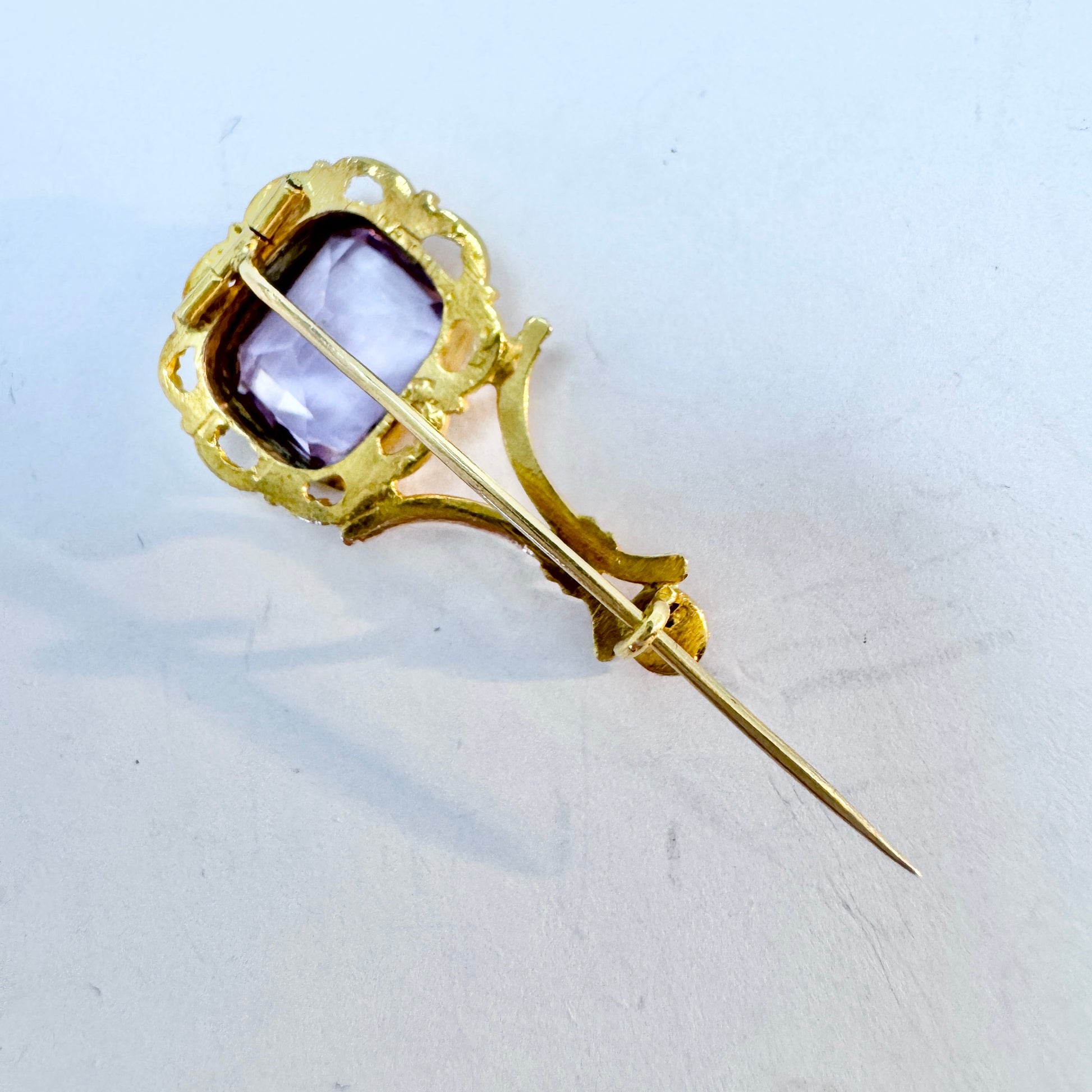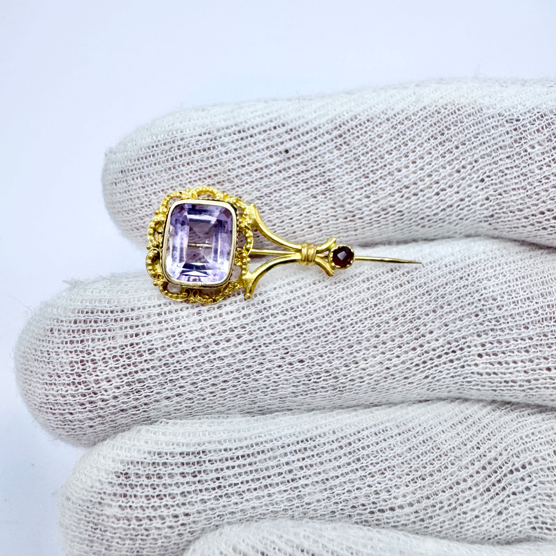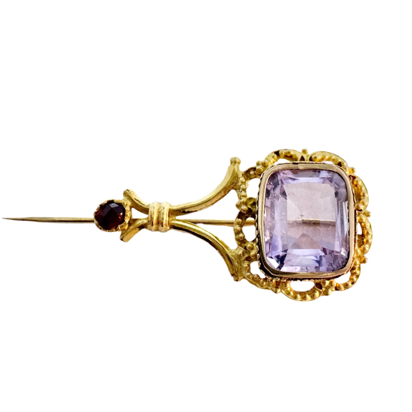 Wonderful and rare antique 18k gold amethyst and garnet brooch. Small indistinct and unidentified hallmark. Europe ca year 1835.