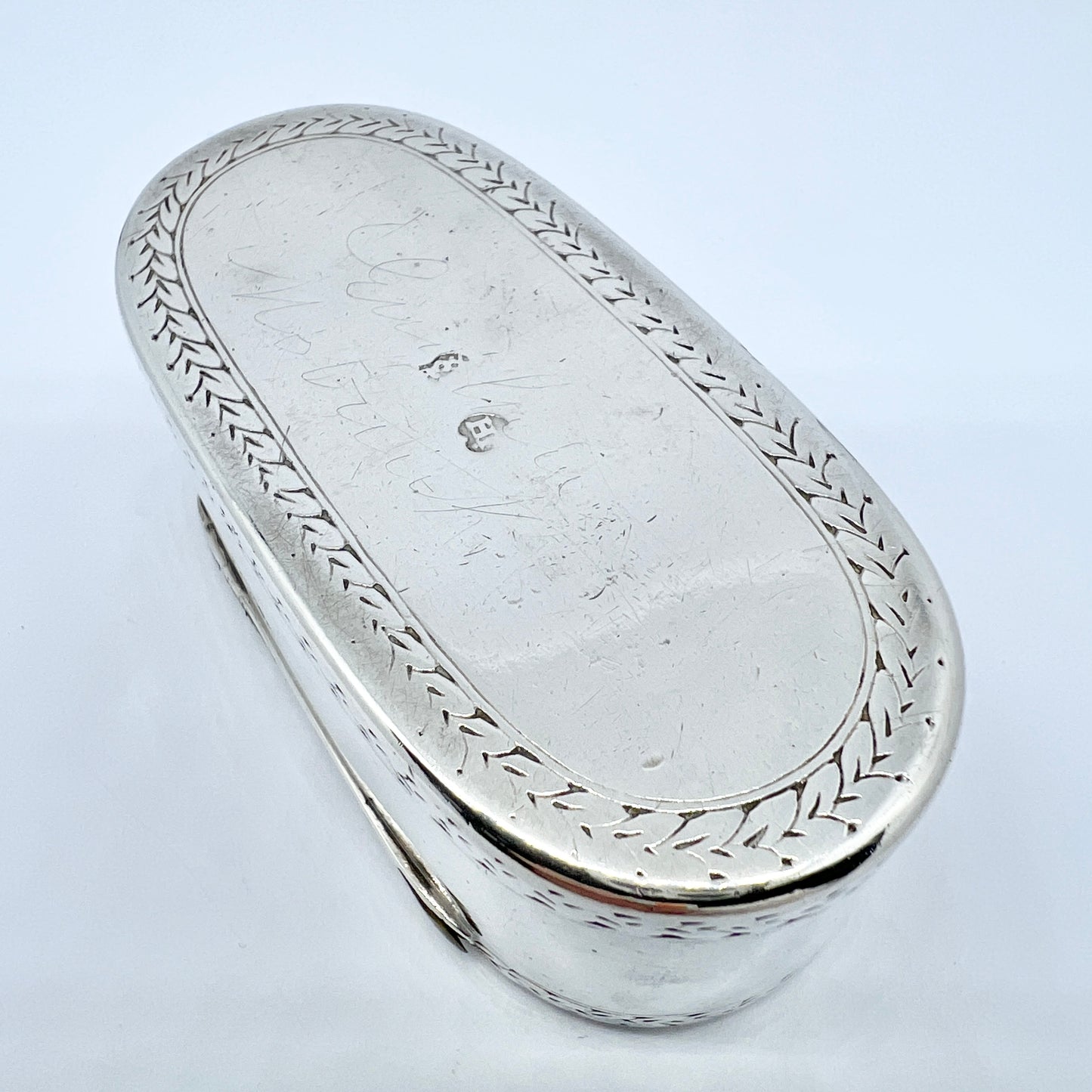 Wonderful antique Georgian solid silver snuff box. Unidentified hallmarks. Continental Europe c year 1800.