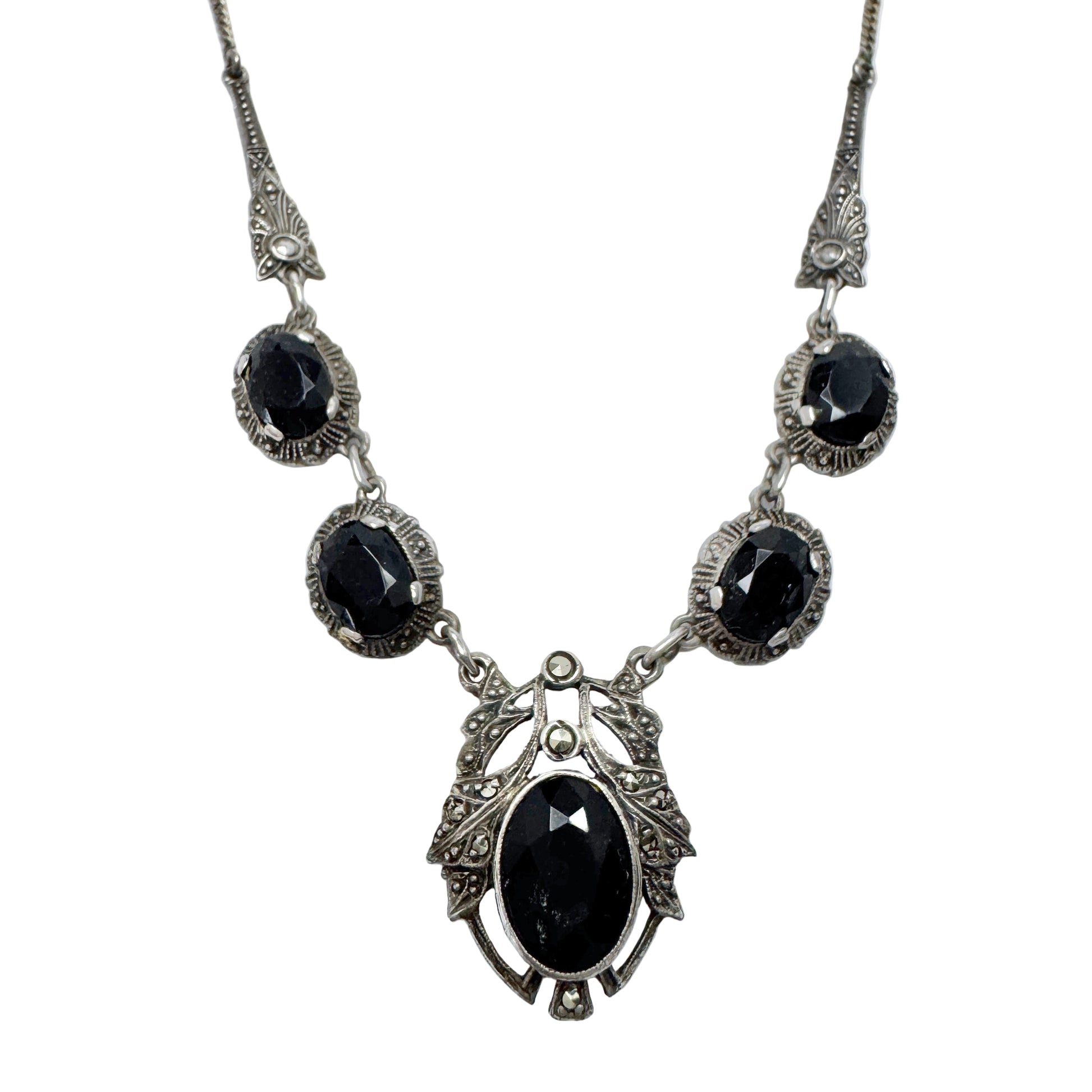 Antique Jugendstil Solid Silver Onyx Marcasite Necklace.