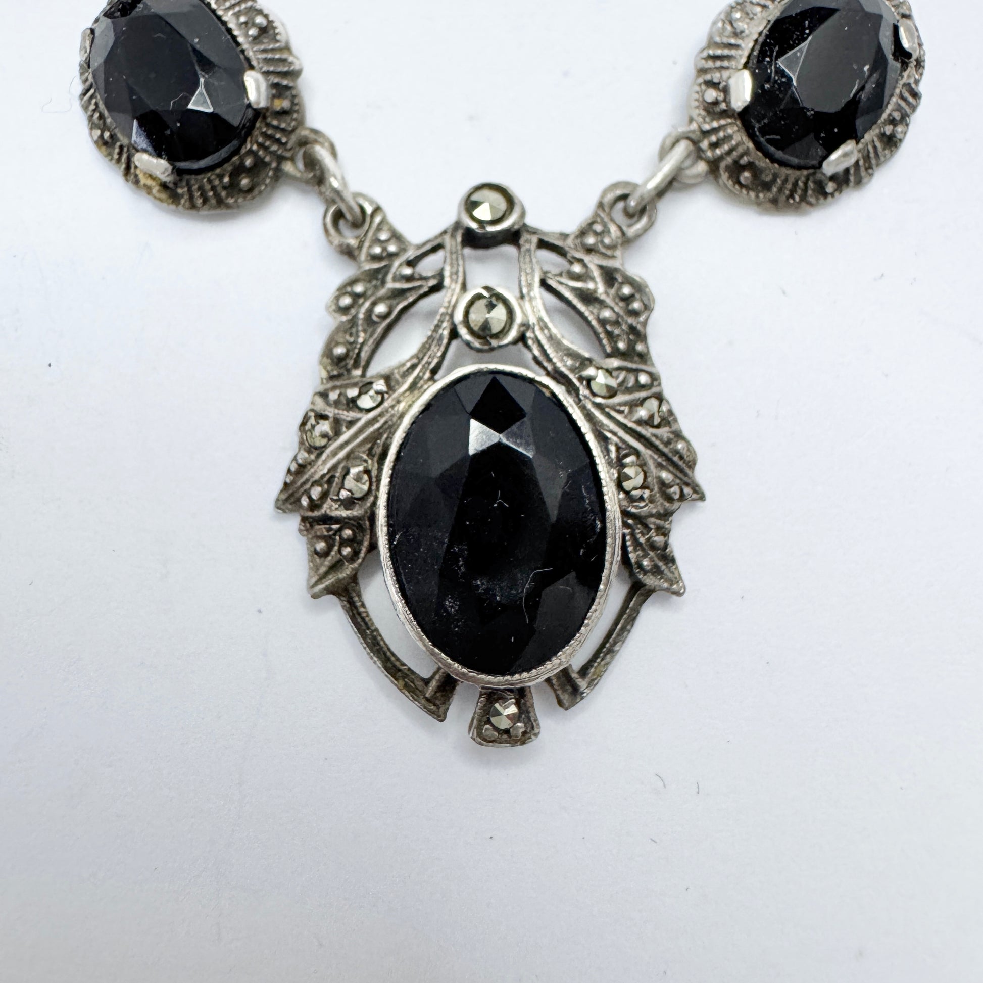 Wonderful and much sought after solid silver onyx marcasite necklace. Hallmarked for solid silver and Swedish import marks ca 1920. Most likely made in Germany.