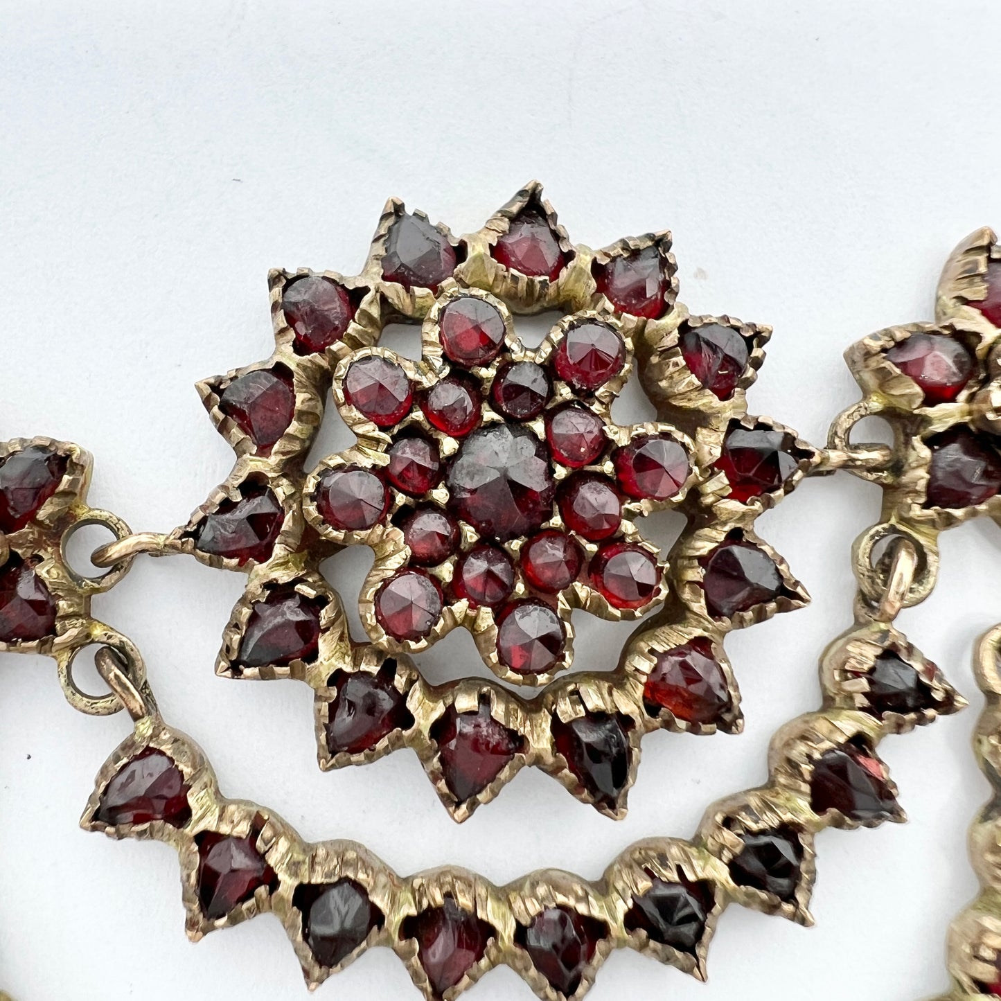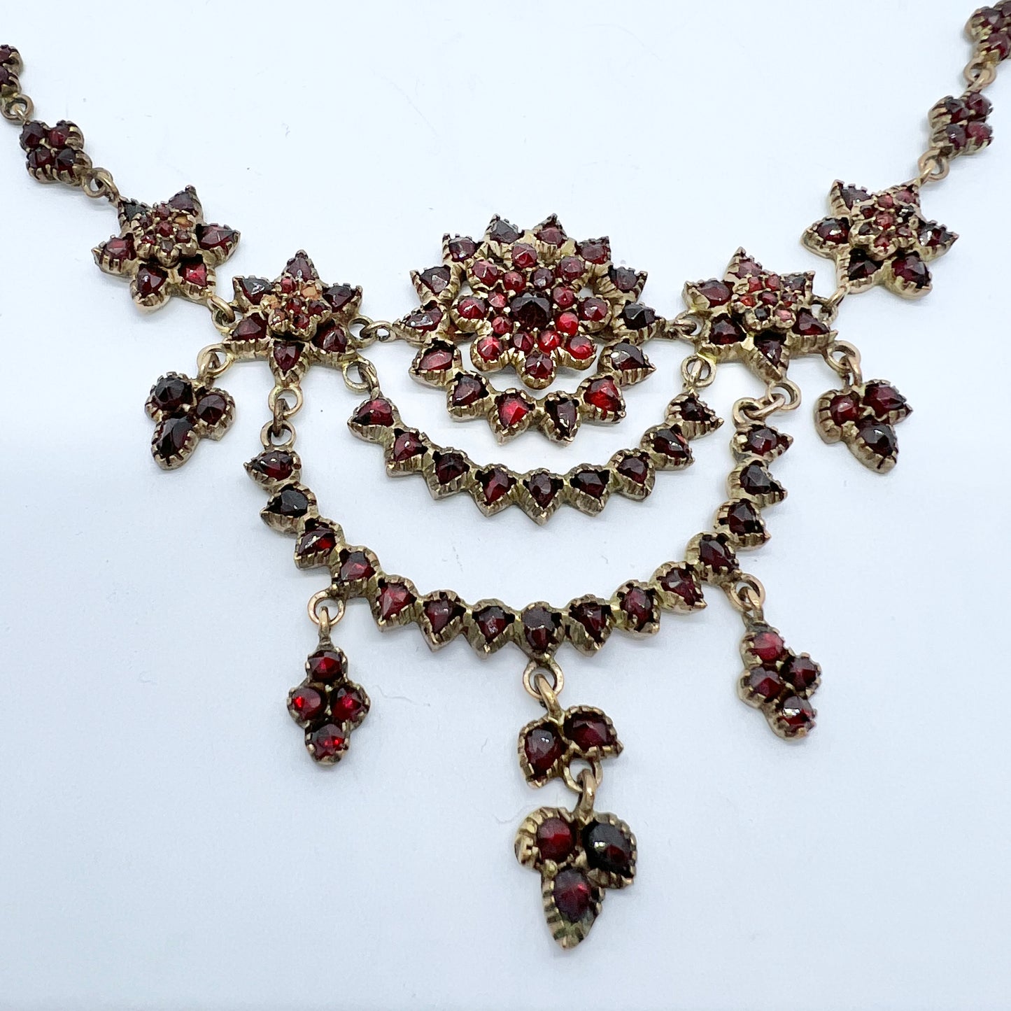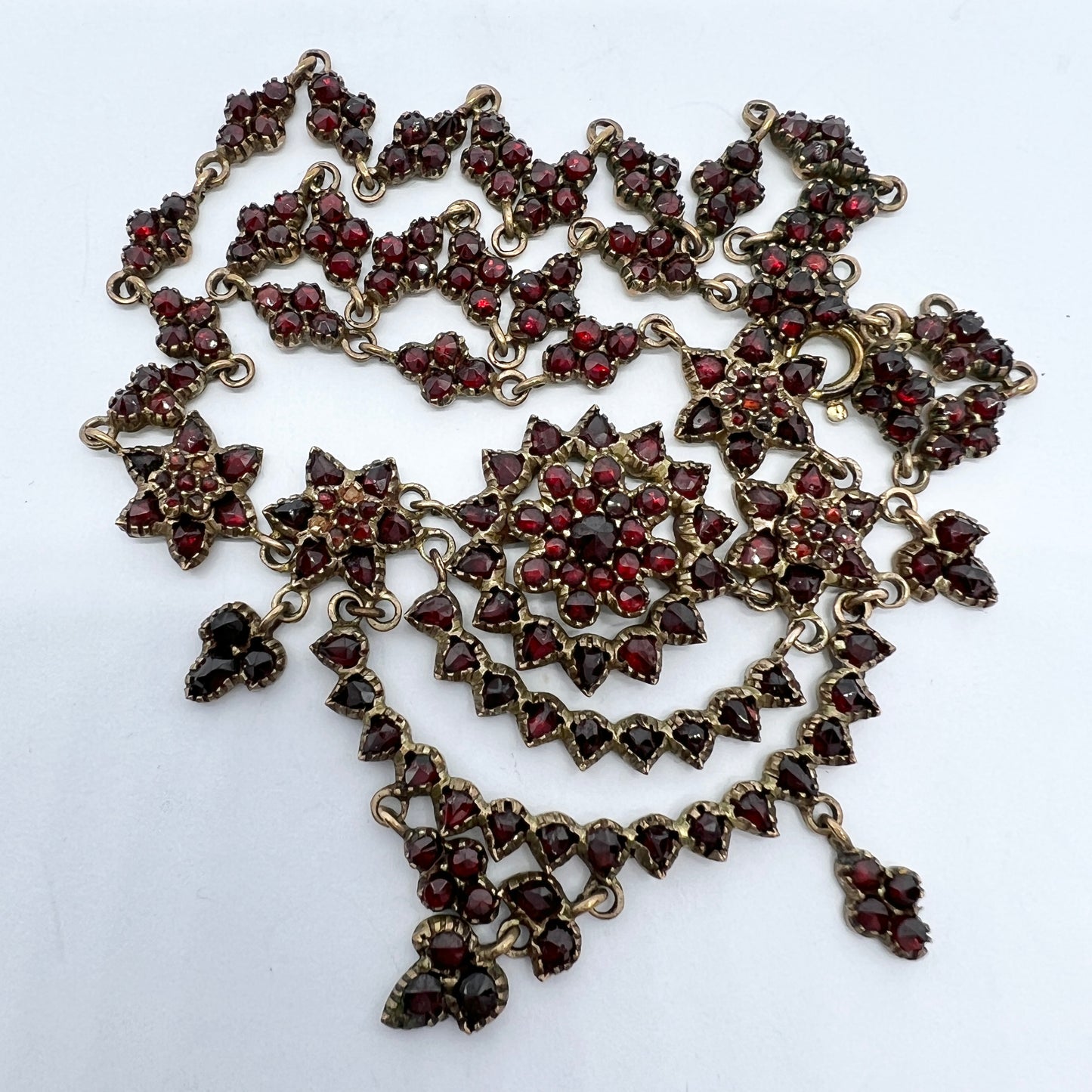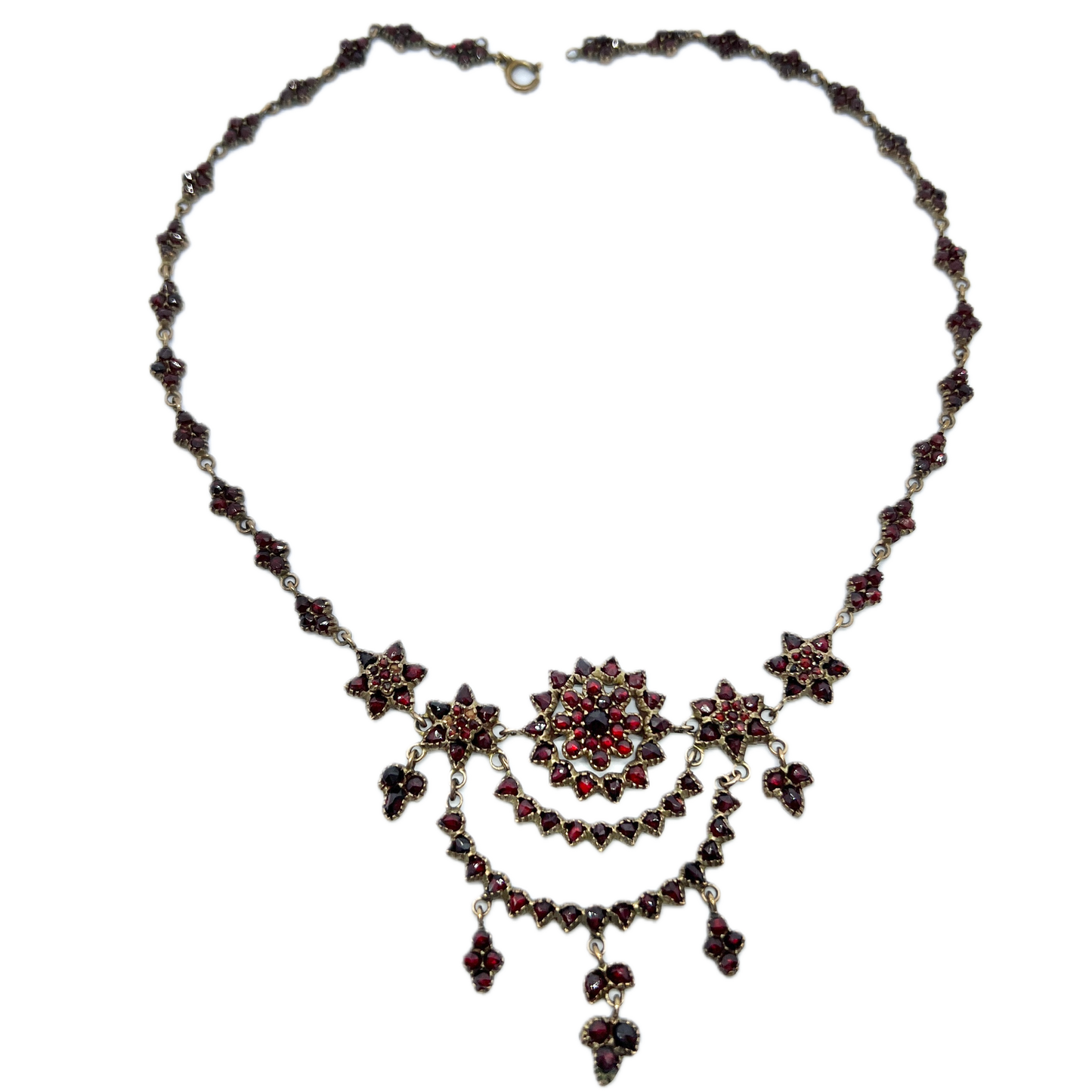 Wonderful and much sought after antique late Victorian Bohemian garnet gilt metal necklace. Continental Europe c 1890s.
