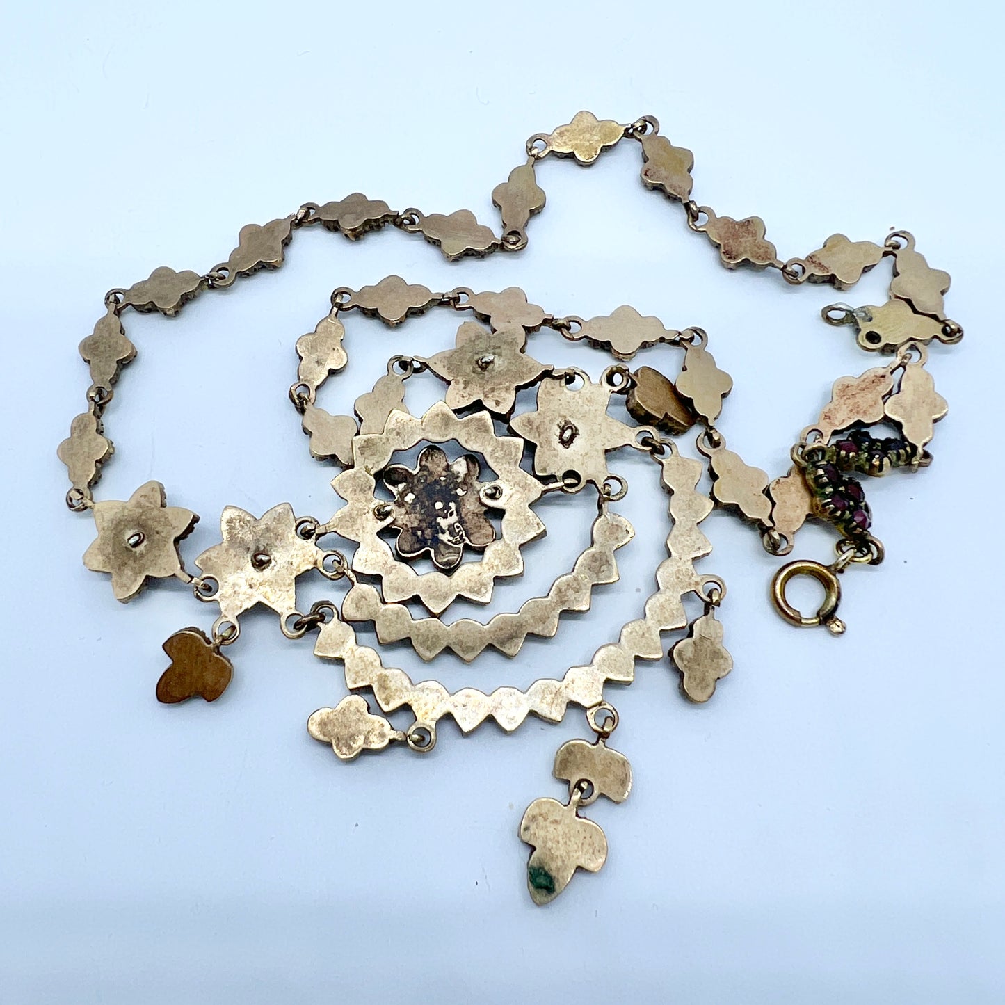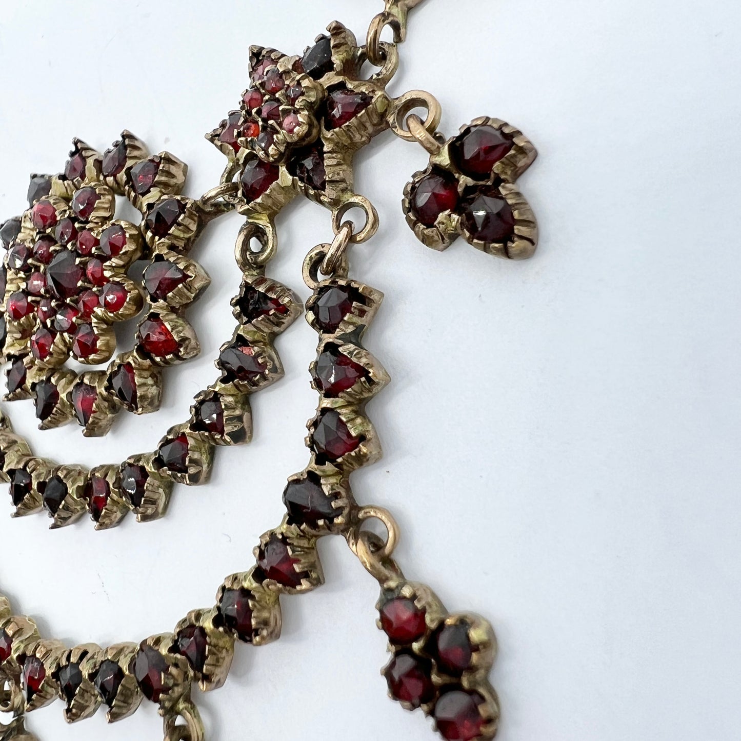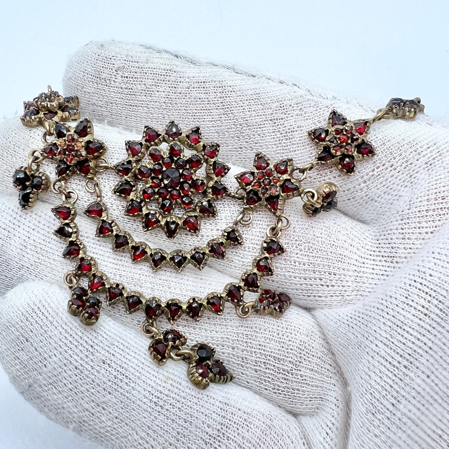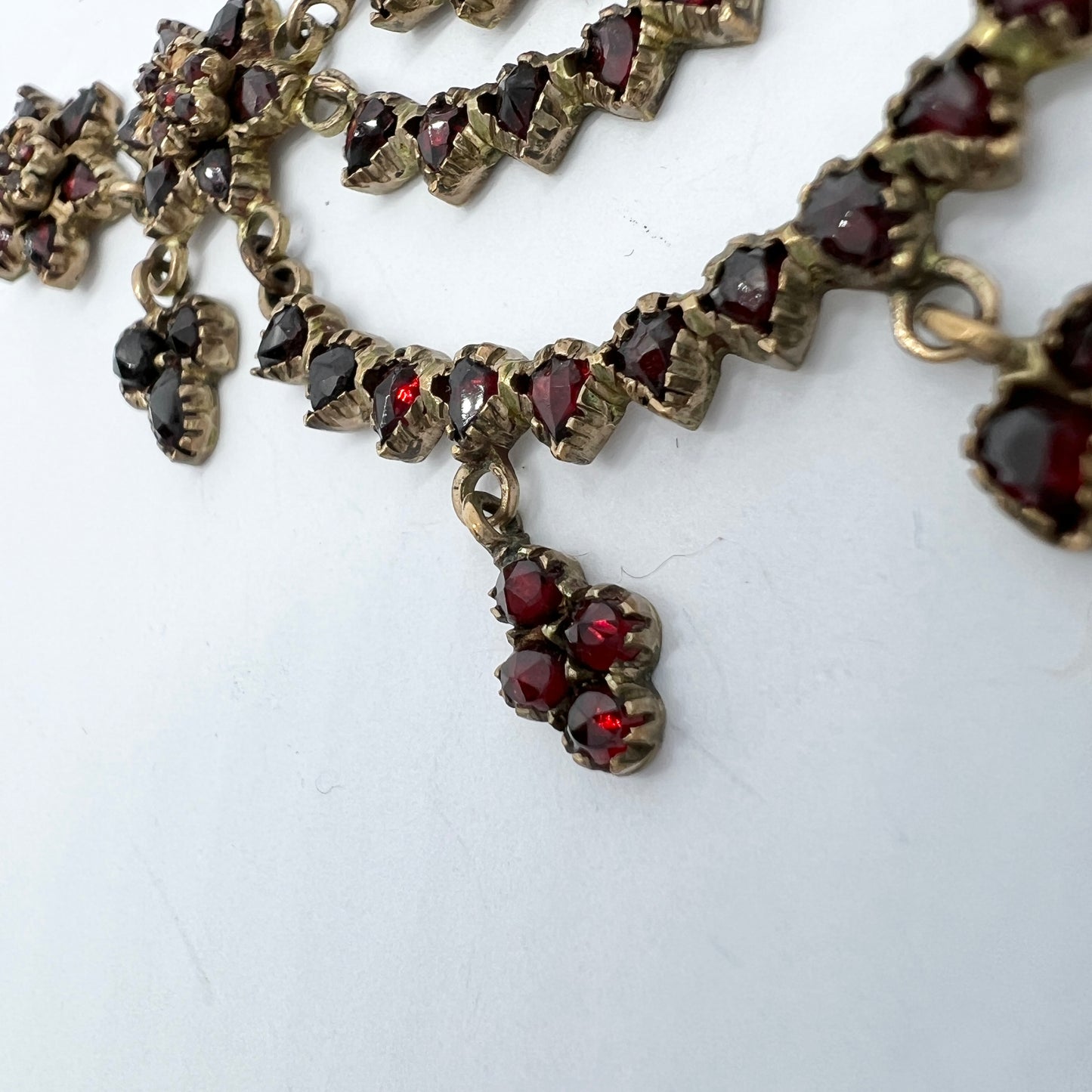 Antique late Victorian Bohemian Garnet Cluster Gilt Metal Necklace.