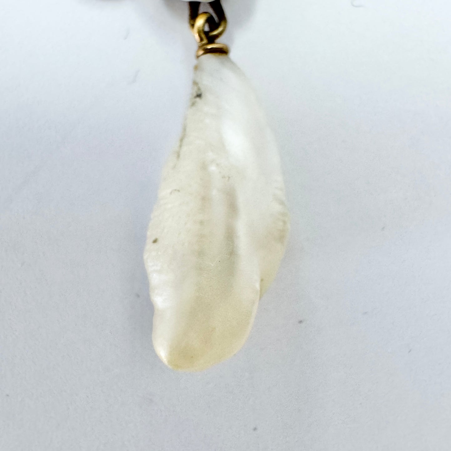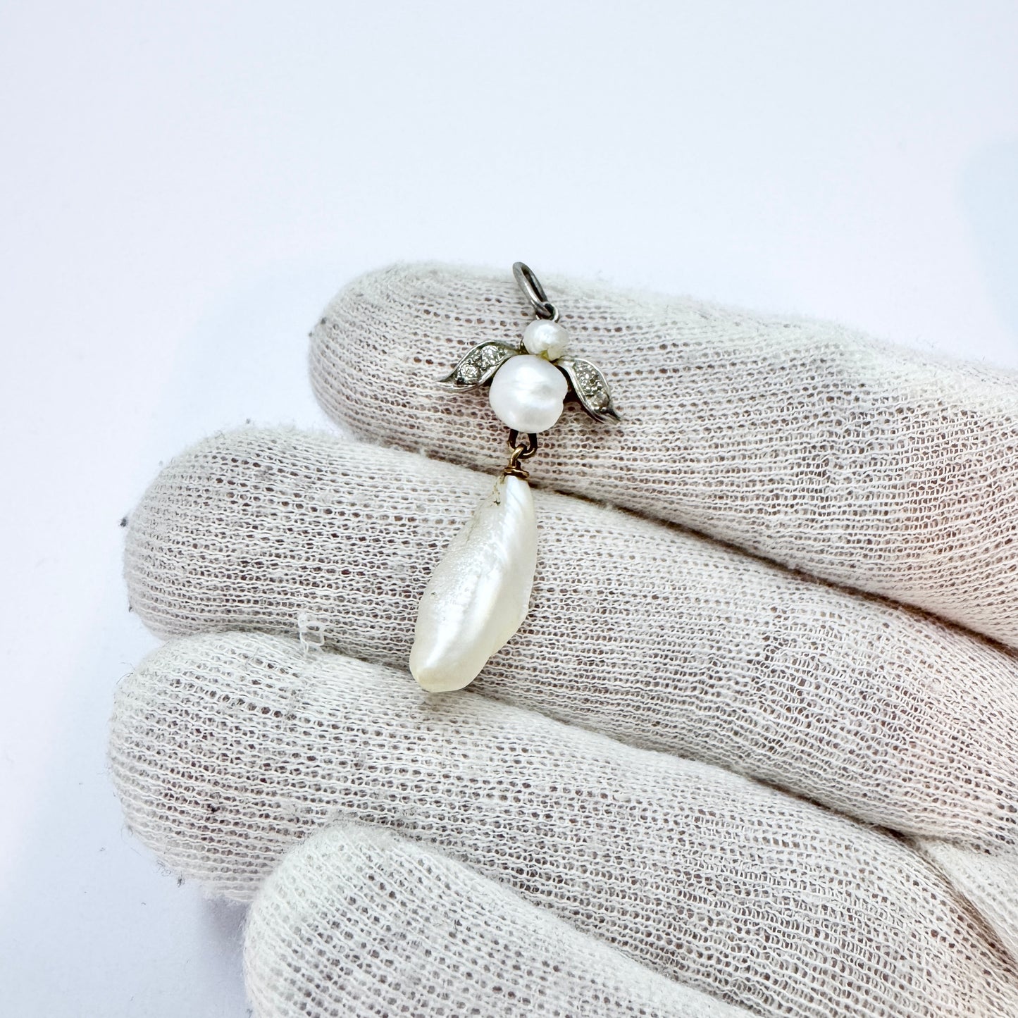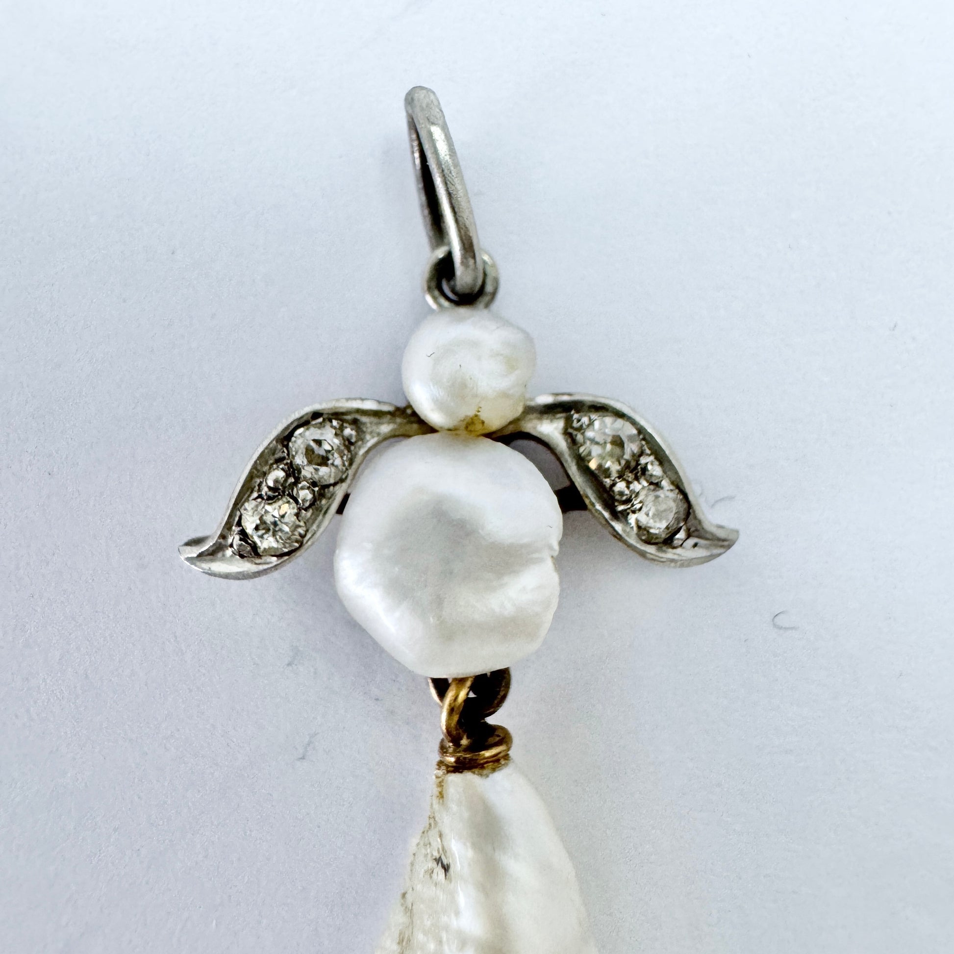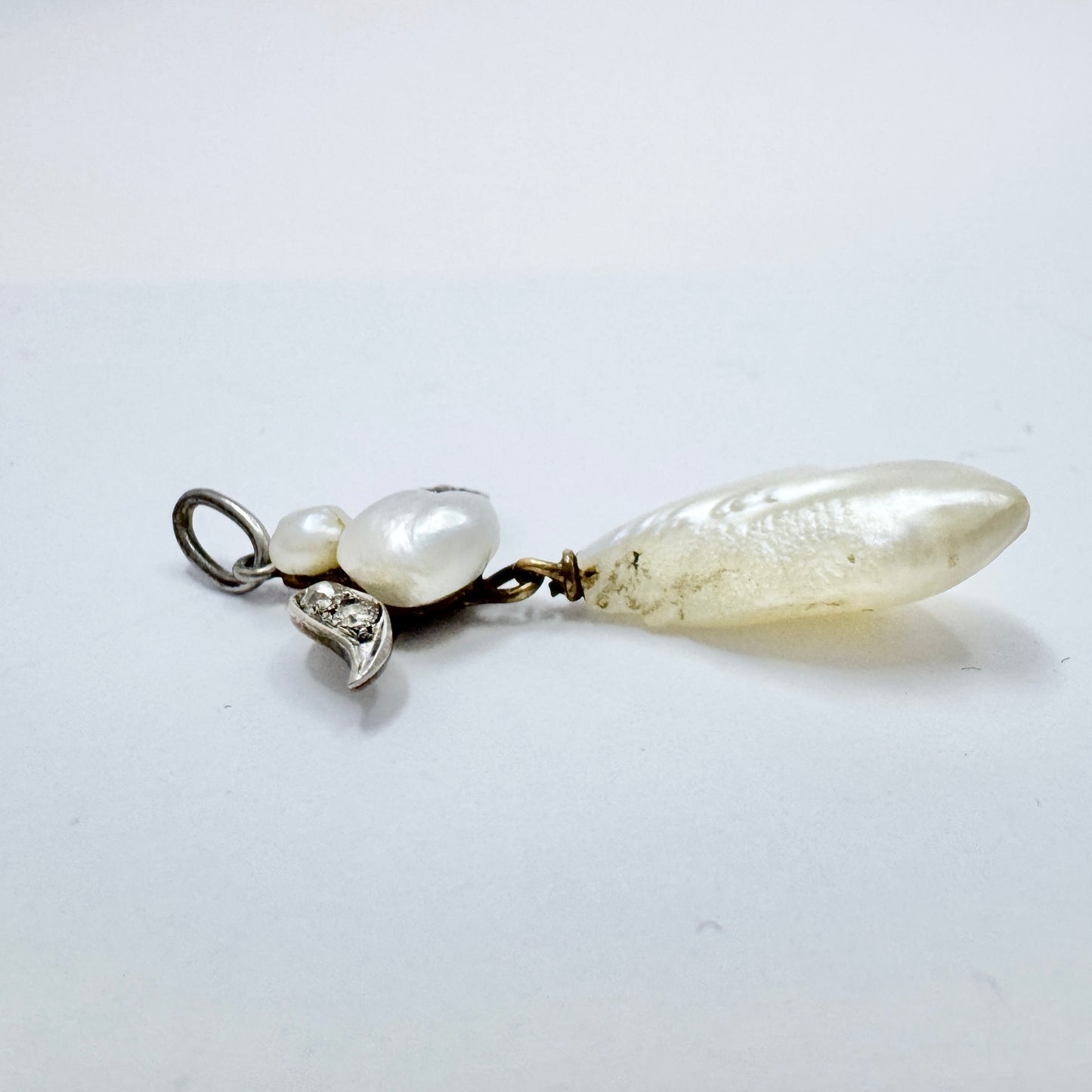 Very charming antique gilt solid silver, baroque pearl, and old cut diamonds pendant. Apparently unmarked. Ca year 1900.
