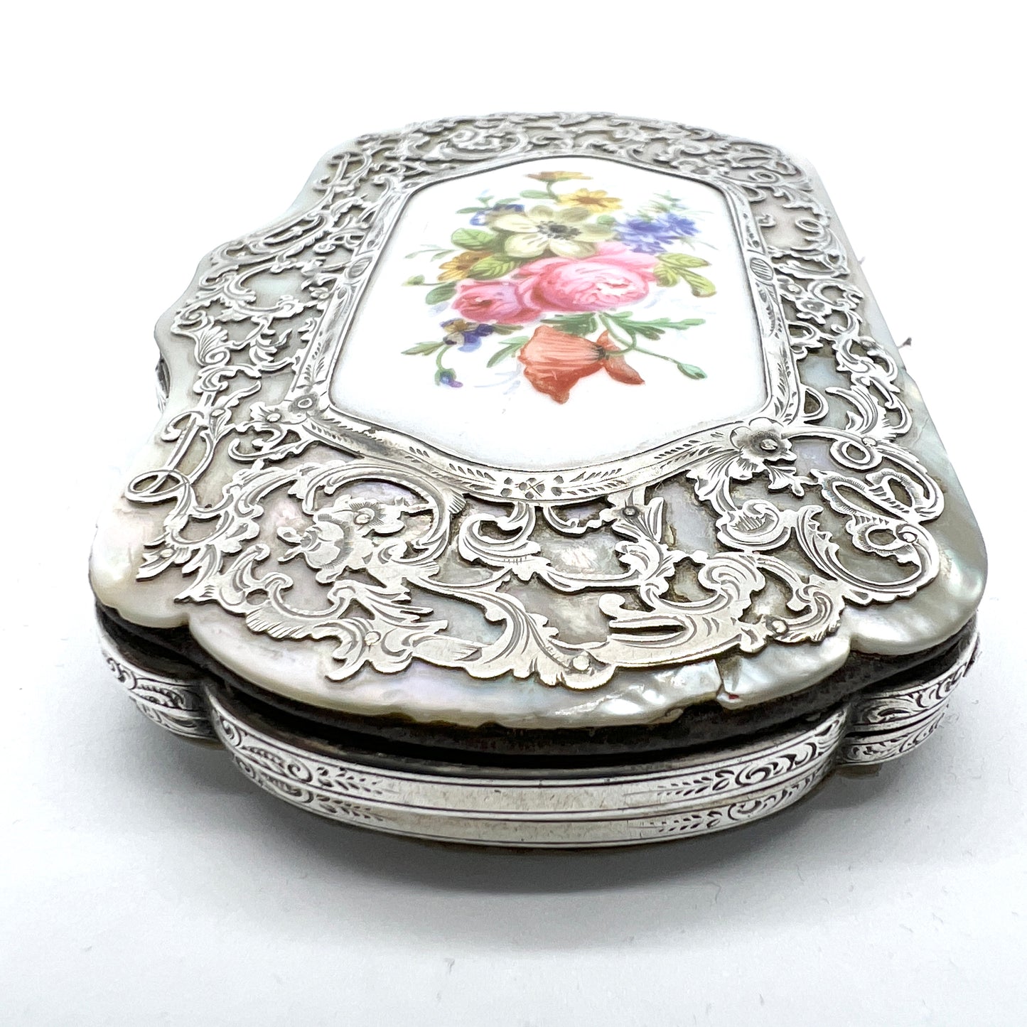 Antique sterling silver evening purse with mother of pearl panel and hand painted porcelain decoration. Made c year 1900, continental Europe.