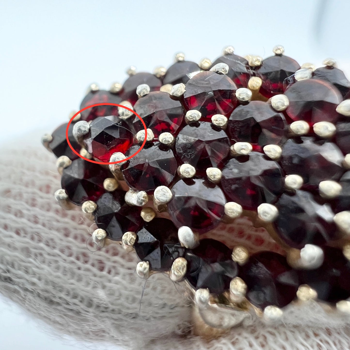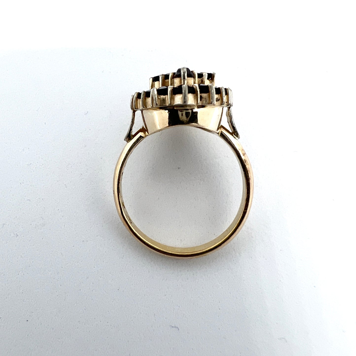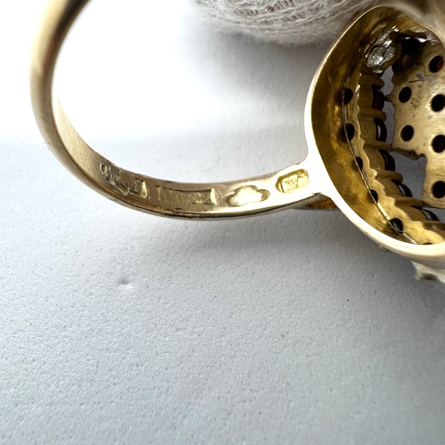 Wonderful vintage 18k gold garnet cluster ring. Hallmarked for Austria c 1930-40s and Swedish import marks. Stones set in gilt silver.