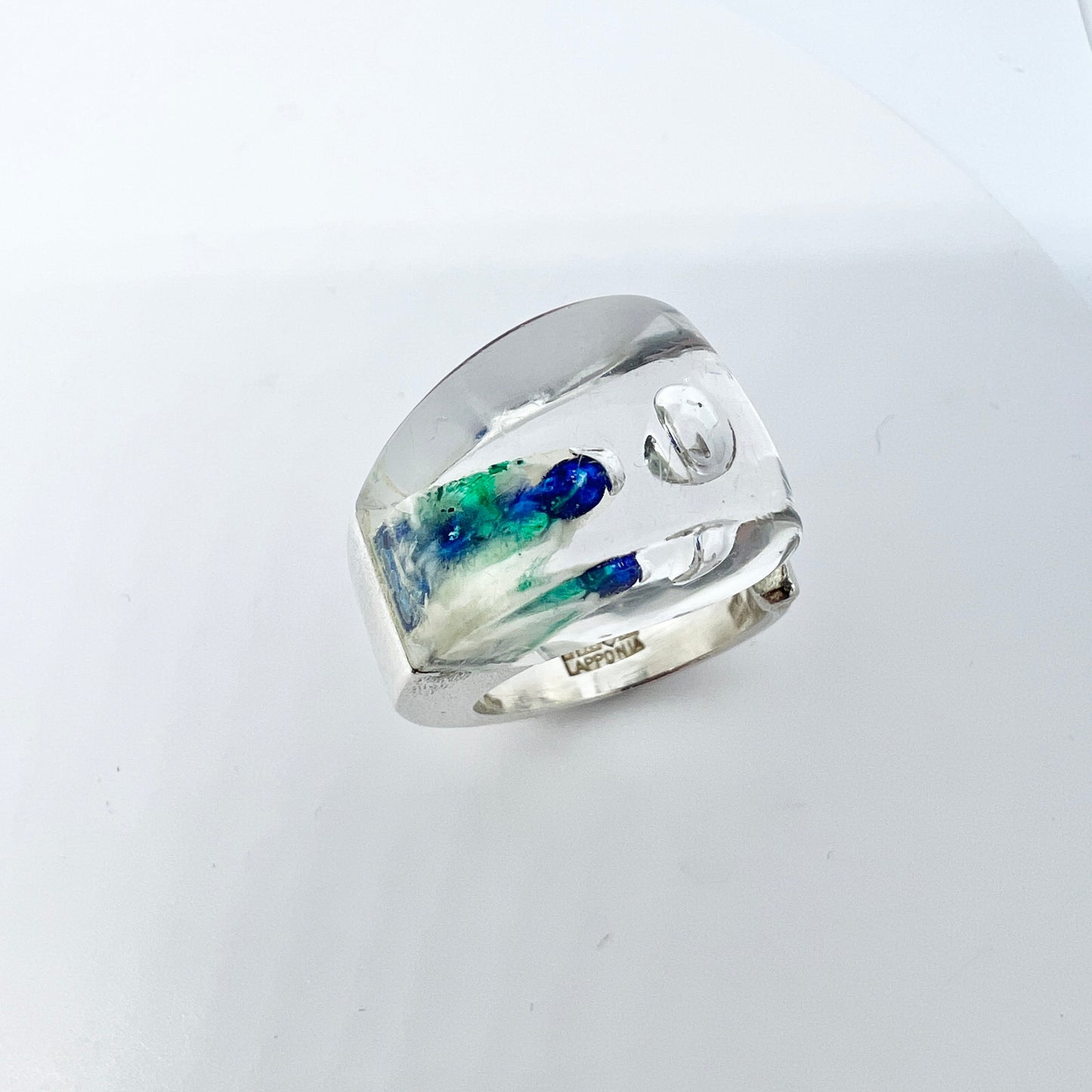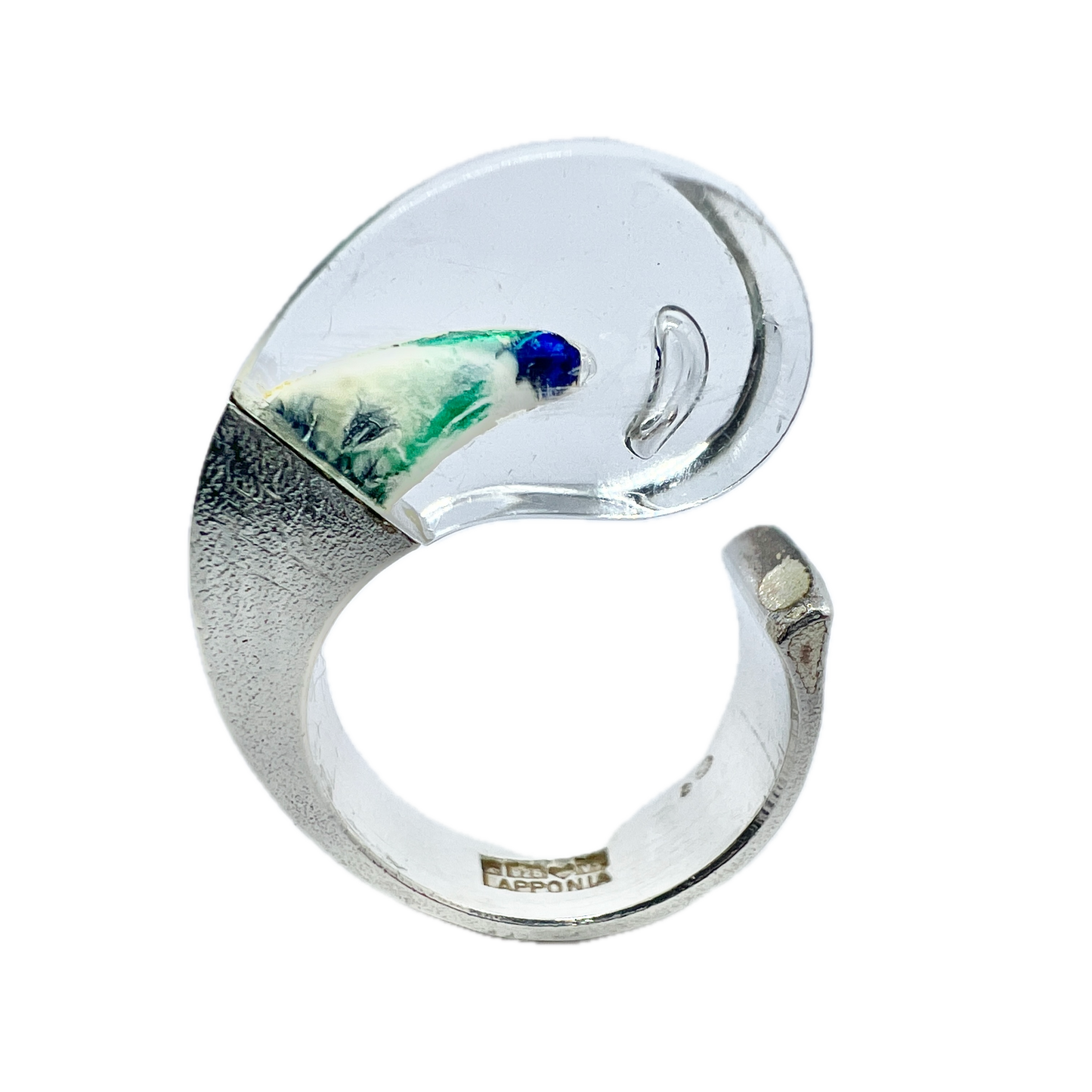 Wonderful and much sought after vintage sterling silver acrylic designer ring. Fully hallmarked for Lapponia, Finland 1974. Design "Microns" by renowned Bjorn Weckstrom.