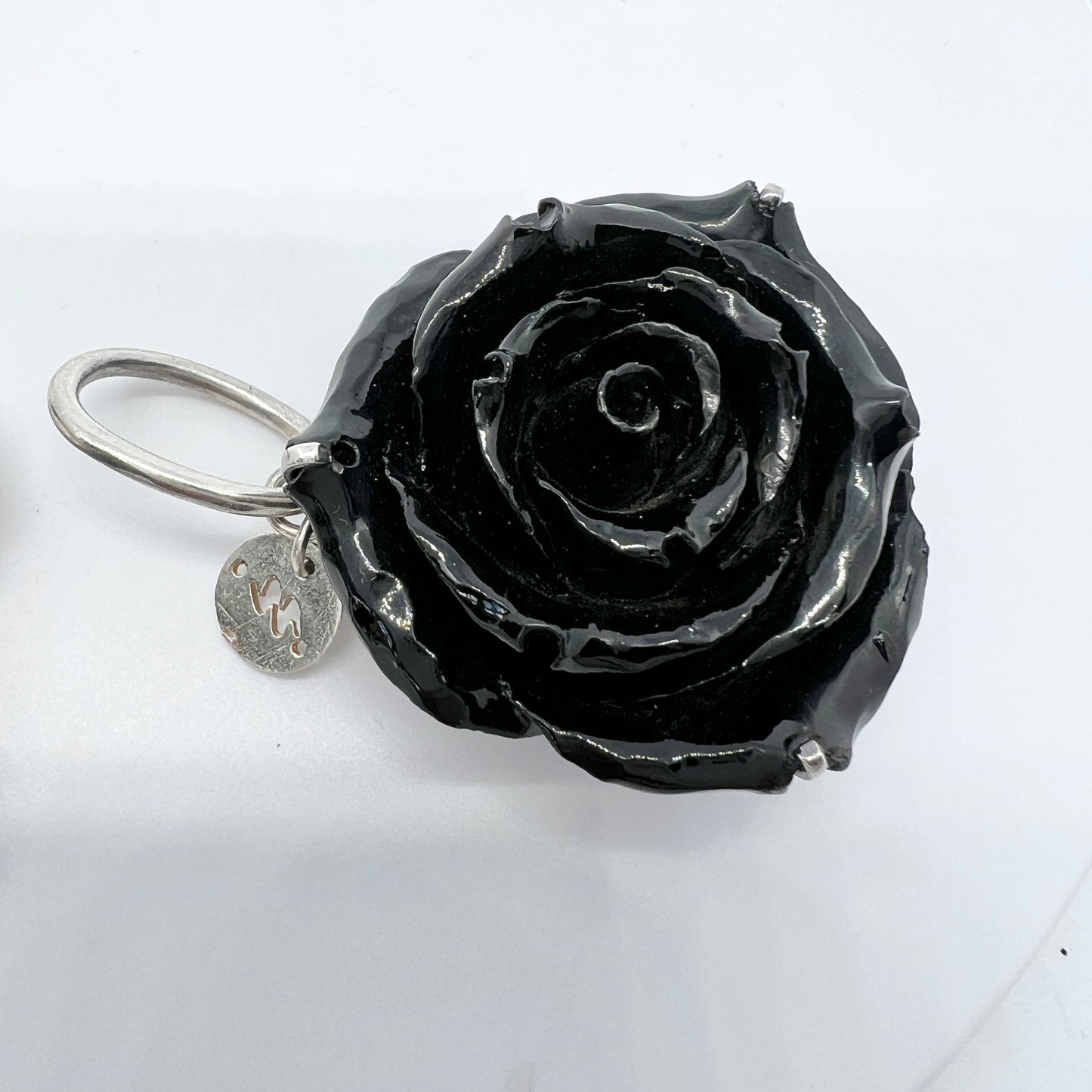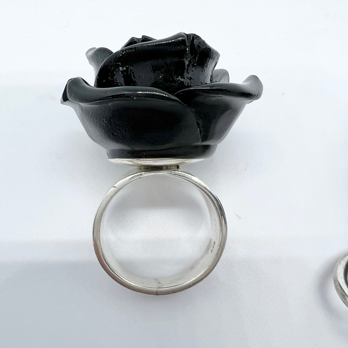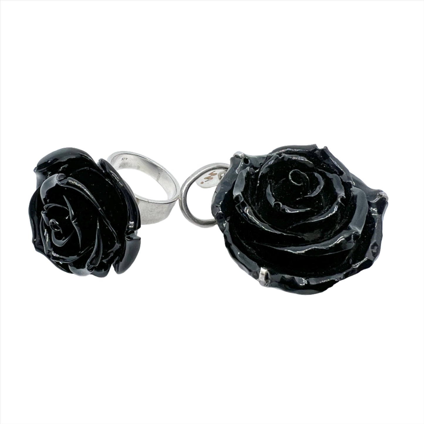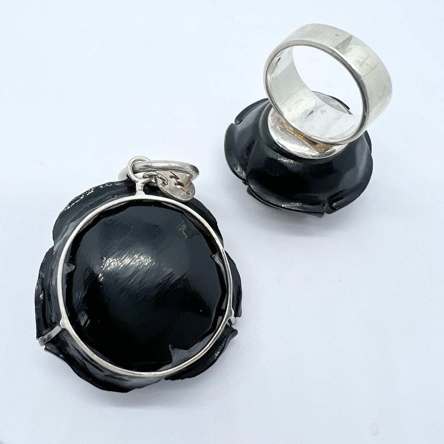 Bold Sterling Silver Plastic Black Rose Ring + Pendant.
