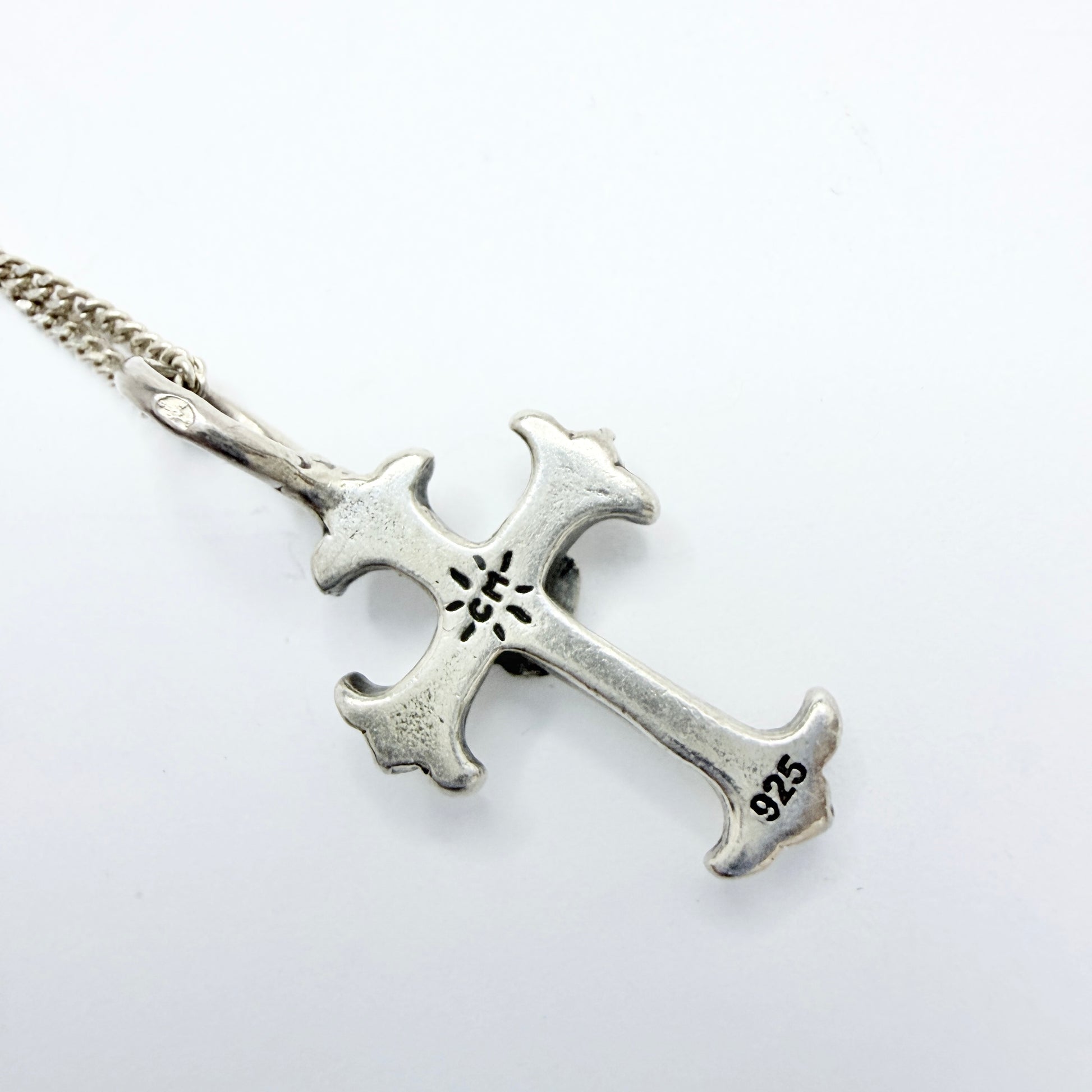 Wonderful and rare. Sterling Silver diamond cross pendant. Pendant hallmarked for renowned Catherine Michiels. Chain hallmarked for sterling silver.