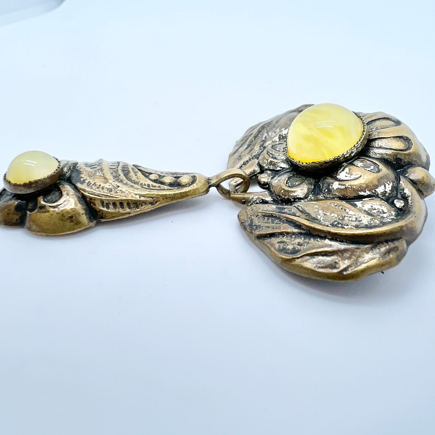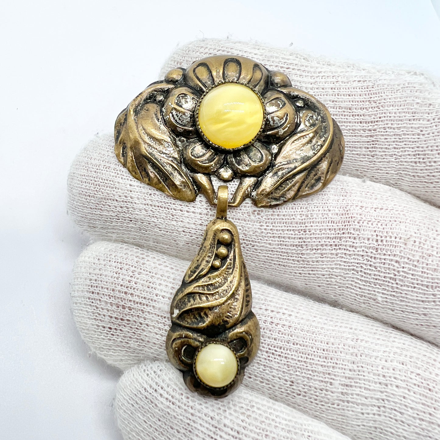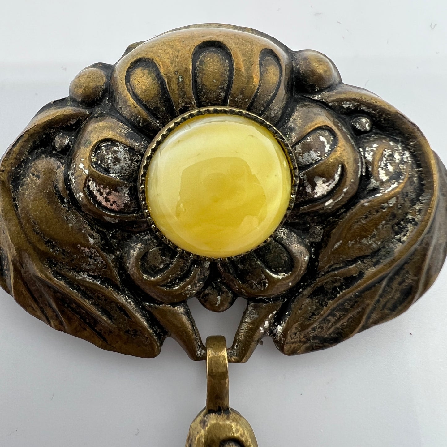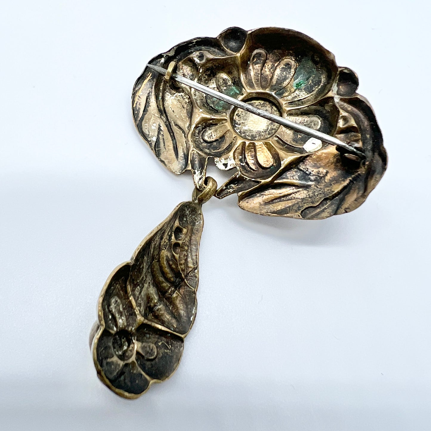 Charming antique copper glass stone art nouveau skonvirke brooch. Made in Denmark c 1910s.