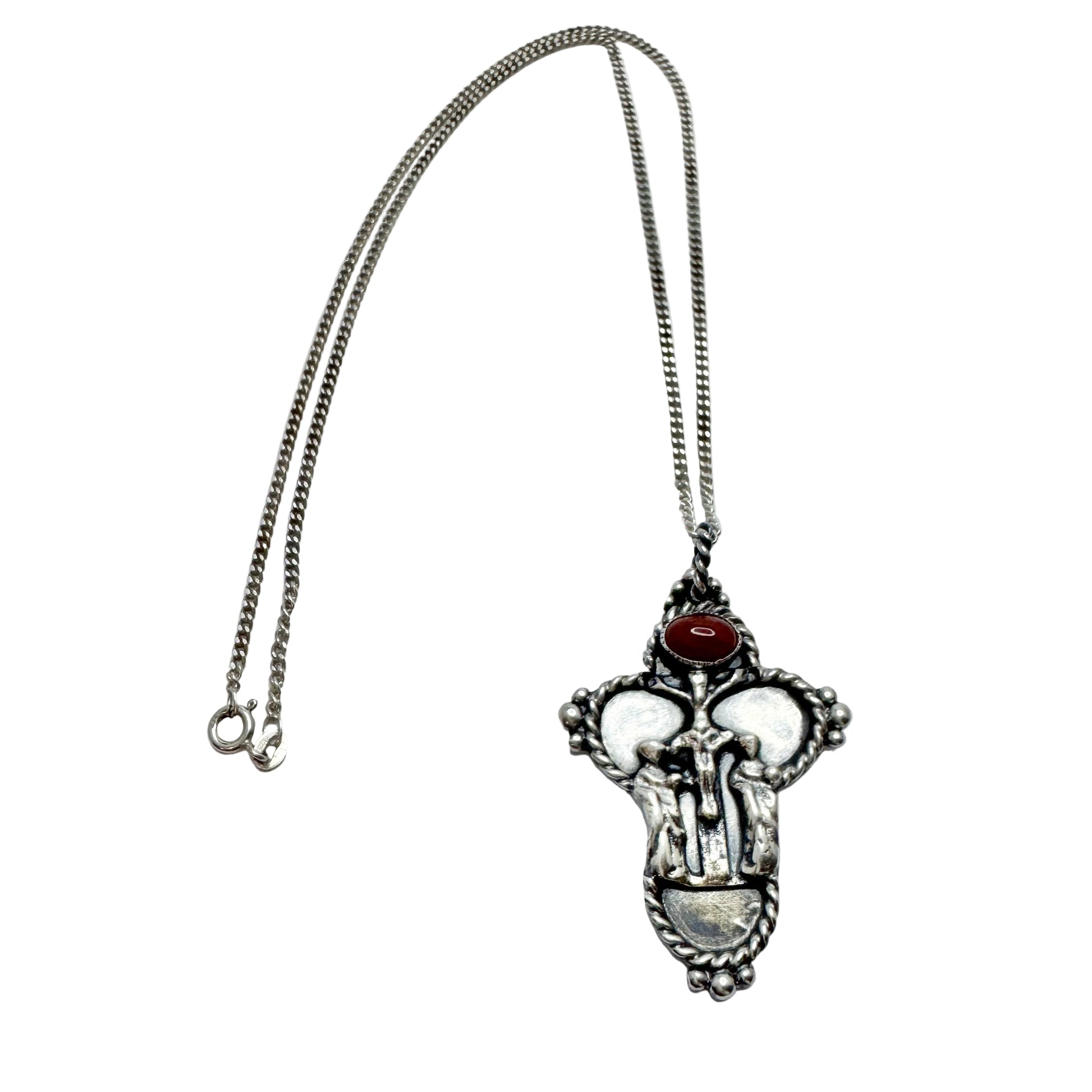 Denmark. Vintage Solid Silver Carnelian Crucifix Pendant Necklace.