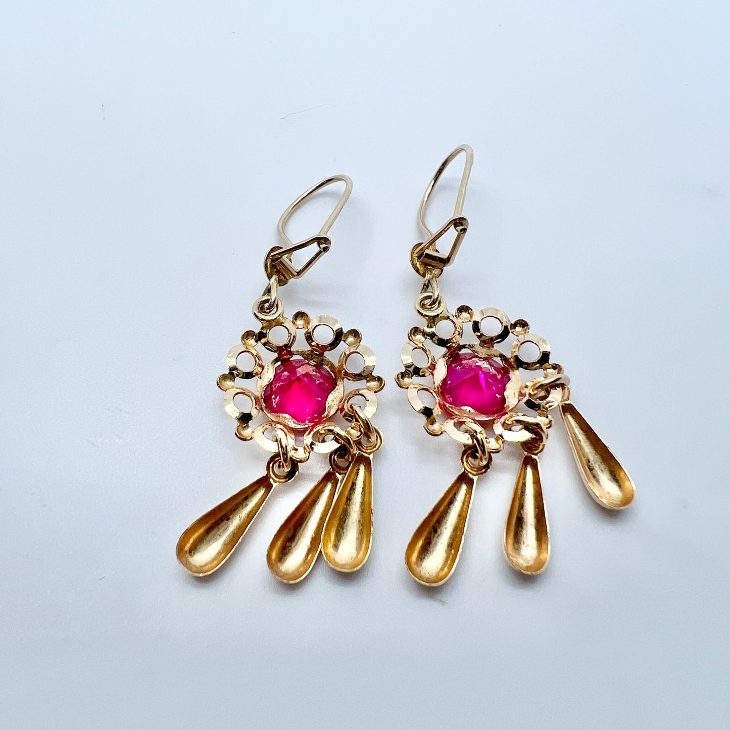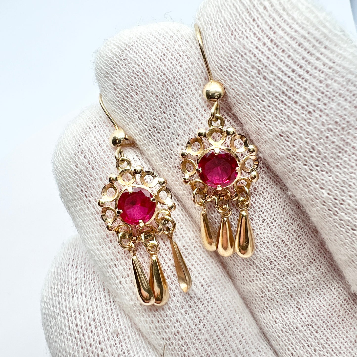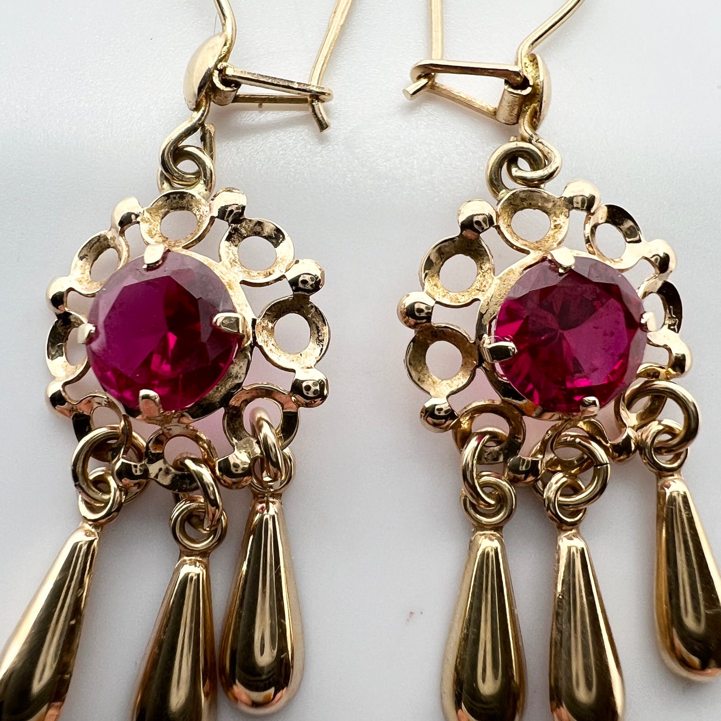 Very charming vintage 14k gold synthetic sapphire earrings. Hallmarked for 14k gold (585) and unidentified makers mark (AP). Eastern Europe, vintage.
