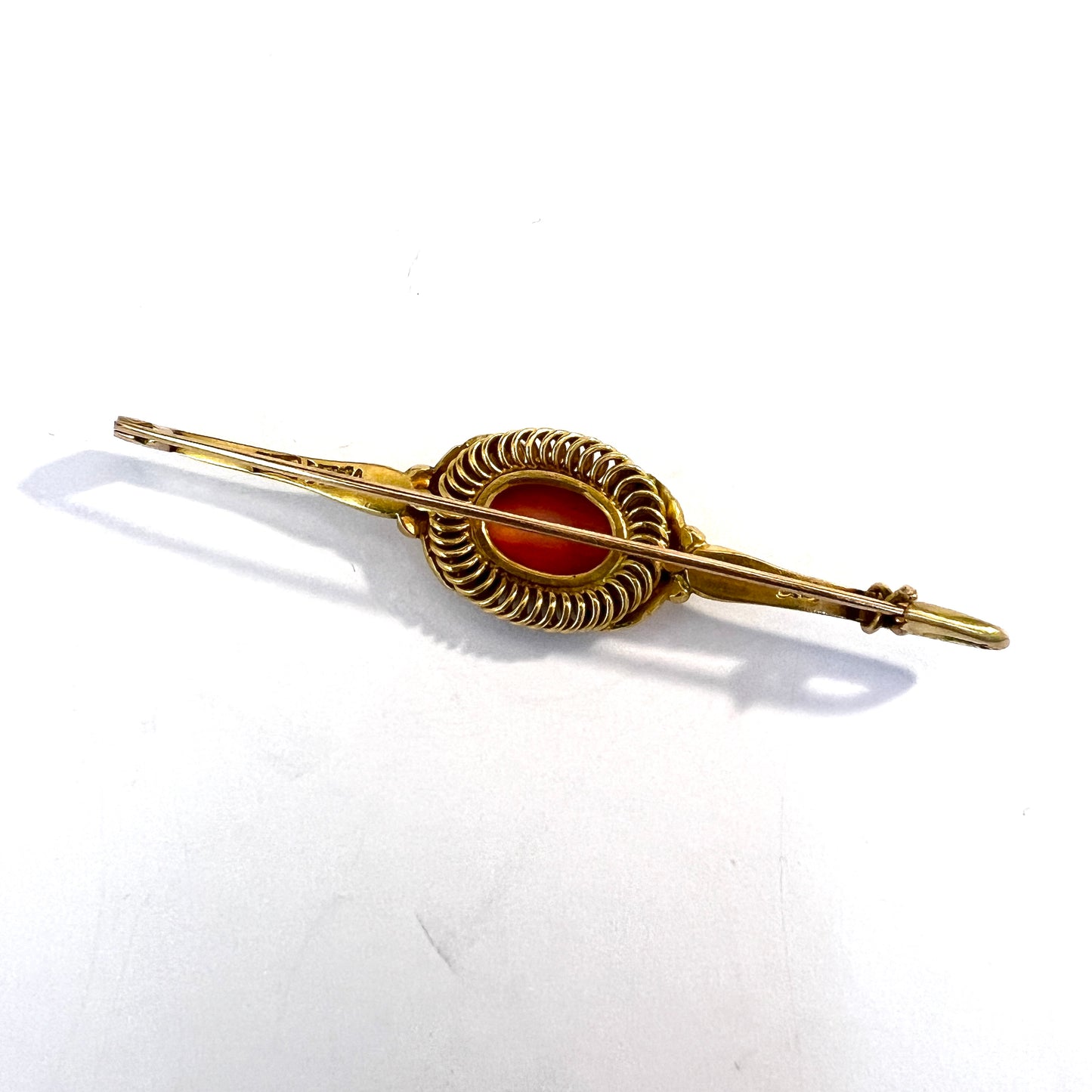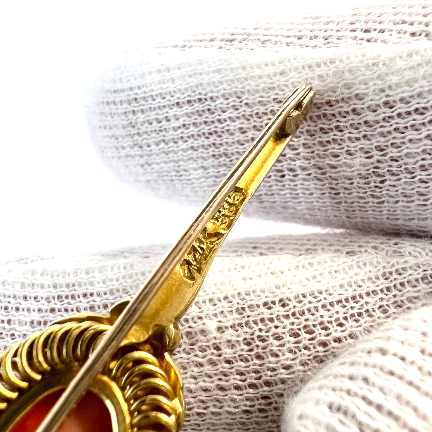 Wonderful antique art nouveau 14k gold coral pin brooch. Fully hallmarked for 14k Gold, renowned Evald Nielsen, Denmark c 1915.