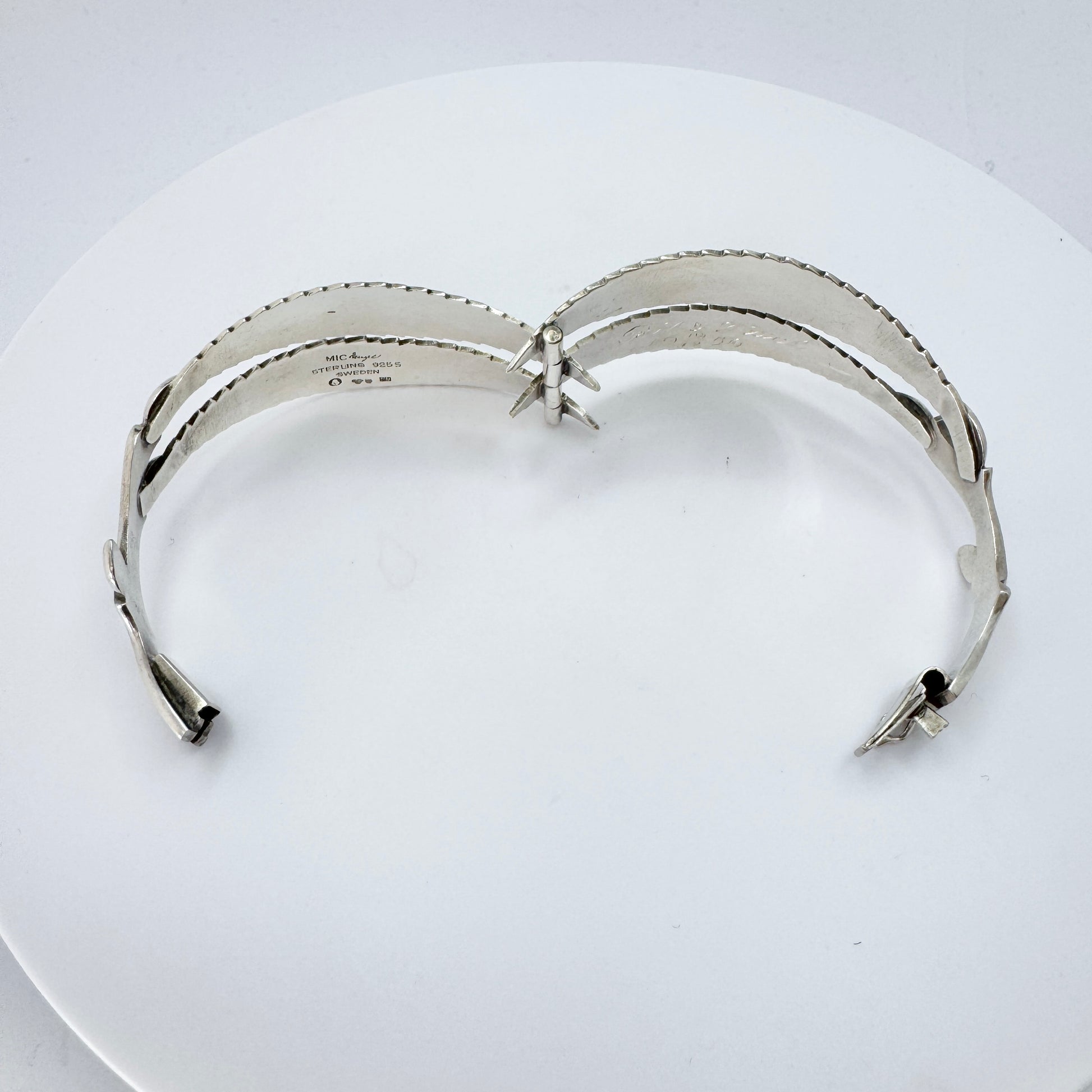 Wonderful and much sought after vintage sterling silver hinged bracelet. Fully hallmarked and signed for Gertrud Engel for Michelsen, Sweden year 1956.