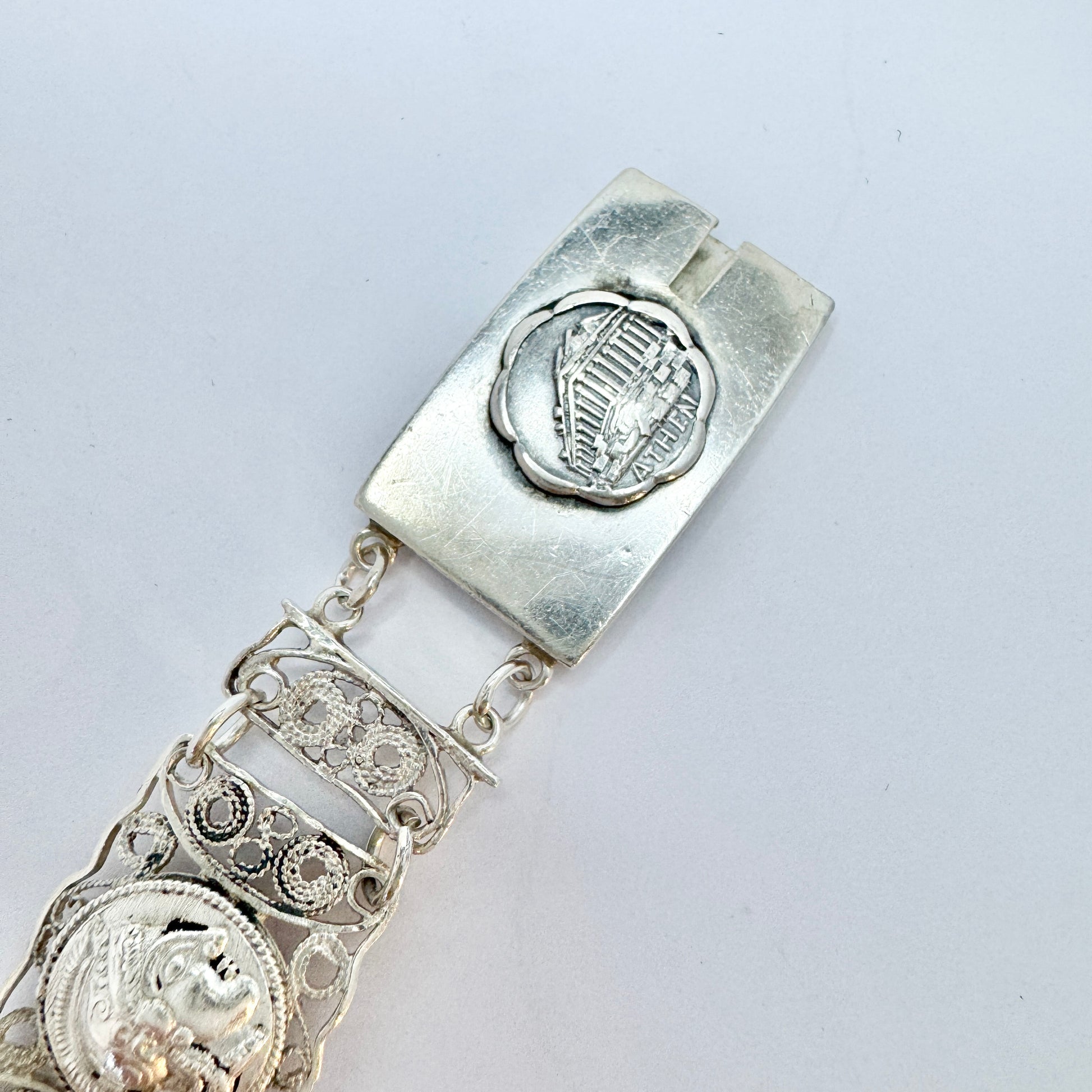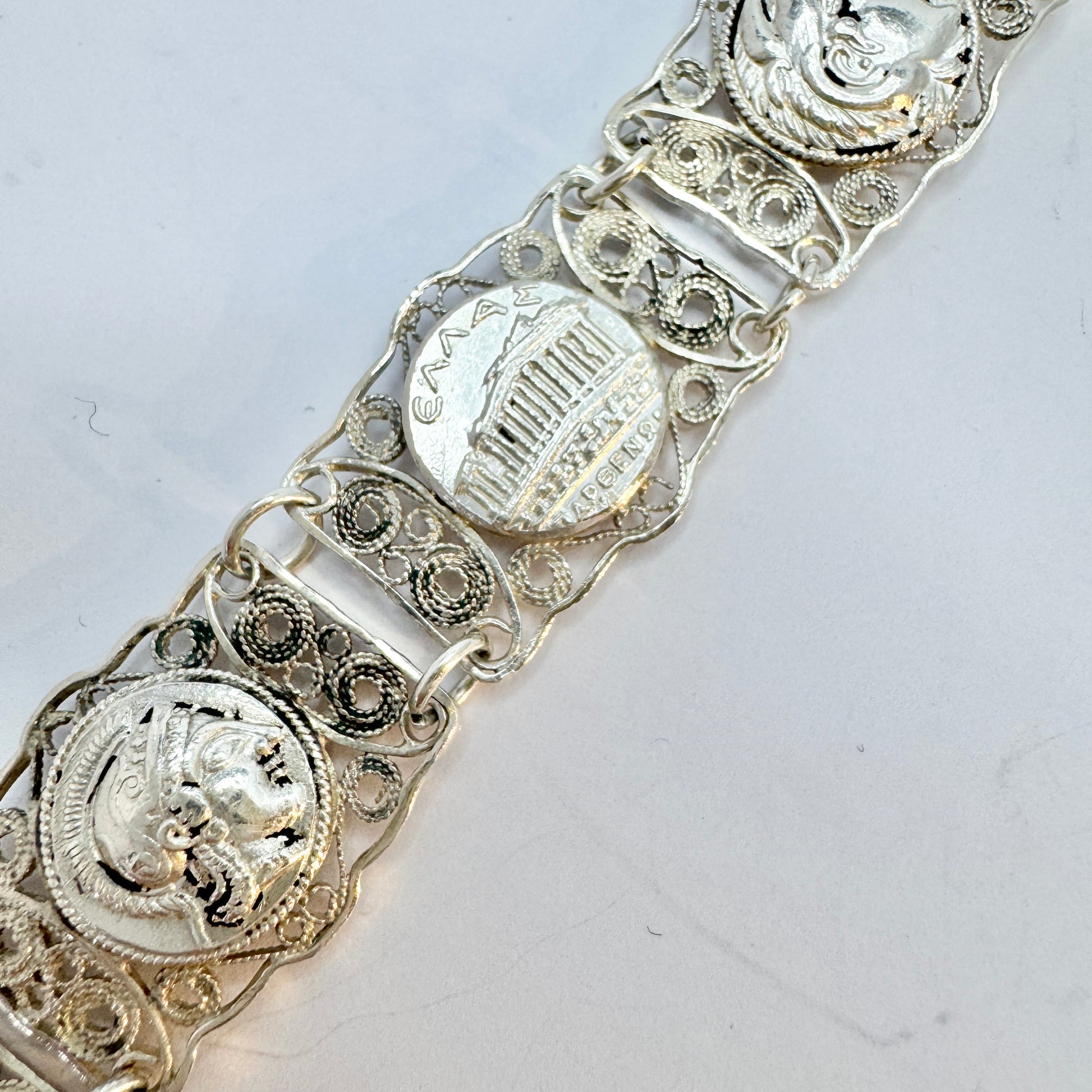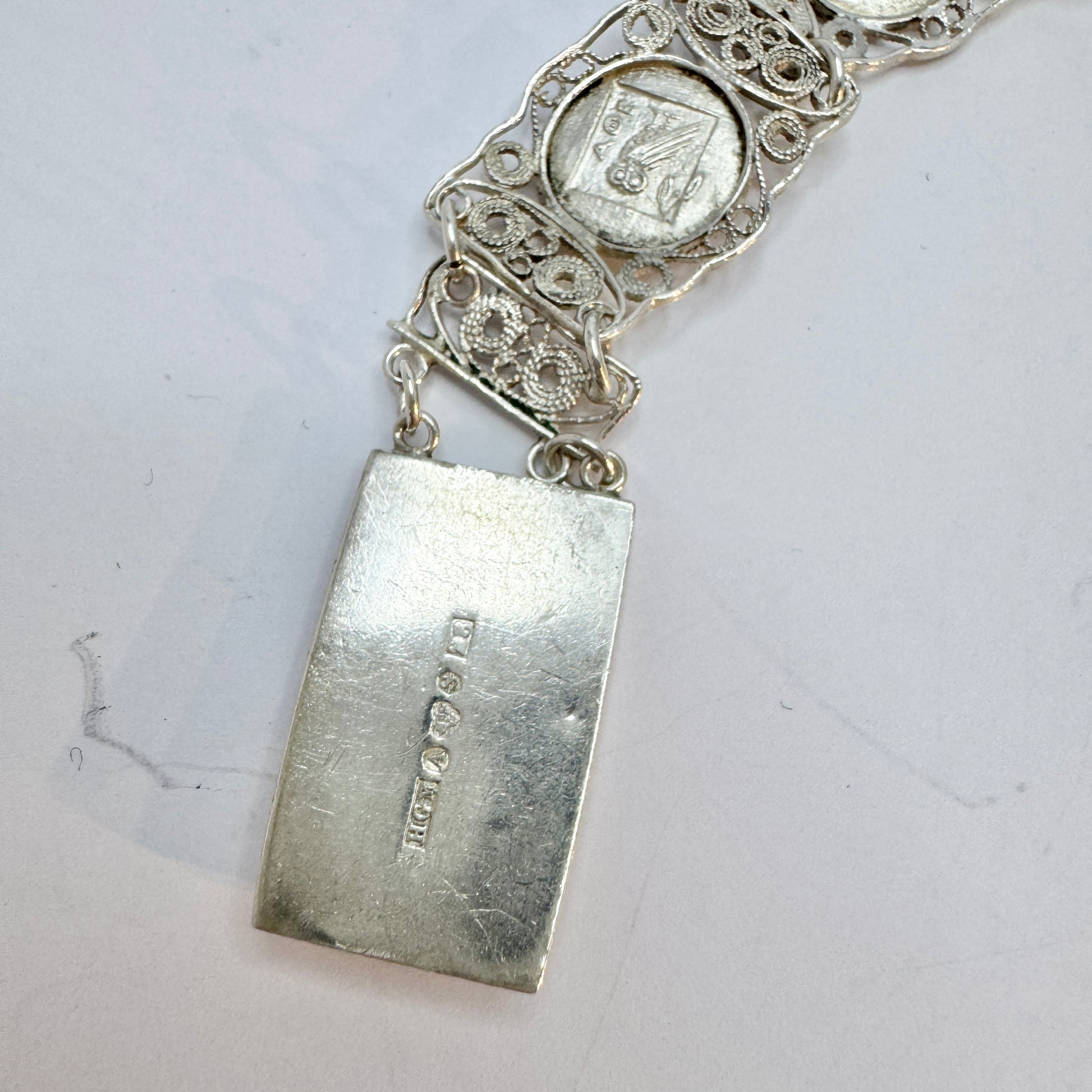 Wonderful vintage sterling (partly in 100%) silver panel bracelet. Panels motifs from Greece. Clasp also hallmarked for Swedish import year 1950.