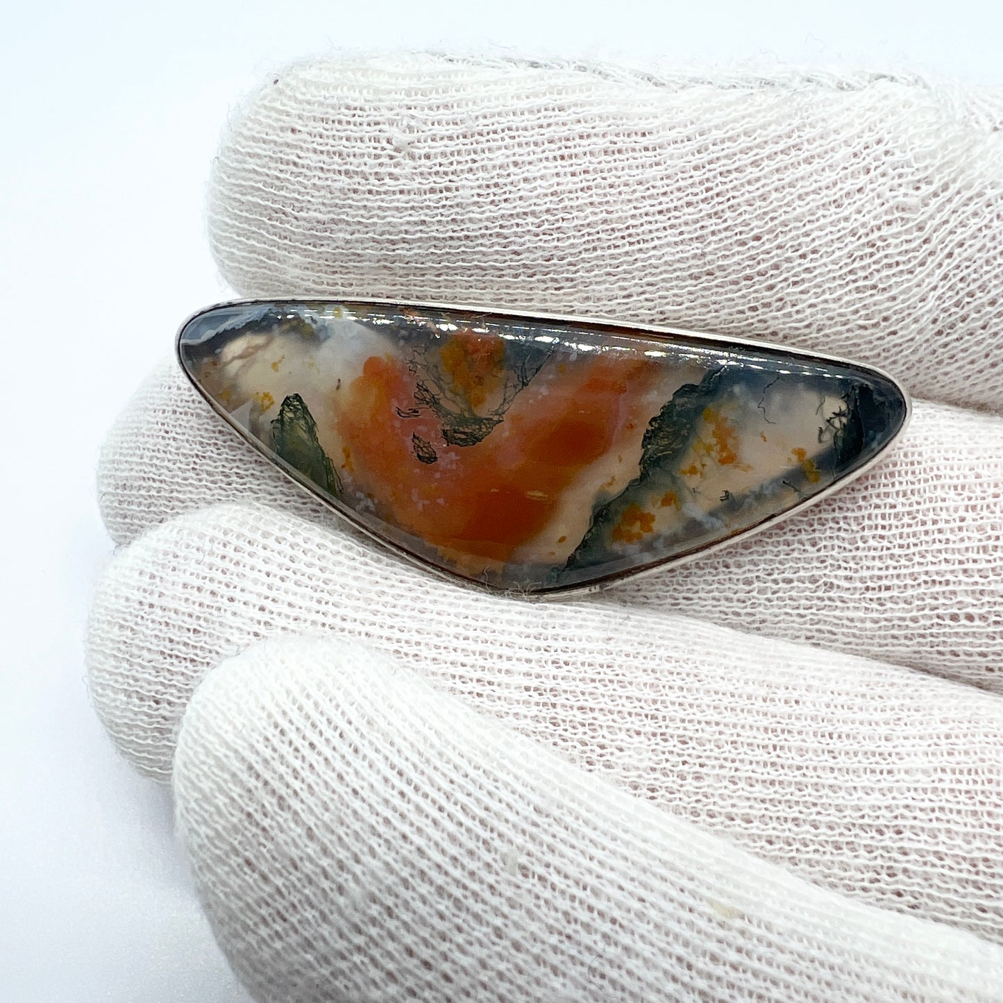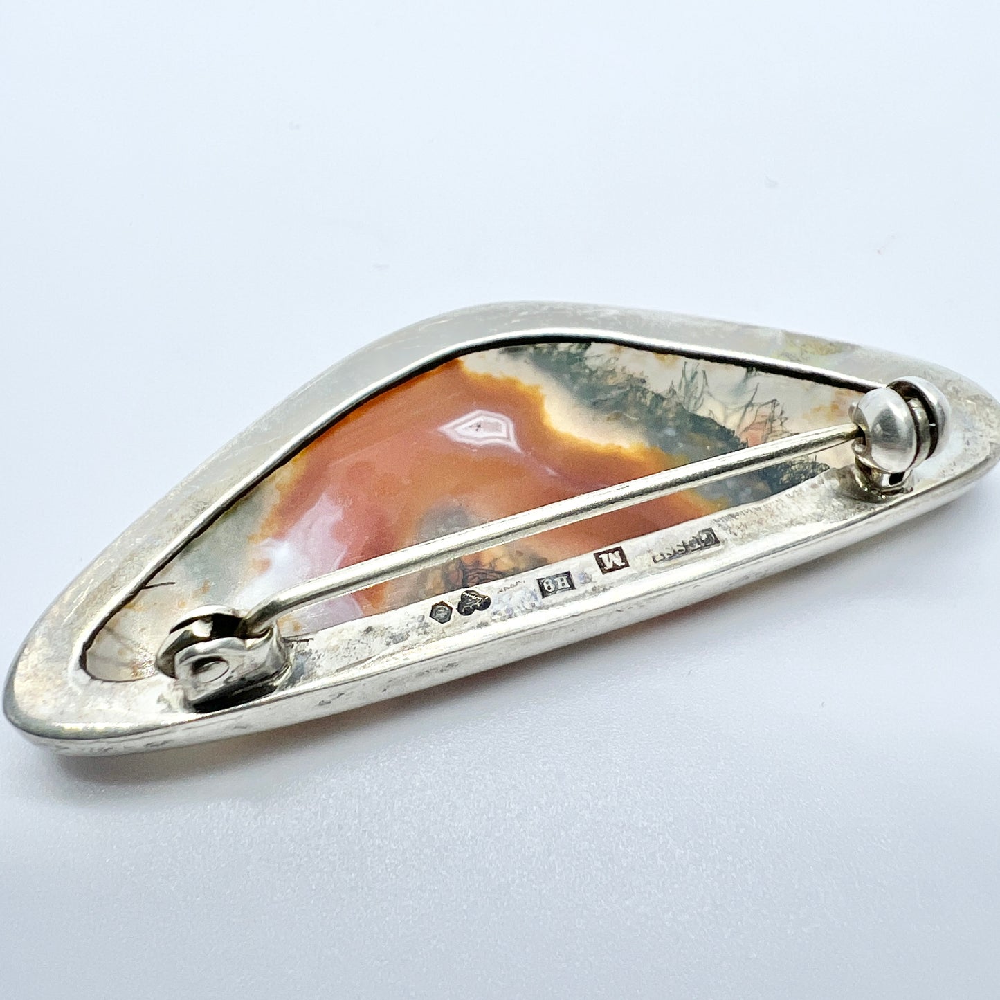 Very charming vintage sterling silver moss agate brooch. Fully hallmarked for sought after GUSSI, Sweden year 1958.