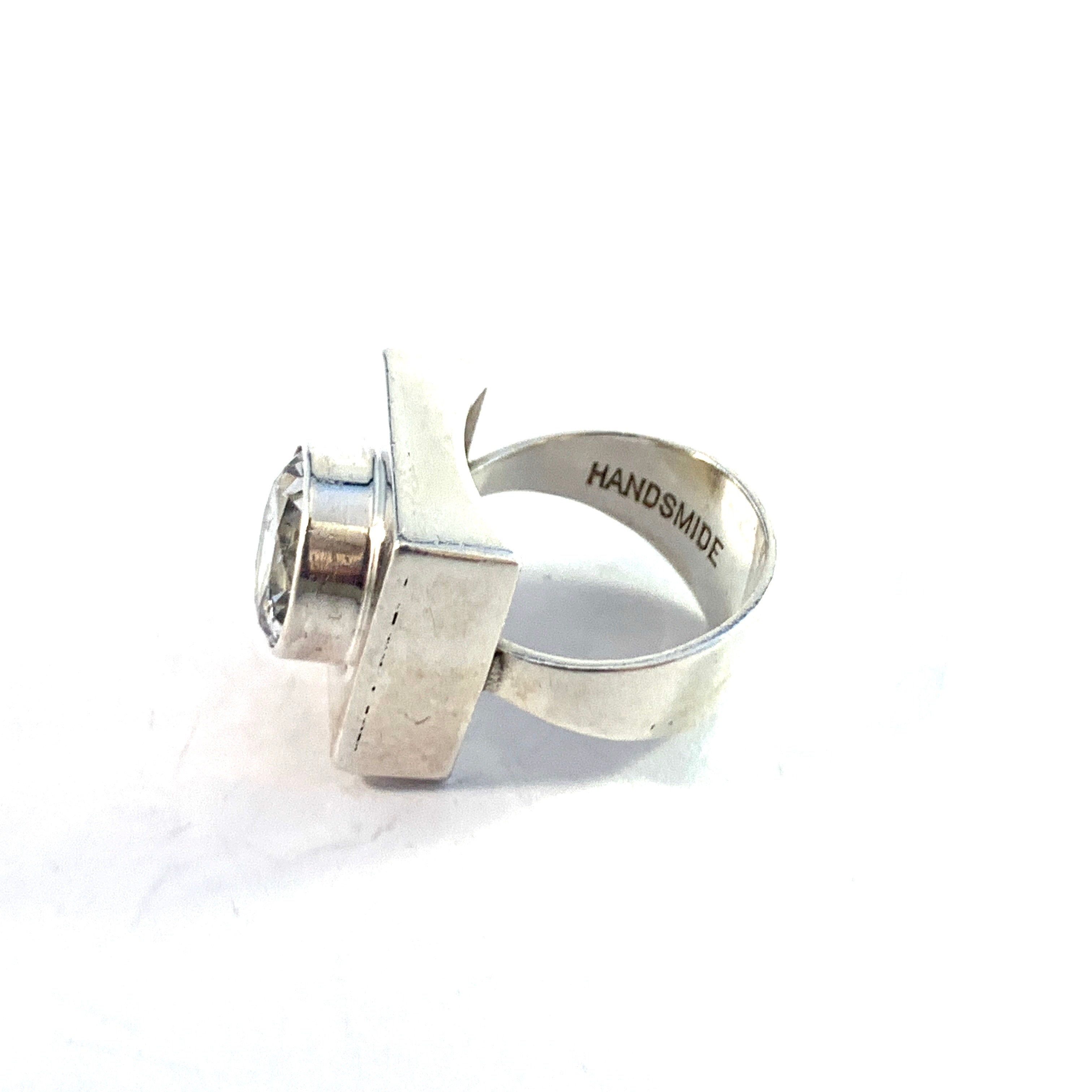Beautiful vintage modernist sterling silver rock crystal pinky ring. Fully hallmarked for sought after GUSSI, Sweden 1965. Also marked "handsmide" = Hand wrought.
