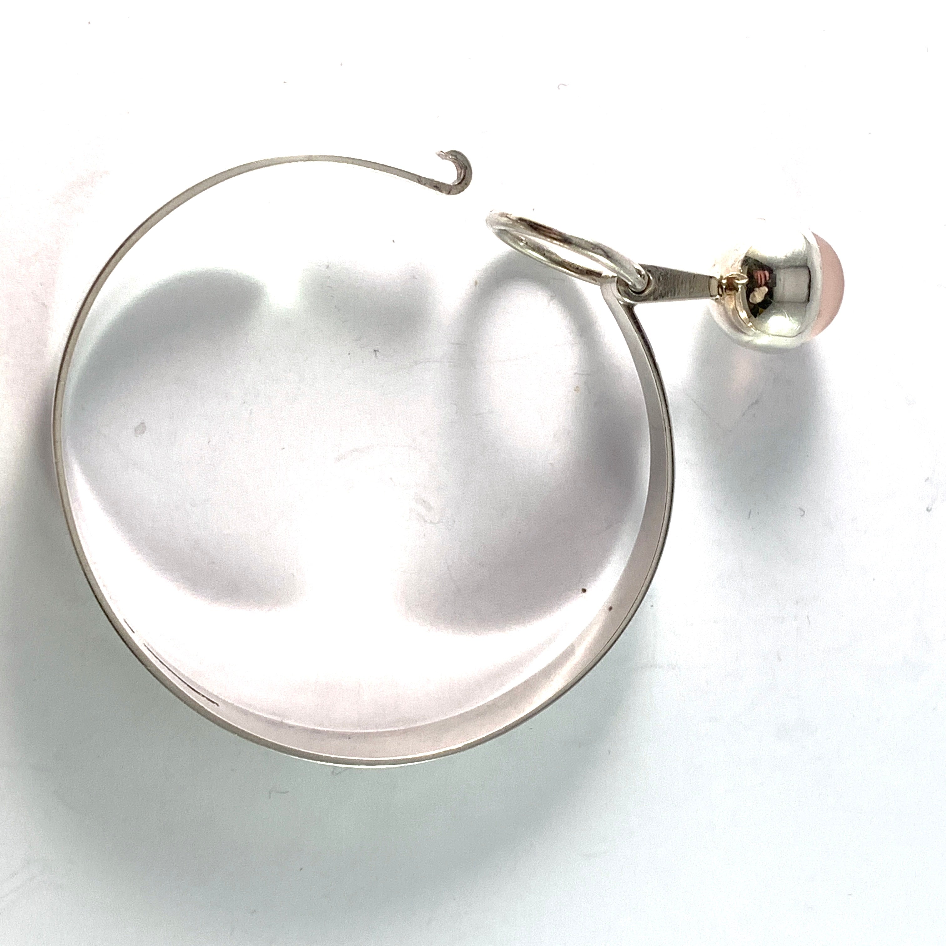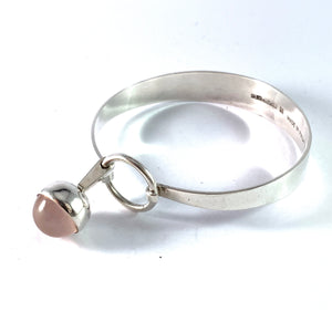 Wonderful and much sought after vintage solid 916 silver dangle rose quartz open/close bangle bracelet. Fully hallmarked for renowned H.Kaksonen for Kaunis Koru Finland year 1964.