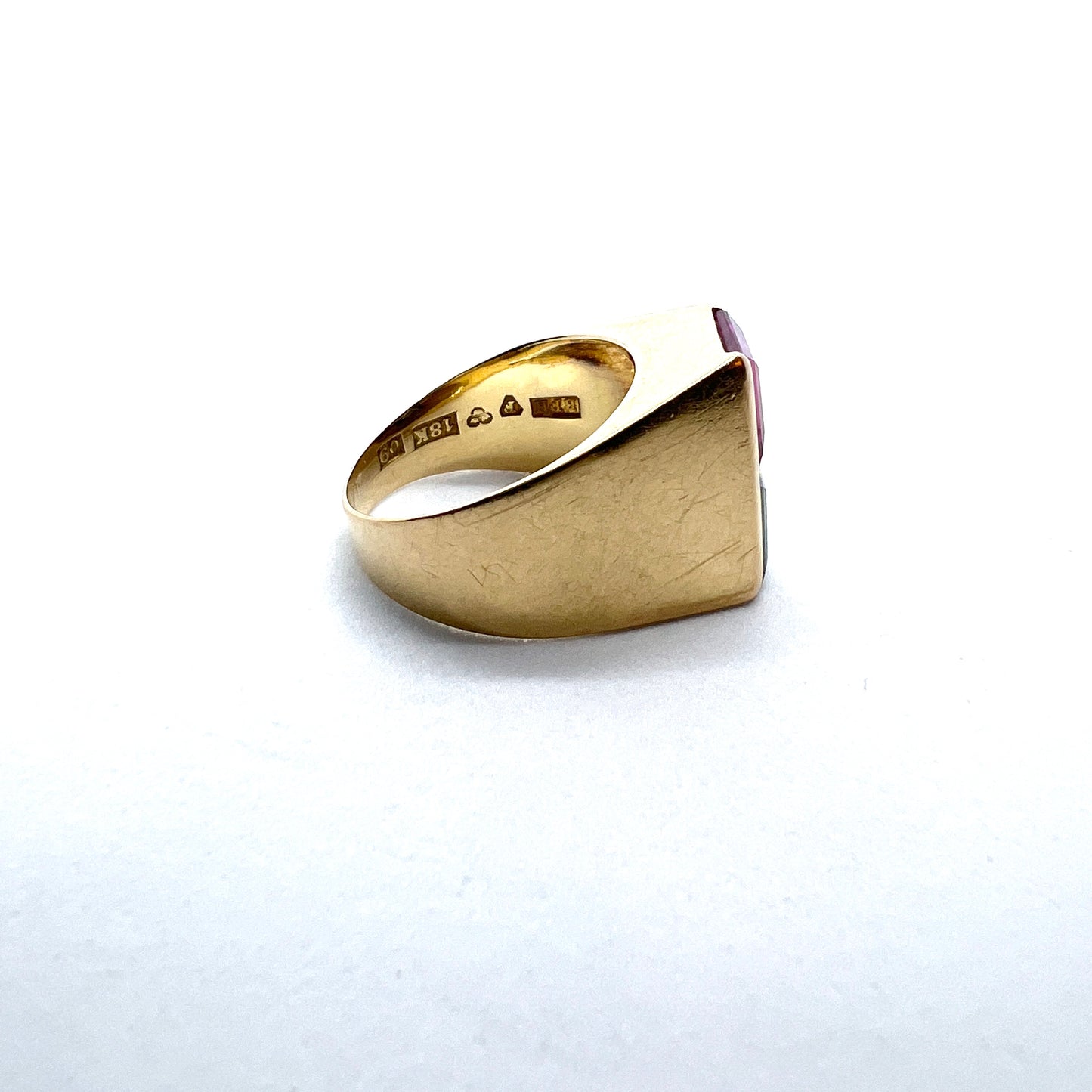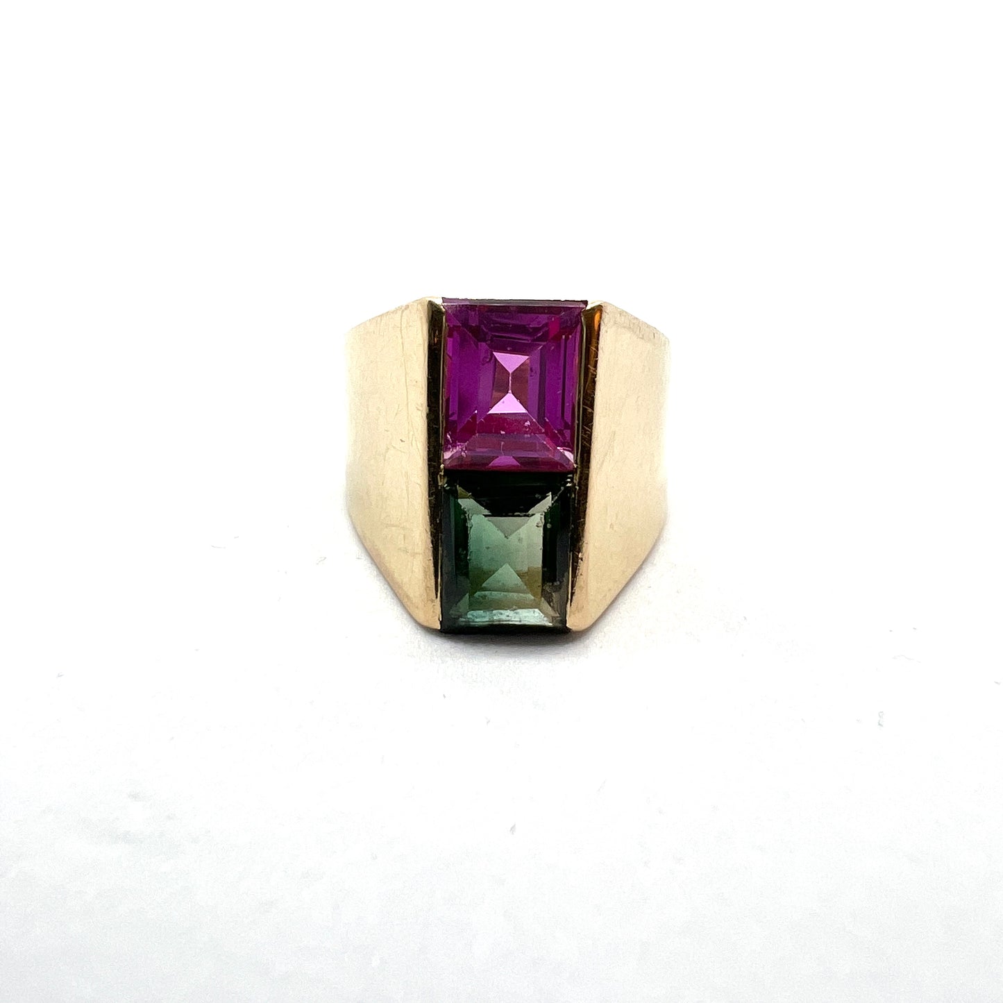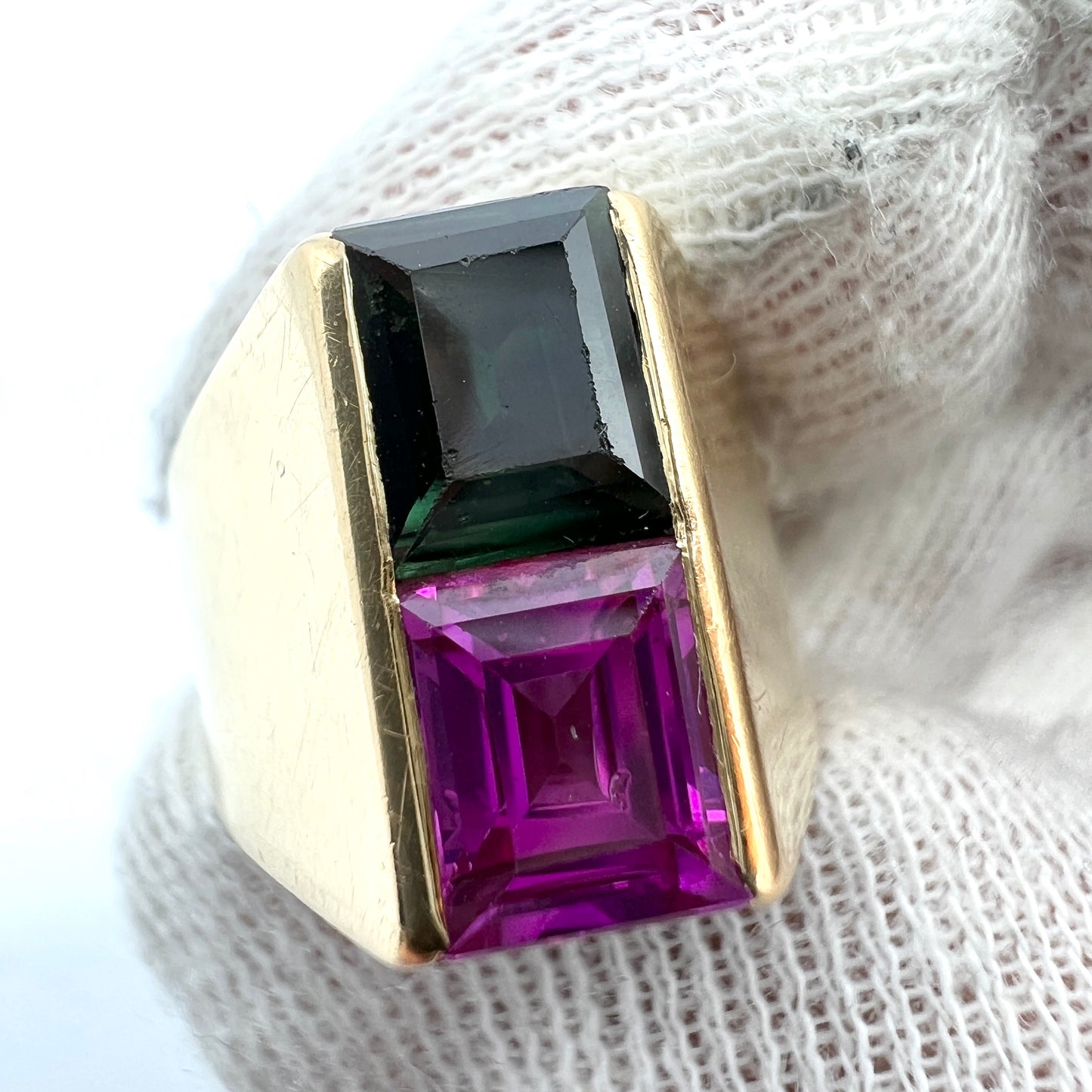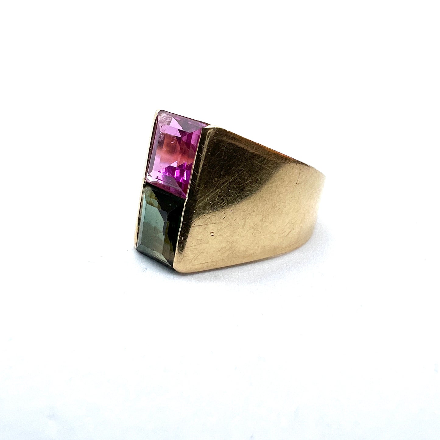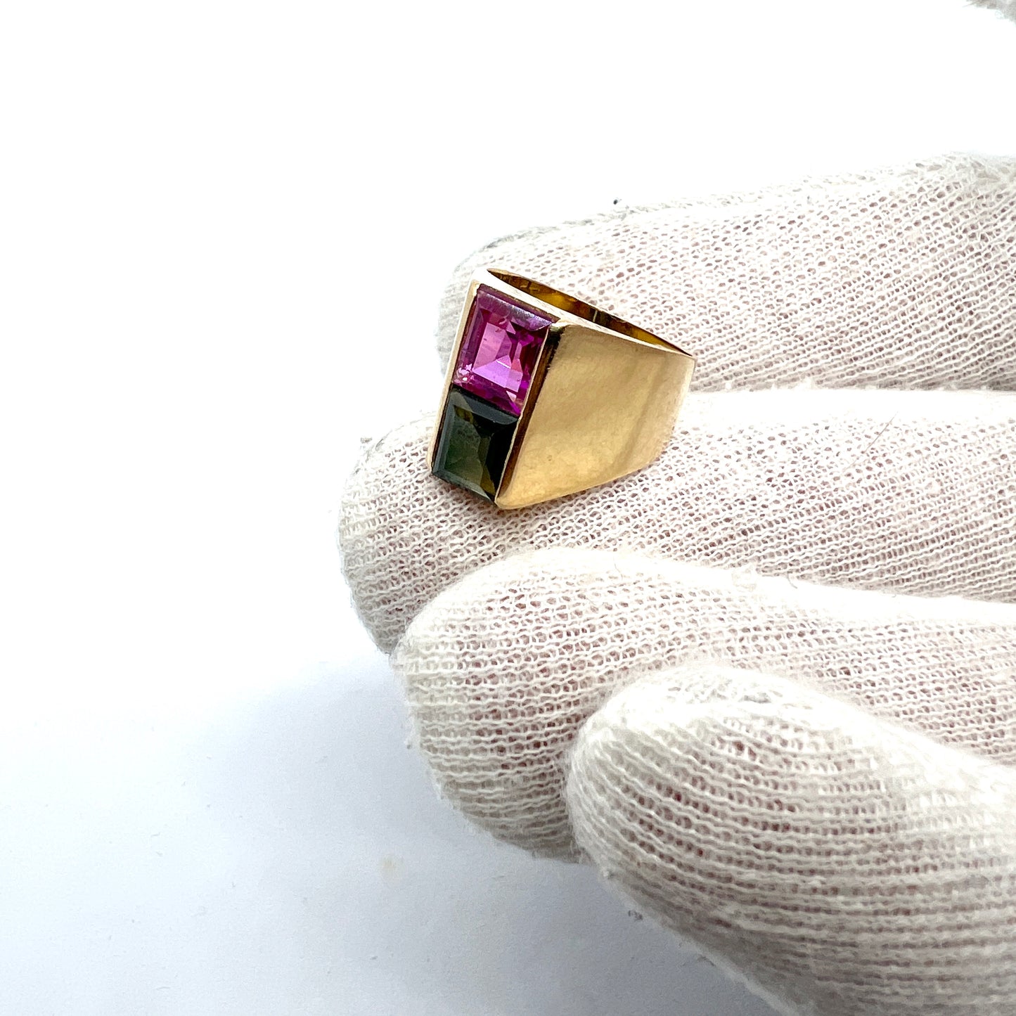 Beautiful vintage modernist 18k gold synthetic pink sapphire, green tourmaline ring. Fully hallmarked for 18k gold, Hellerstedt, Sweden year 1964.