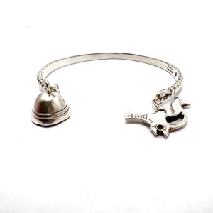 Beautiful and sought after vintage solid silver open bangle bracelet. Fully hallmarked for Holger Lindstrom for Kalevala Koru, Finland 1953. Early production. Original charms.