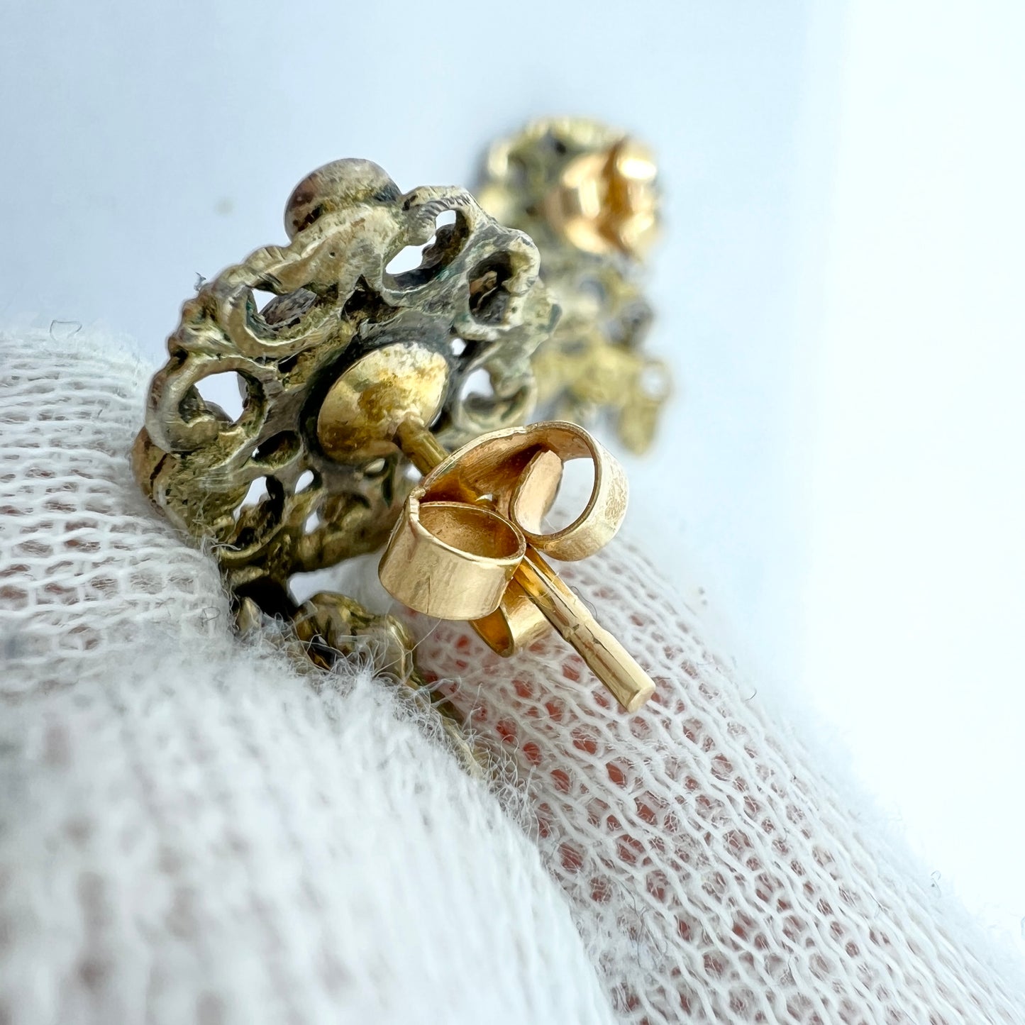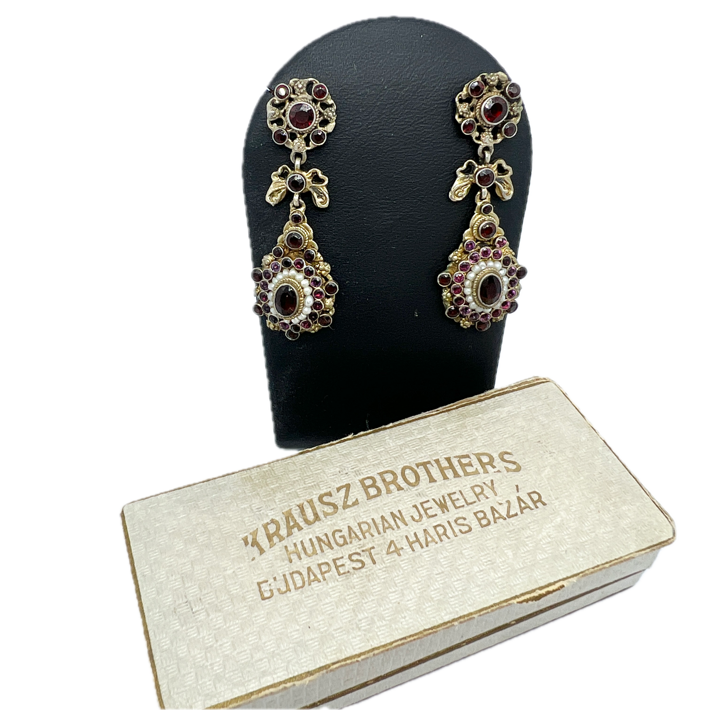 Wonderful and much sought after vintage gilt silver garnet seed pearl and paste earrings. In original box. Later 18k gold posts and stoppers, most likely converted from screw backs. Hungary early 1900s.