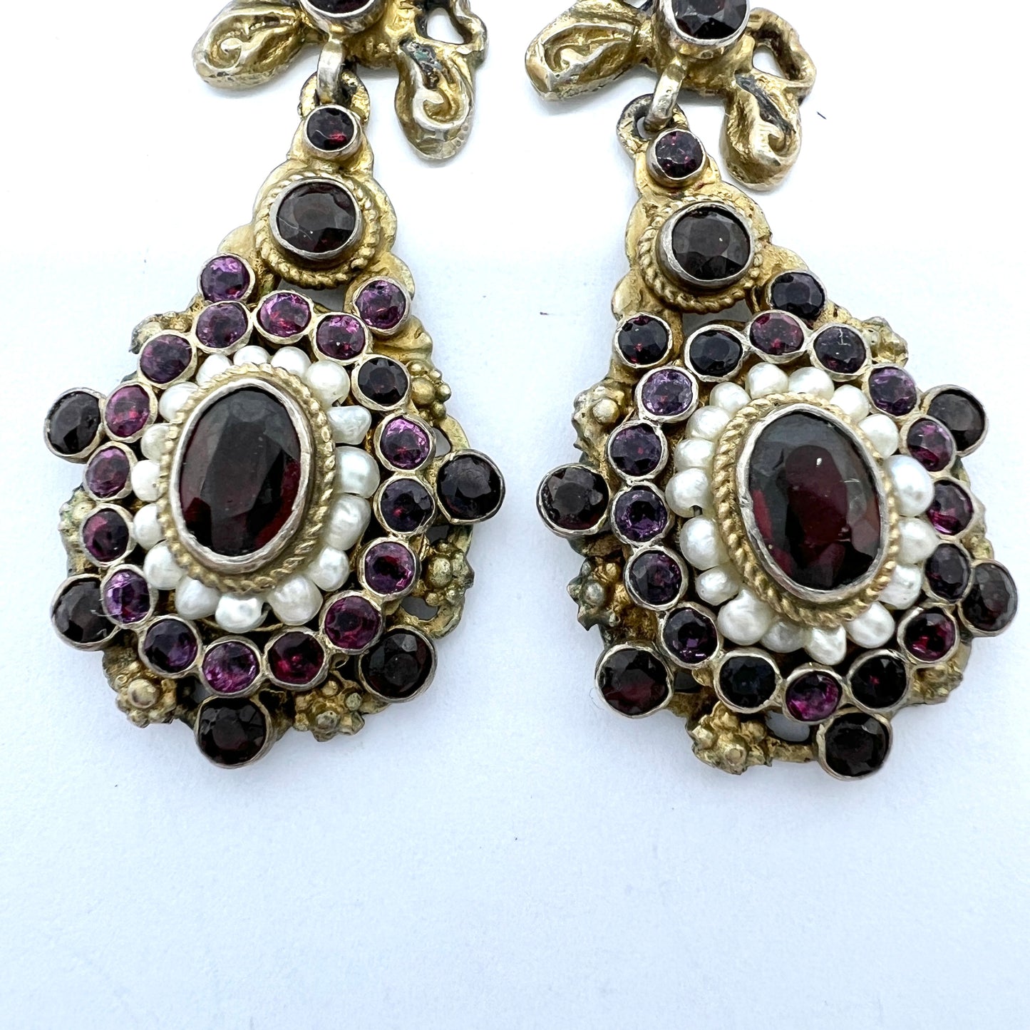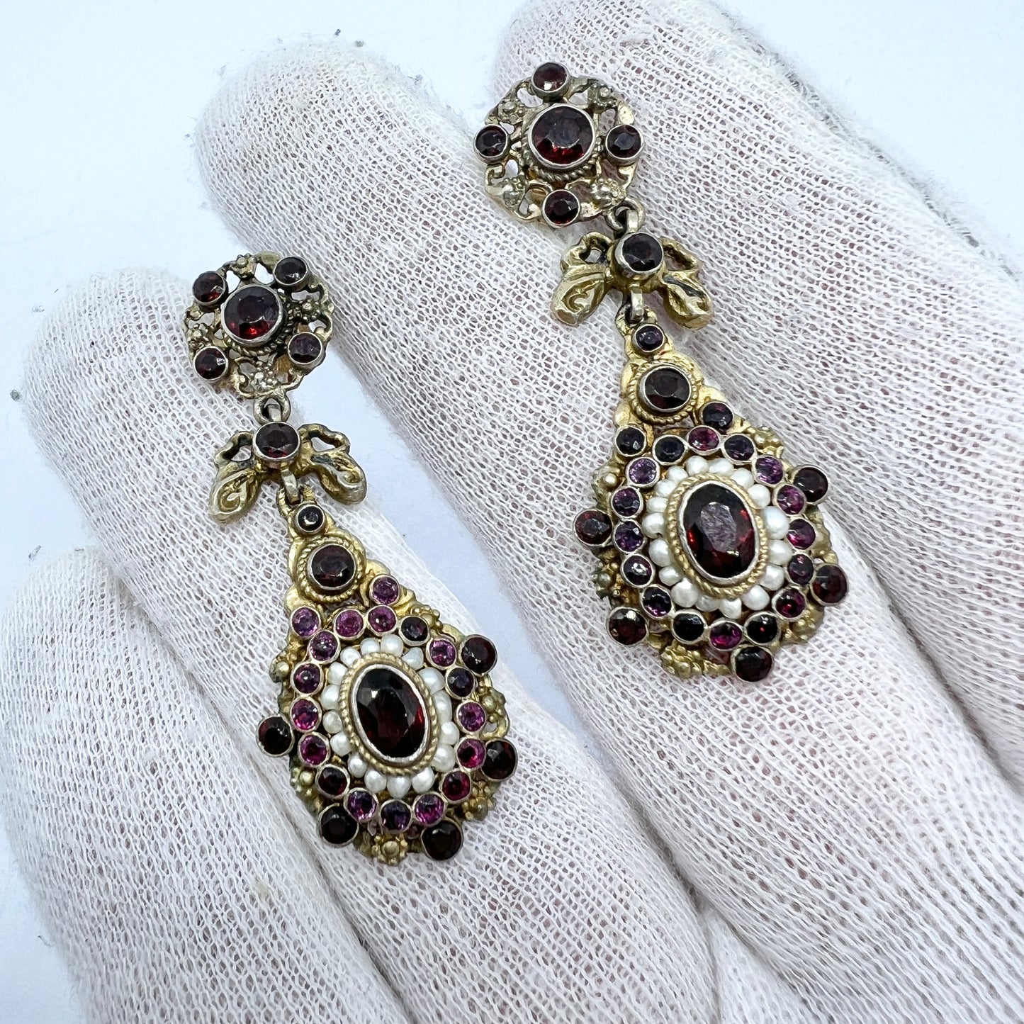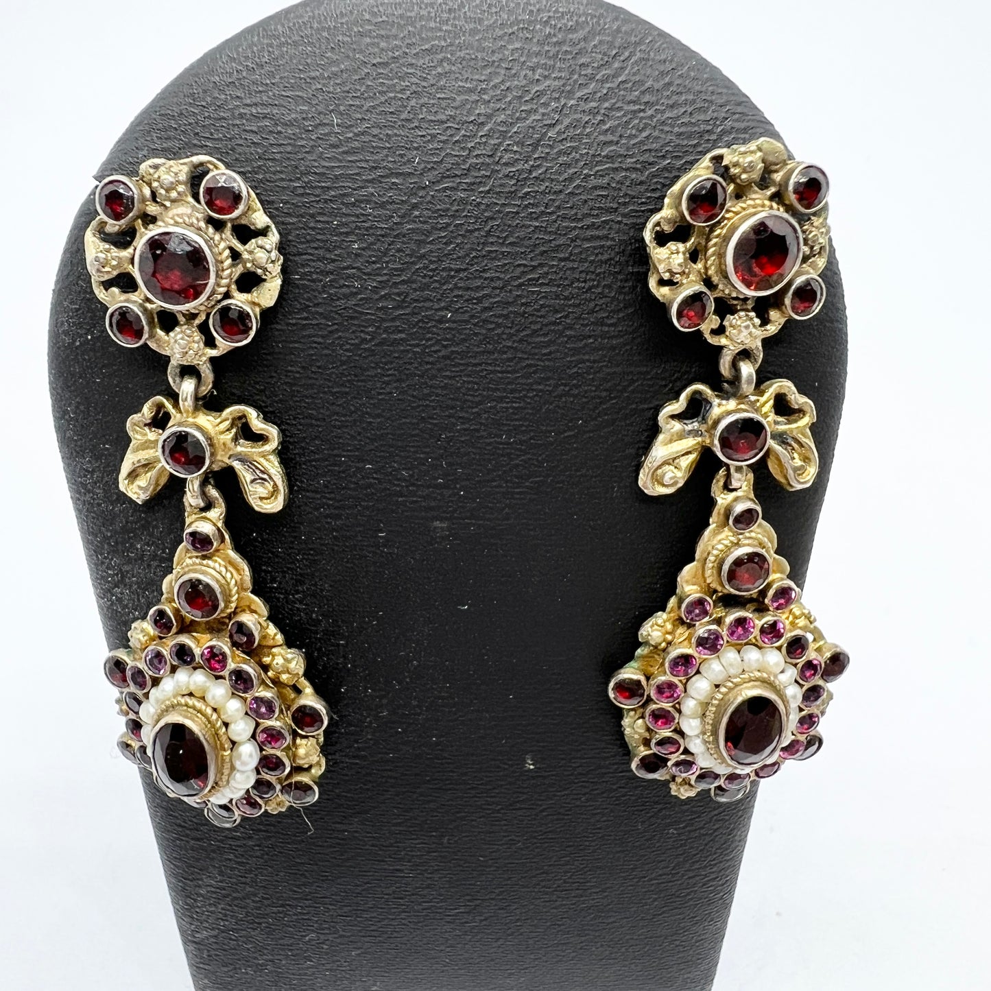 Hungary early 1900s. Gilt Silver Bohemian Garnet Seed Pearl Paste Earrings.