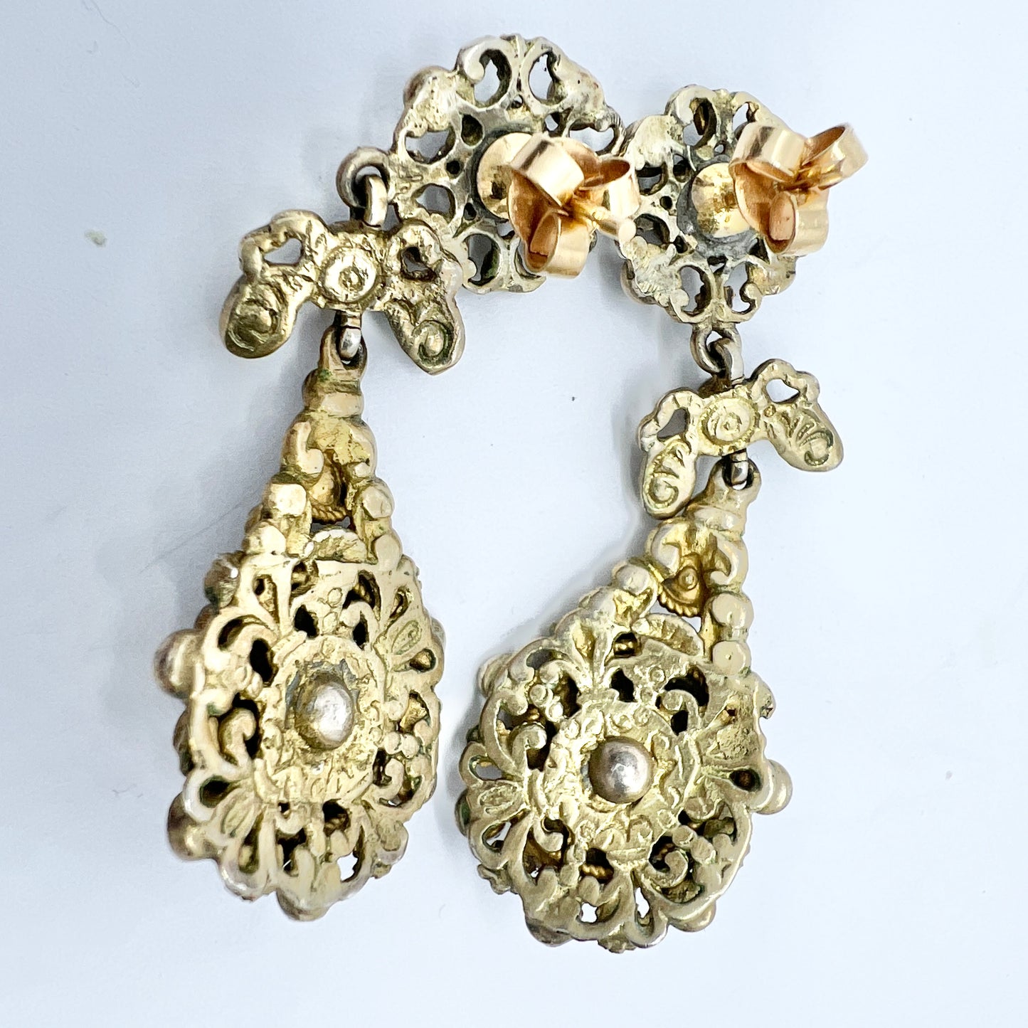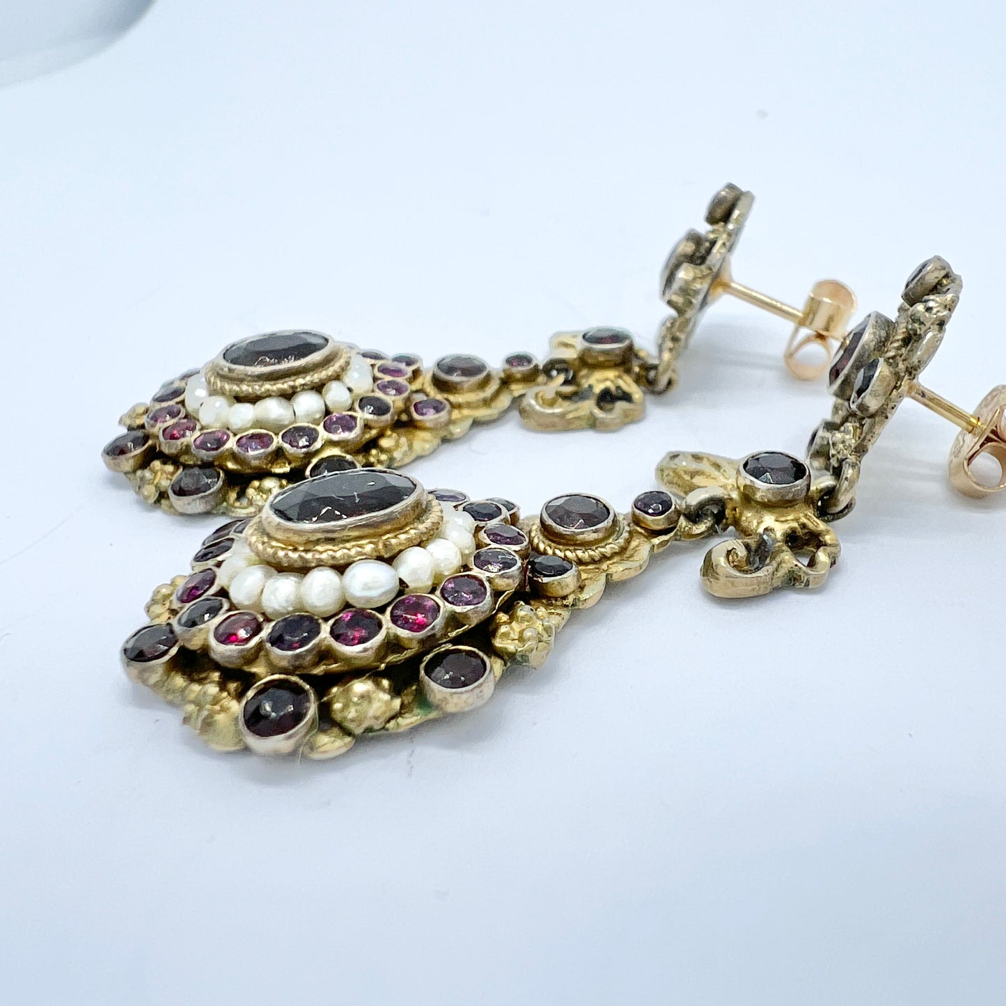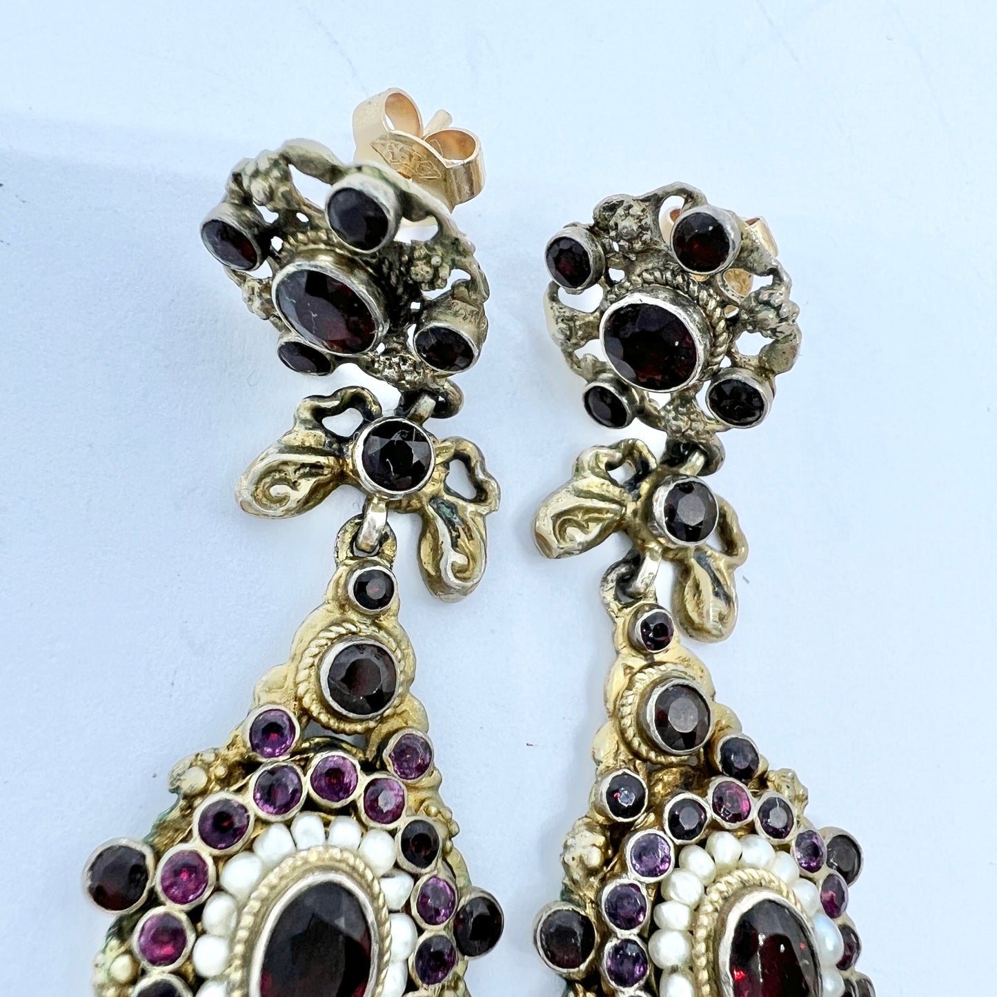 Hungary early 1900s. Gilt Silver Bohemian Garnet Seed Pearl Paste Earrings.