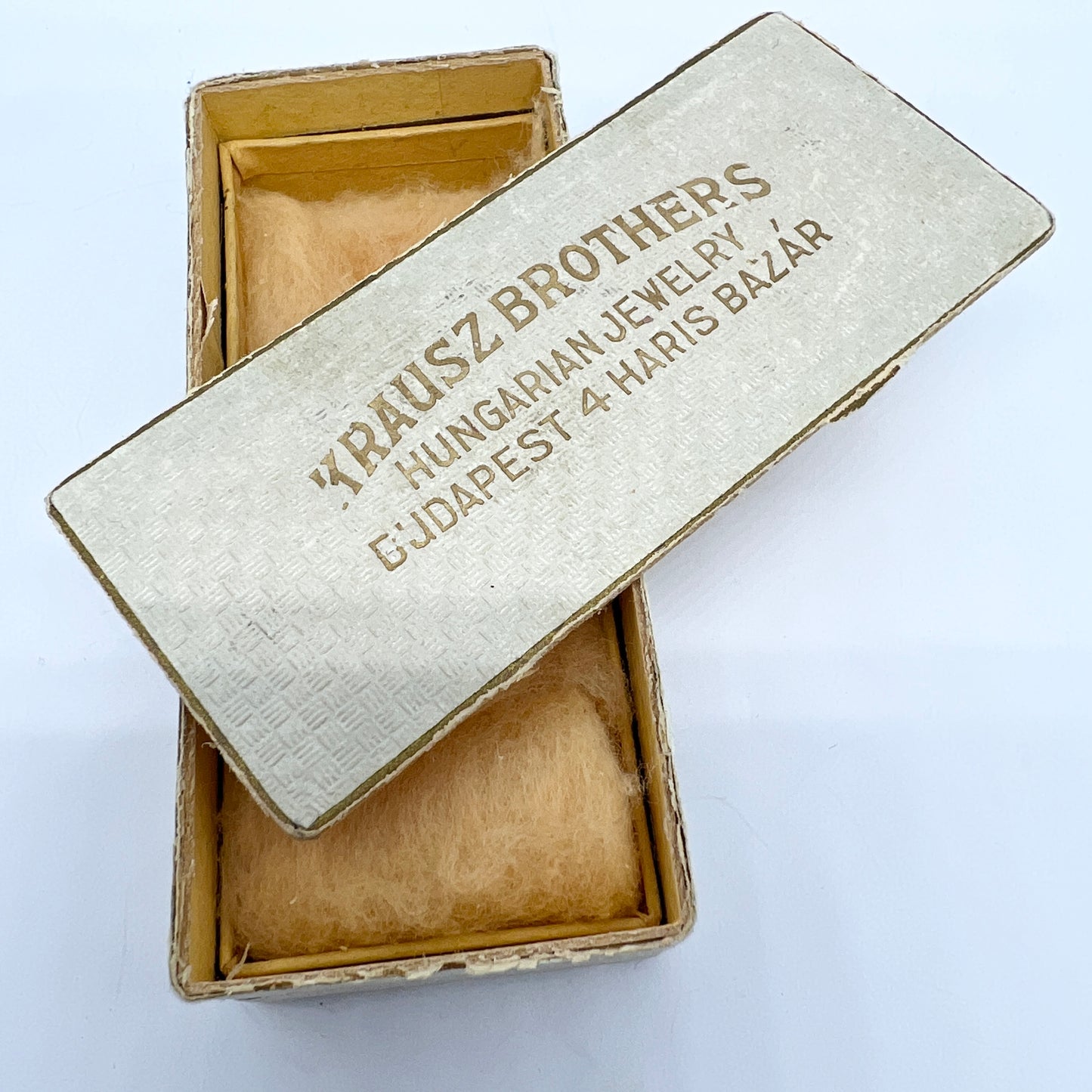 Excellent condition, later posts and stoppers in 18k gold. Paper box is broken.