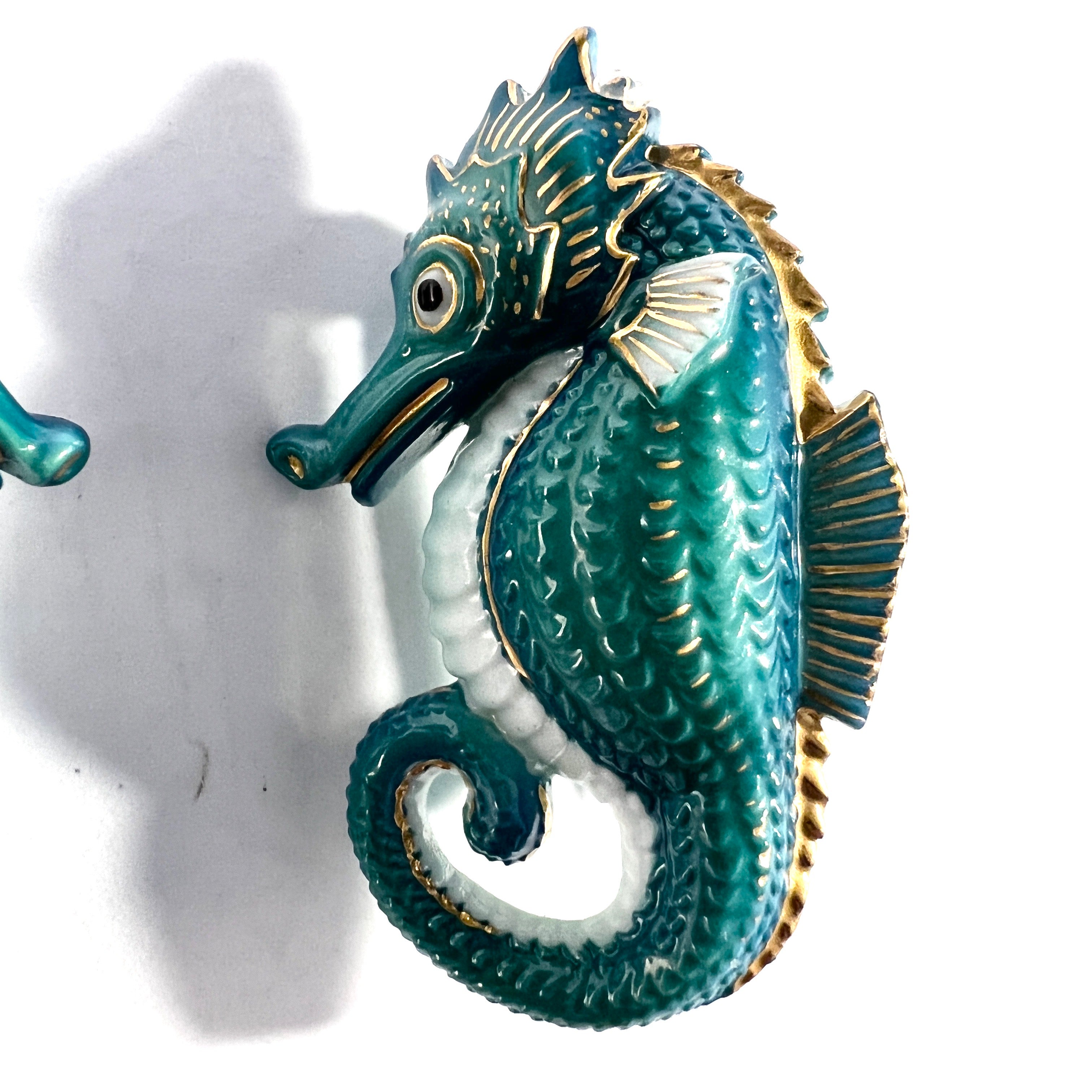 Very charming vintage pair of toshikane porcelain seahorse brooches. Made in Japan 1950-60s.