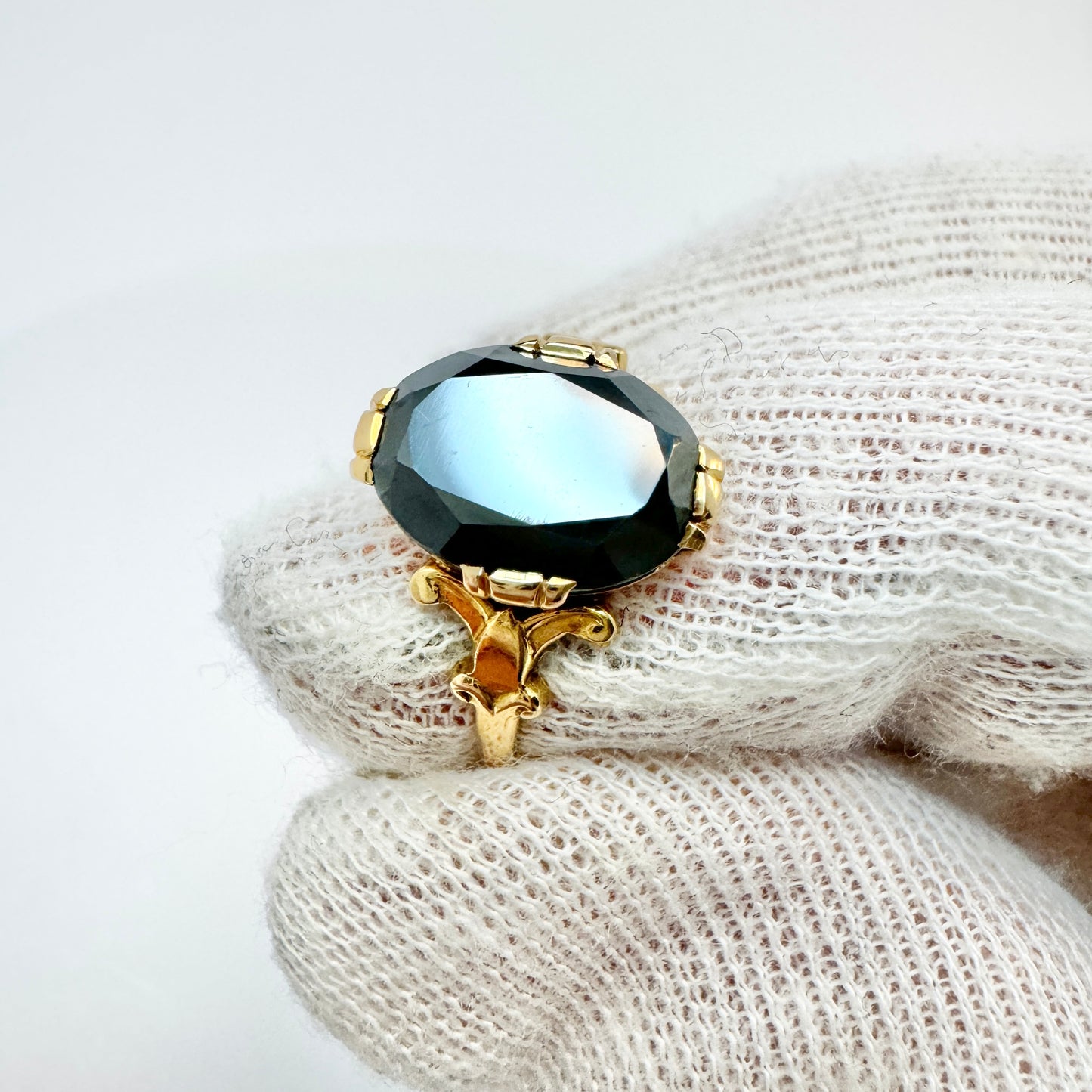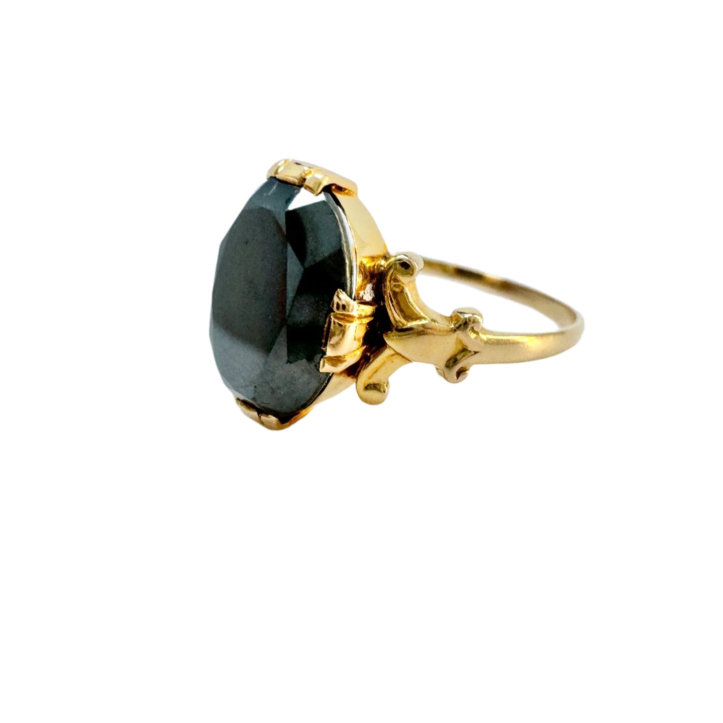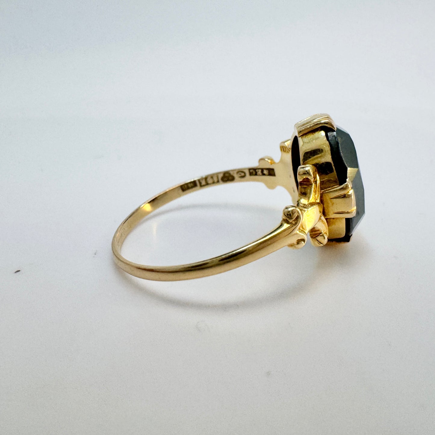 Wonderful vintage 18k gold hematite ring. Fully hallmarked for 18k gold, K & E Carlson, Sweden year 1938.