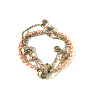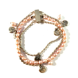Wonderful vintage sterling silver cultured pink pearl charm 3-strand bracelet. Hallmarked for Kalevala Koru, Finland.
