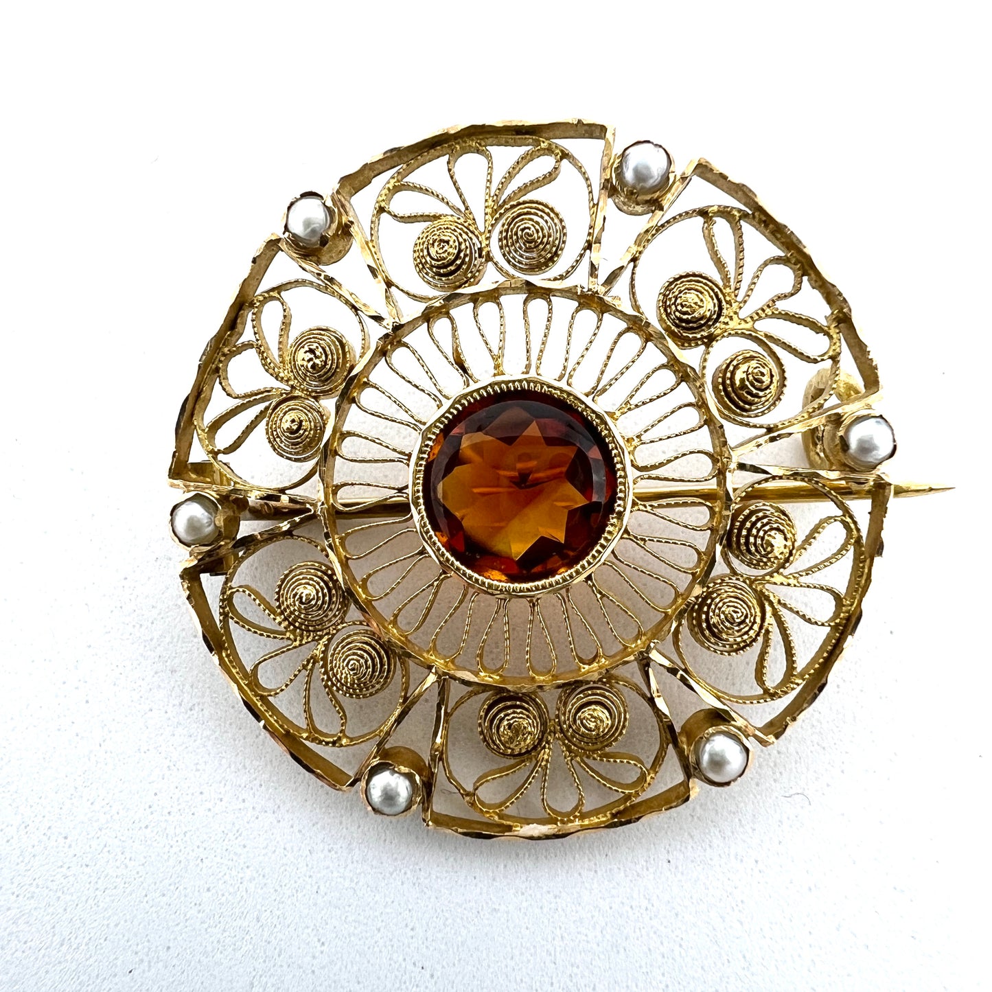 Wonderful Antique Edwardian 18k gold garnet seed pearl brooch. Fully hallmarked for maker Kristensen, Sweden year 1904.