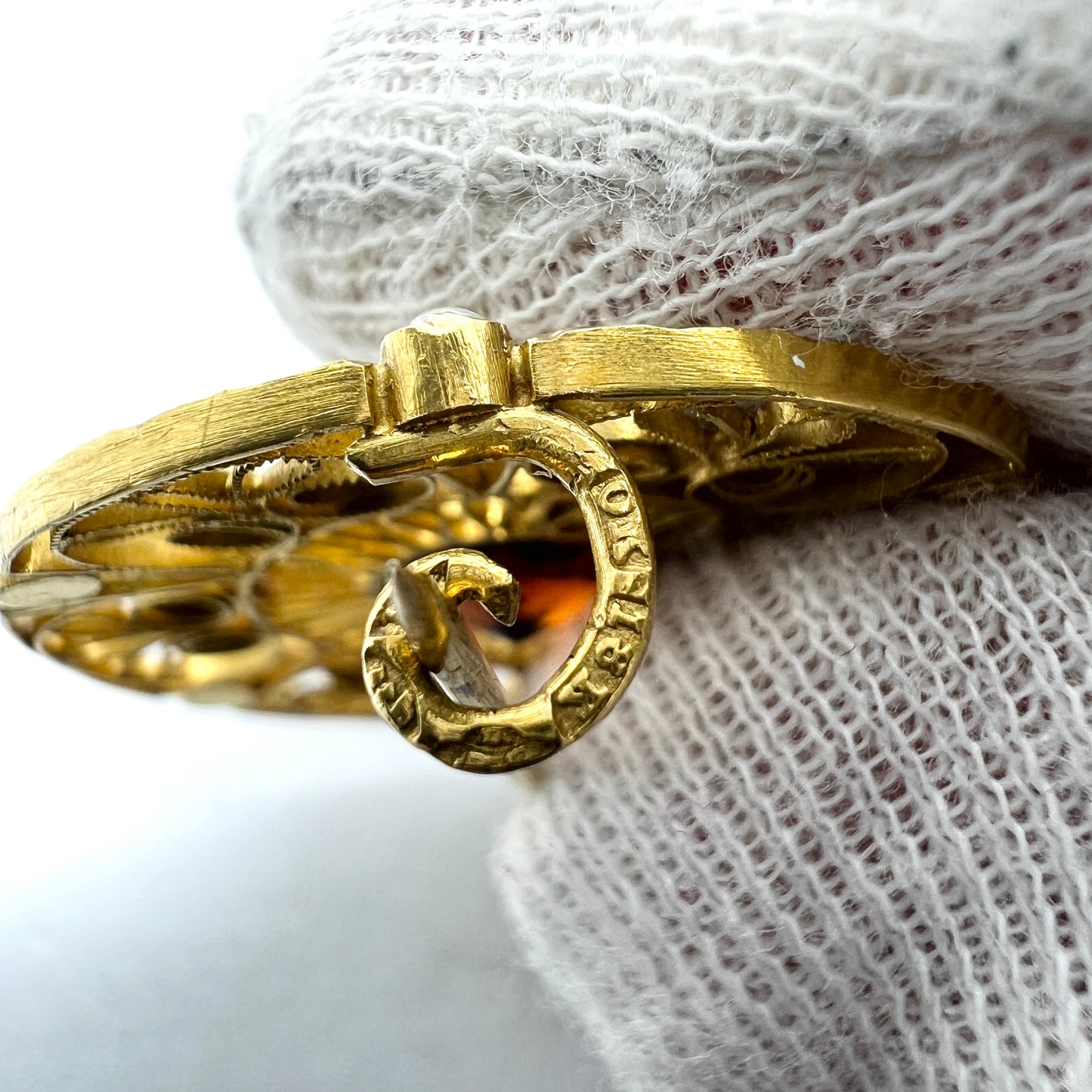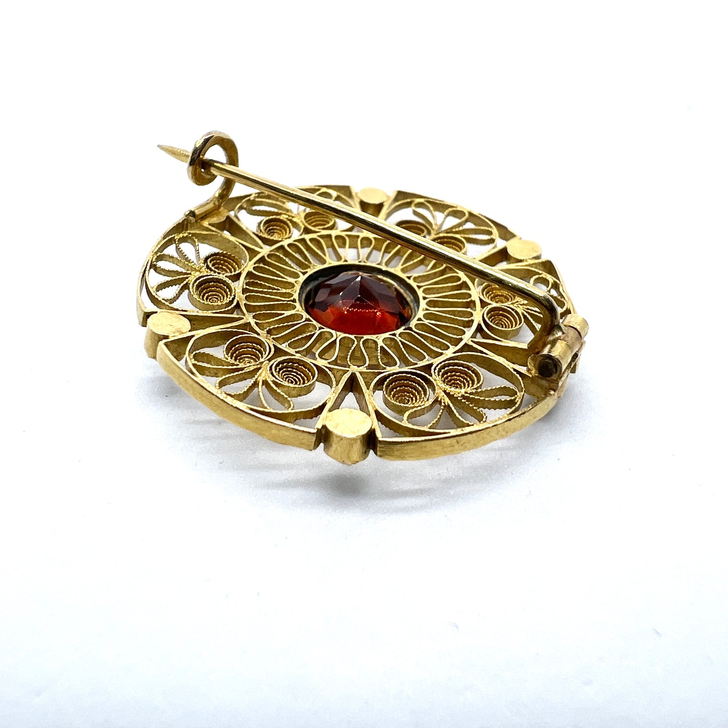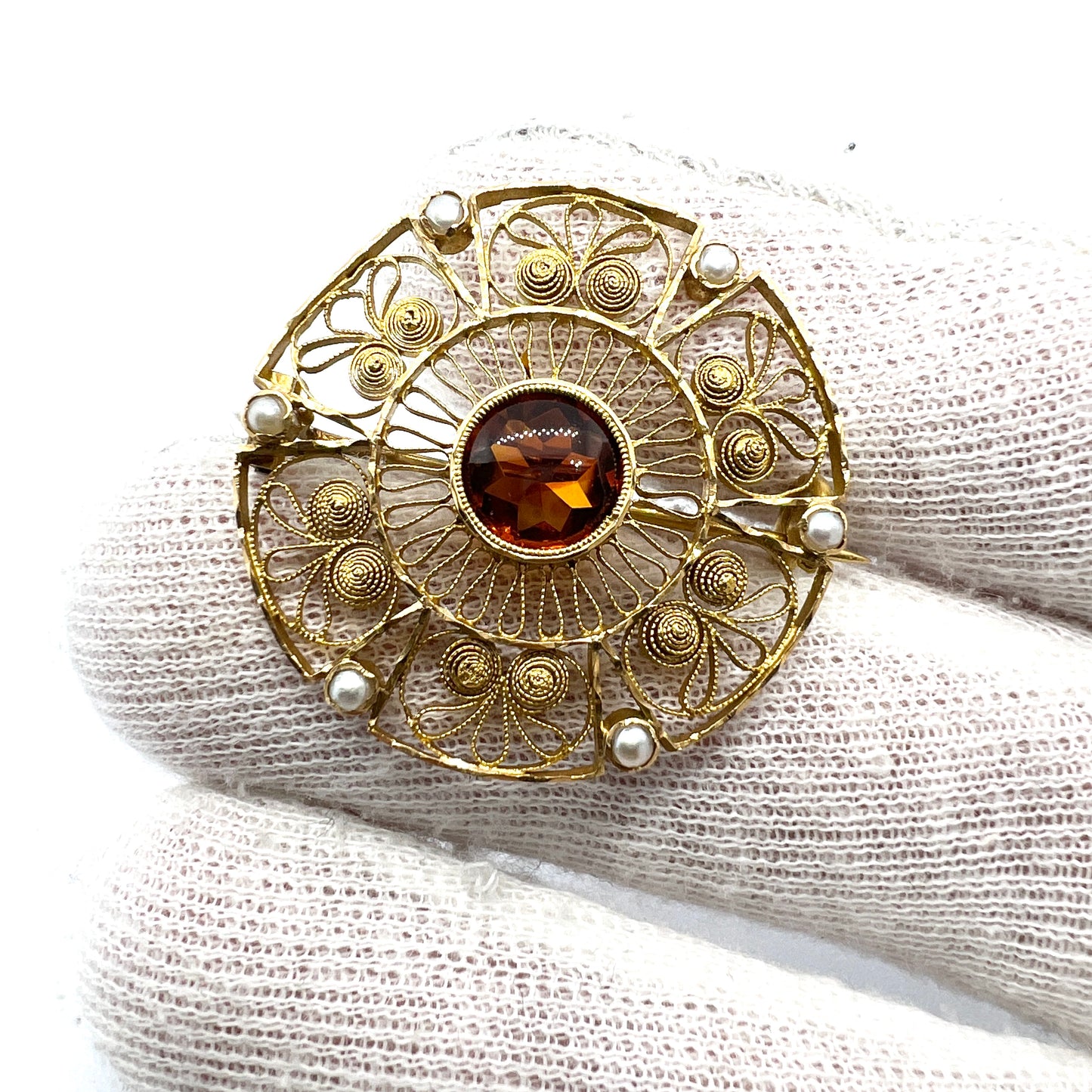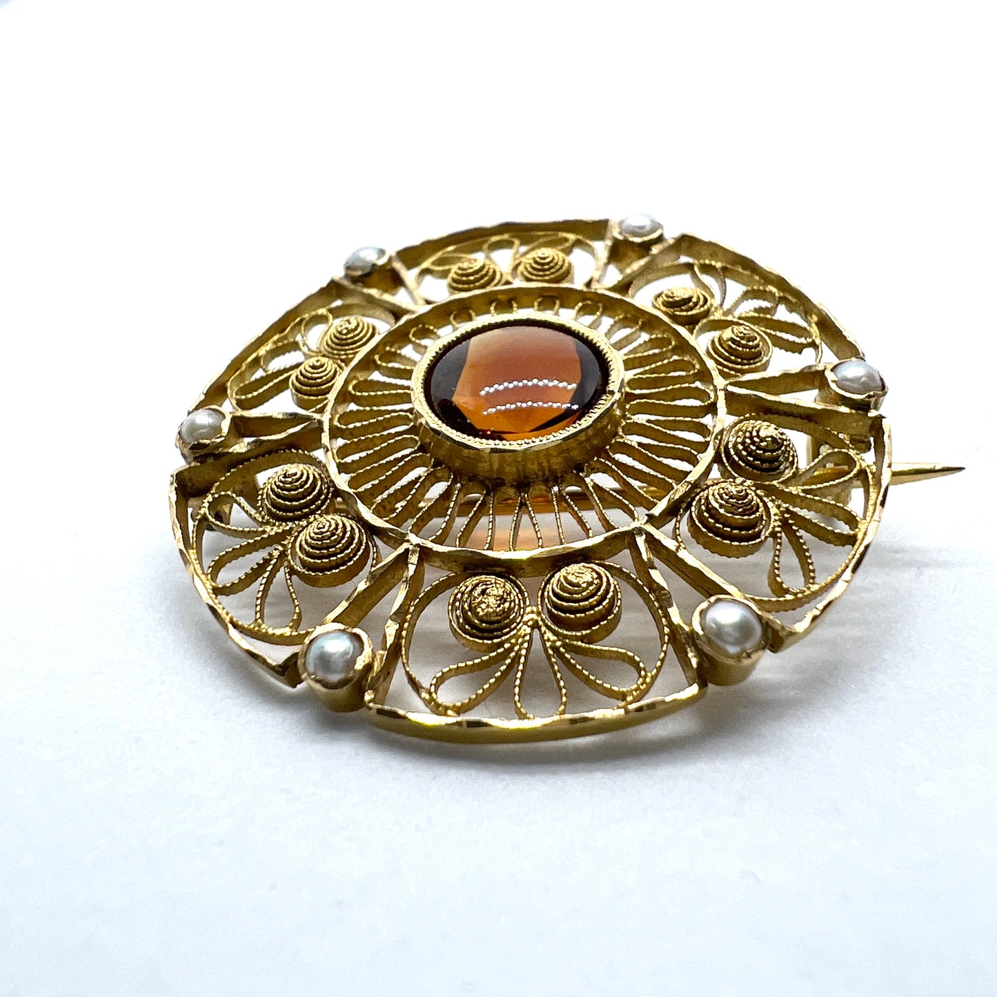 Kristensen, Sweden 1904 Antique Edwardian 18k Gold Garnet Seed Pearl Brooch.