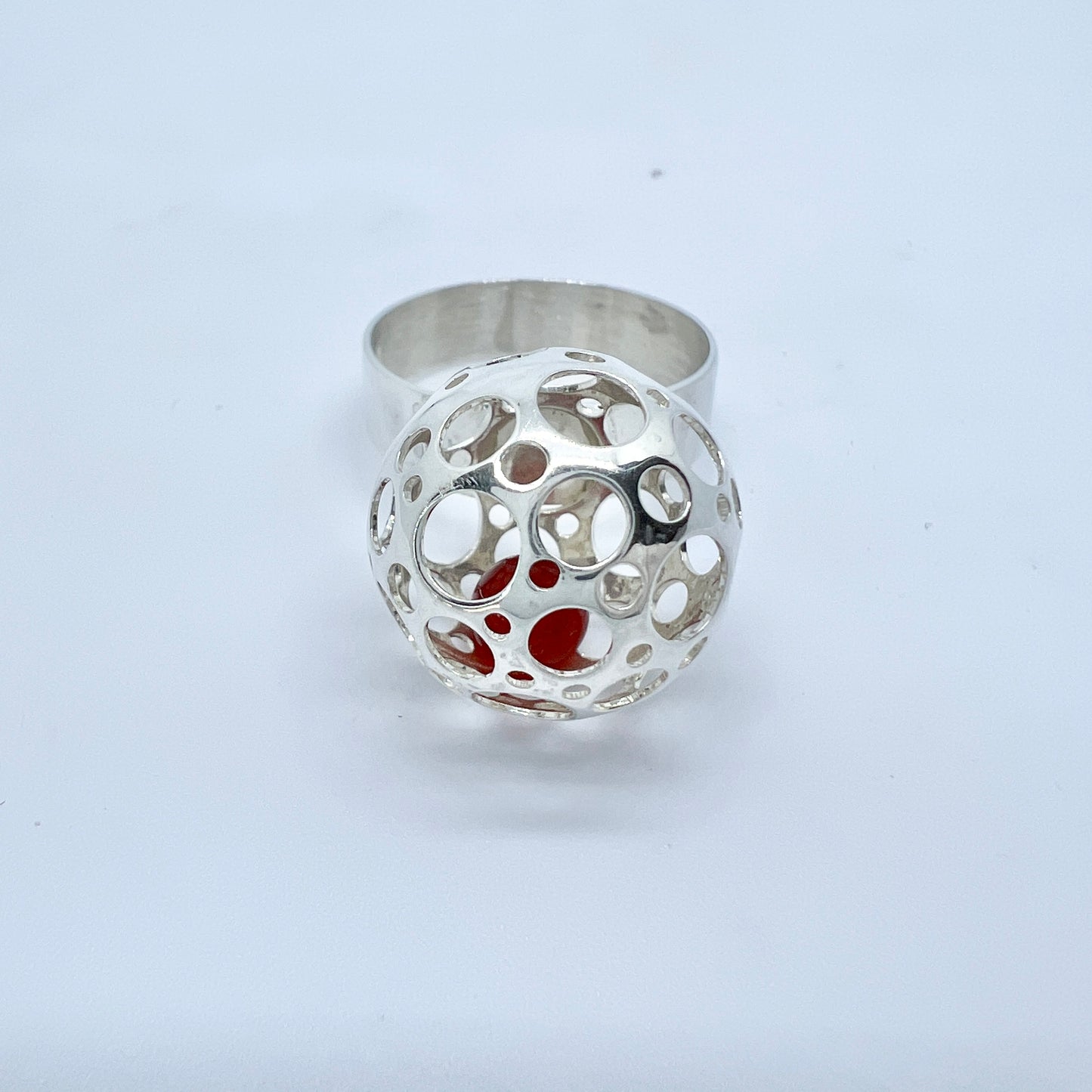 Wonderful and much sought after sterling silver trapped carnelian sphere ring. Hallmarked for N Westerback, Finland year 1973. Design Ladybird, by renowned Liisa Vitali.
