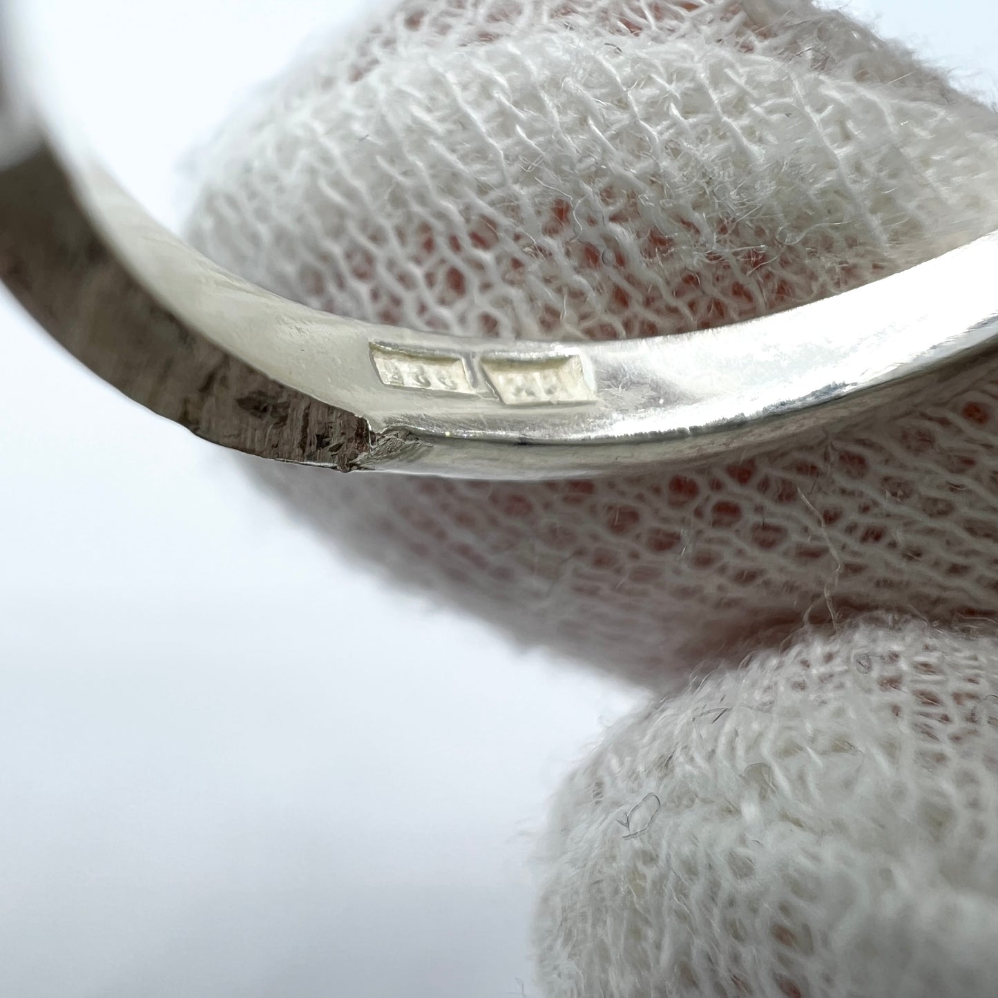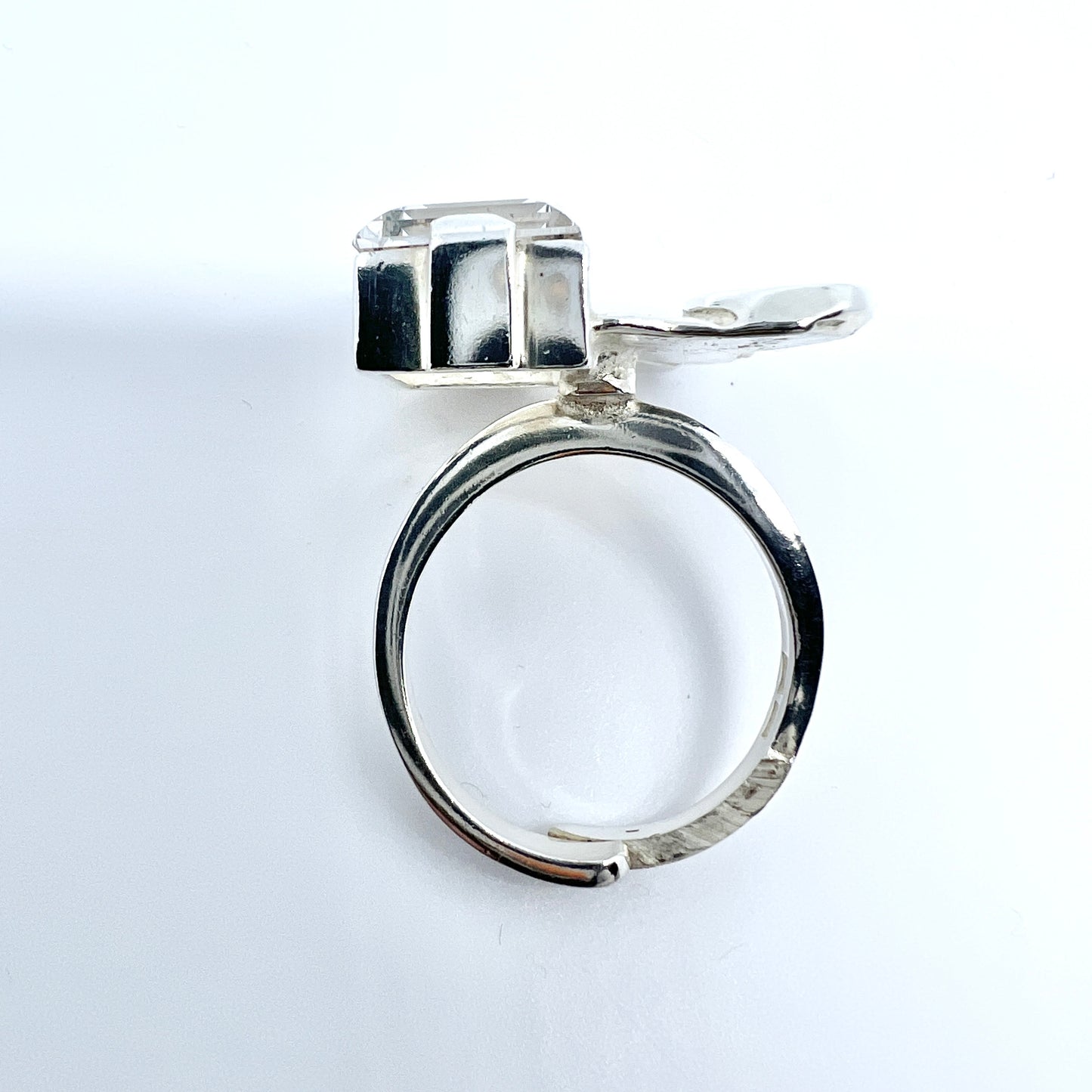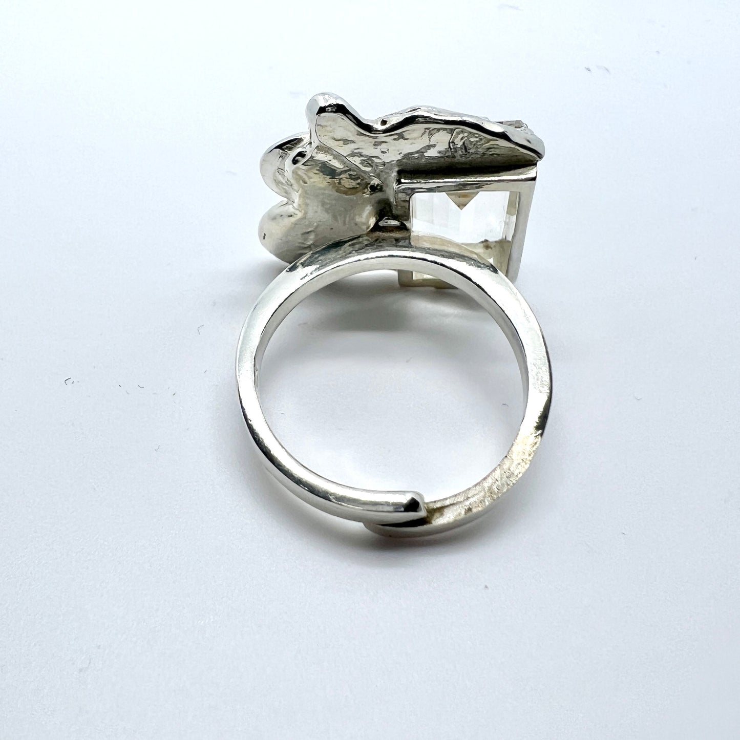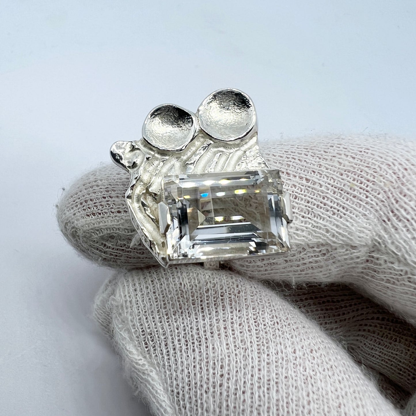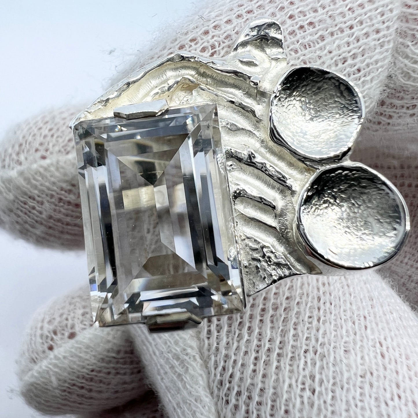 Maker HE, Vintage Modernist c 1970s Sterling Silver Quartz Ring