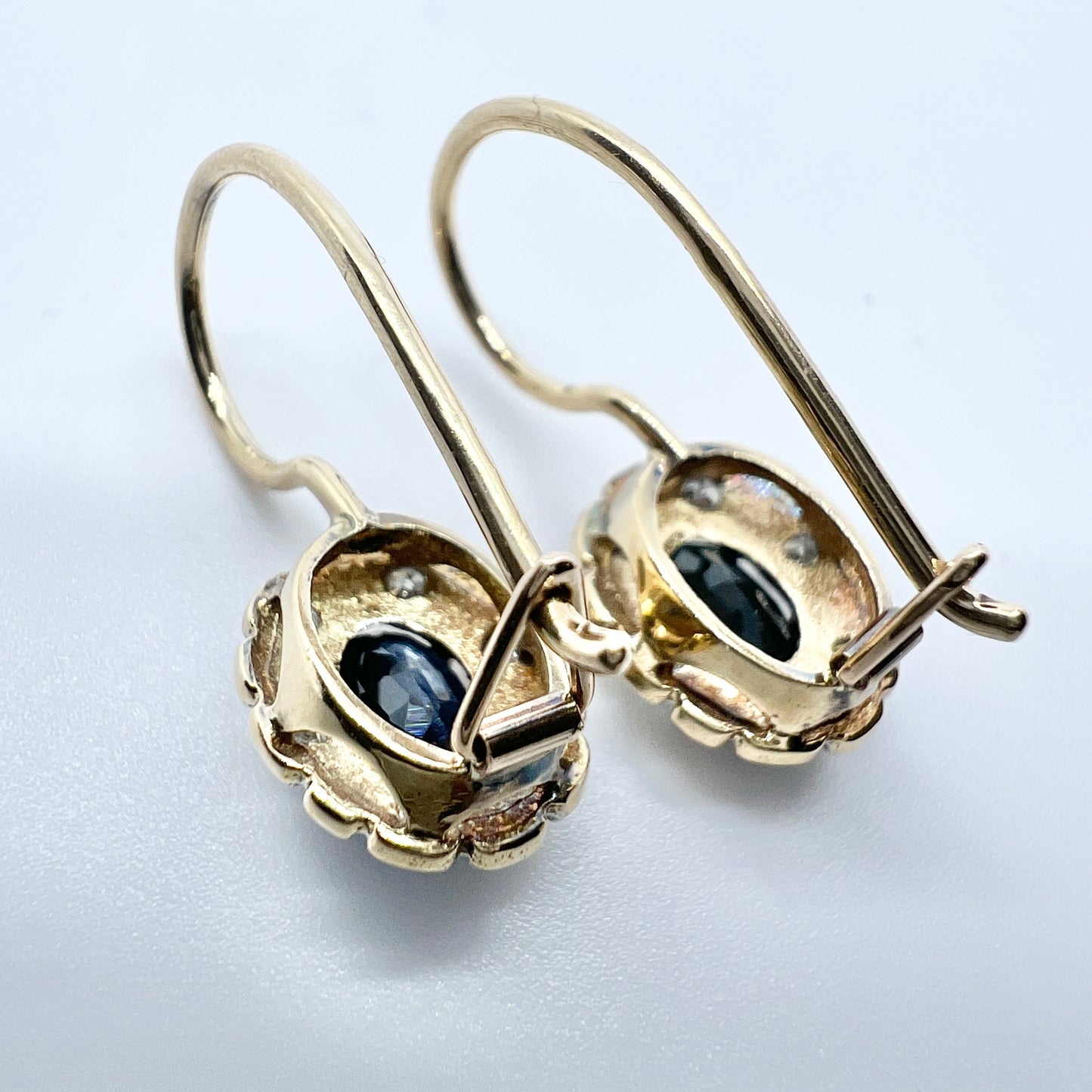 Very charming vintage 14k gold, sapphire diamond pair of earrings. Fully hallmarked for 14k gold, maker VM Finland 1998.