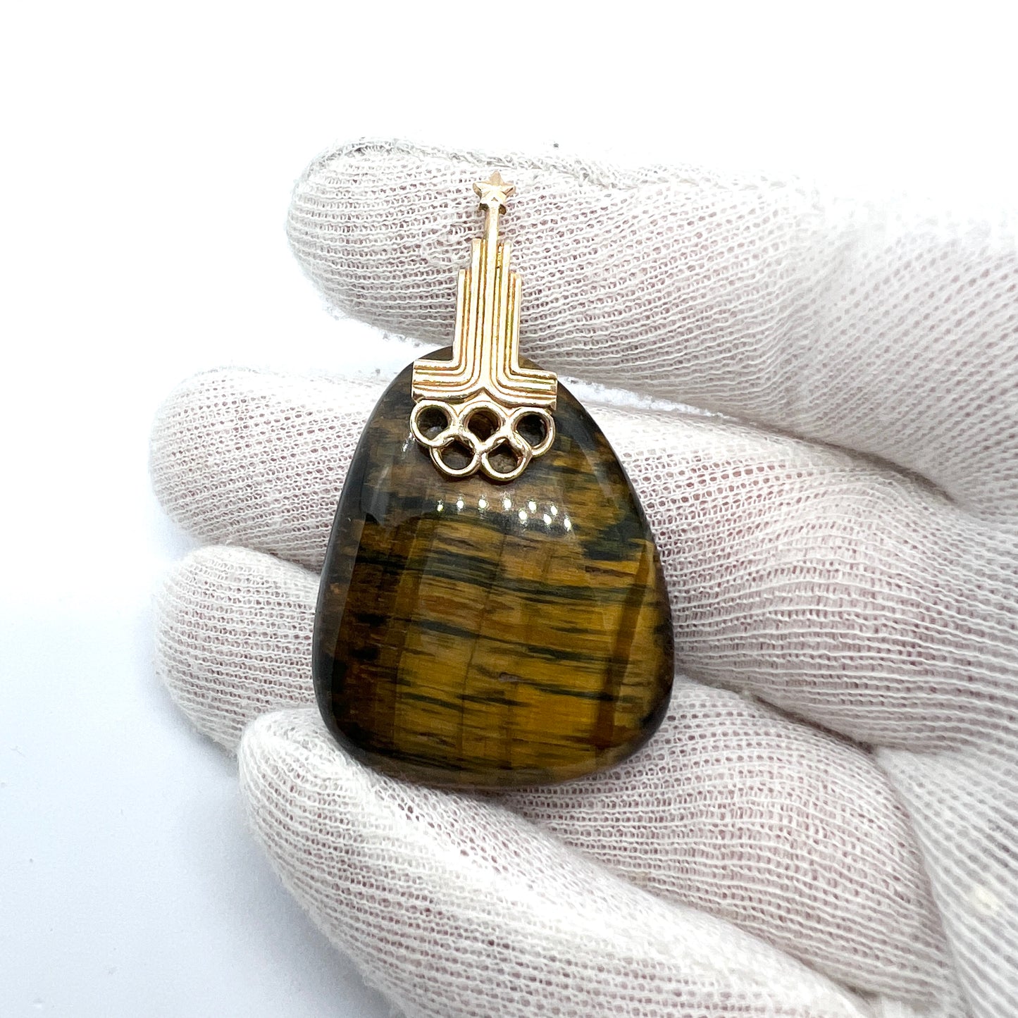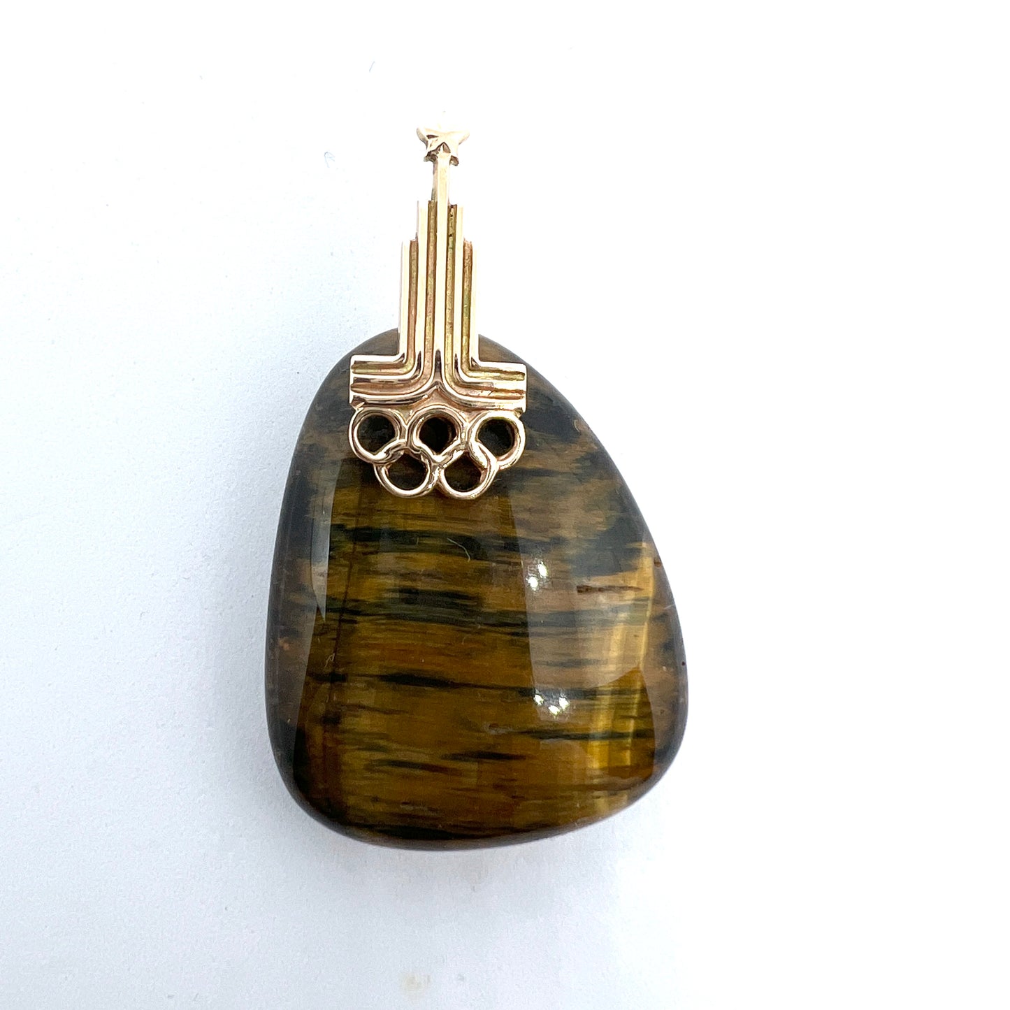 Very rare vintage 14k gold tiger's eye 1980 summer olympics pendant. Hallmarked for 14k gold, Soviet.