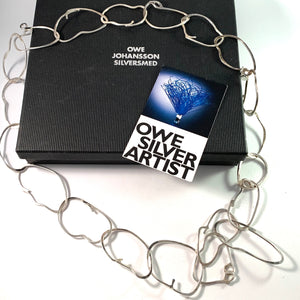Stunning and much sought after long sterling silver designer necklace. Fully hallmarked for renowned maker Owe Johansson, in his Copenhagen studio, vintage. In original box.