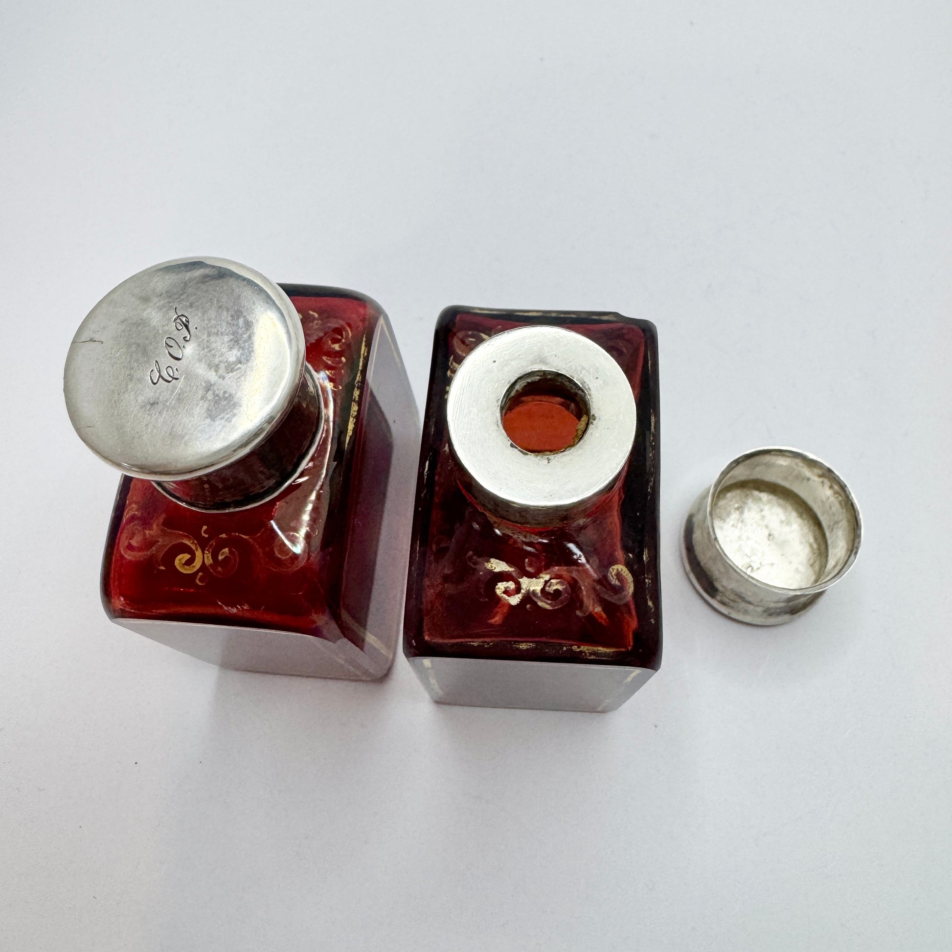 Stockholm 1858. Antique Victorian Ruby Glass Silver Top Pair of Perfume Bottles.
