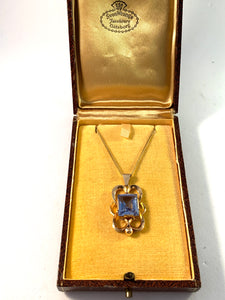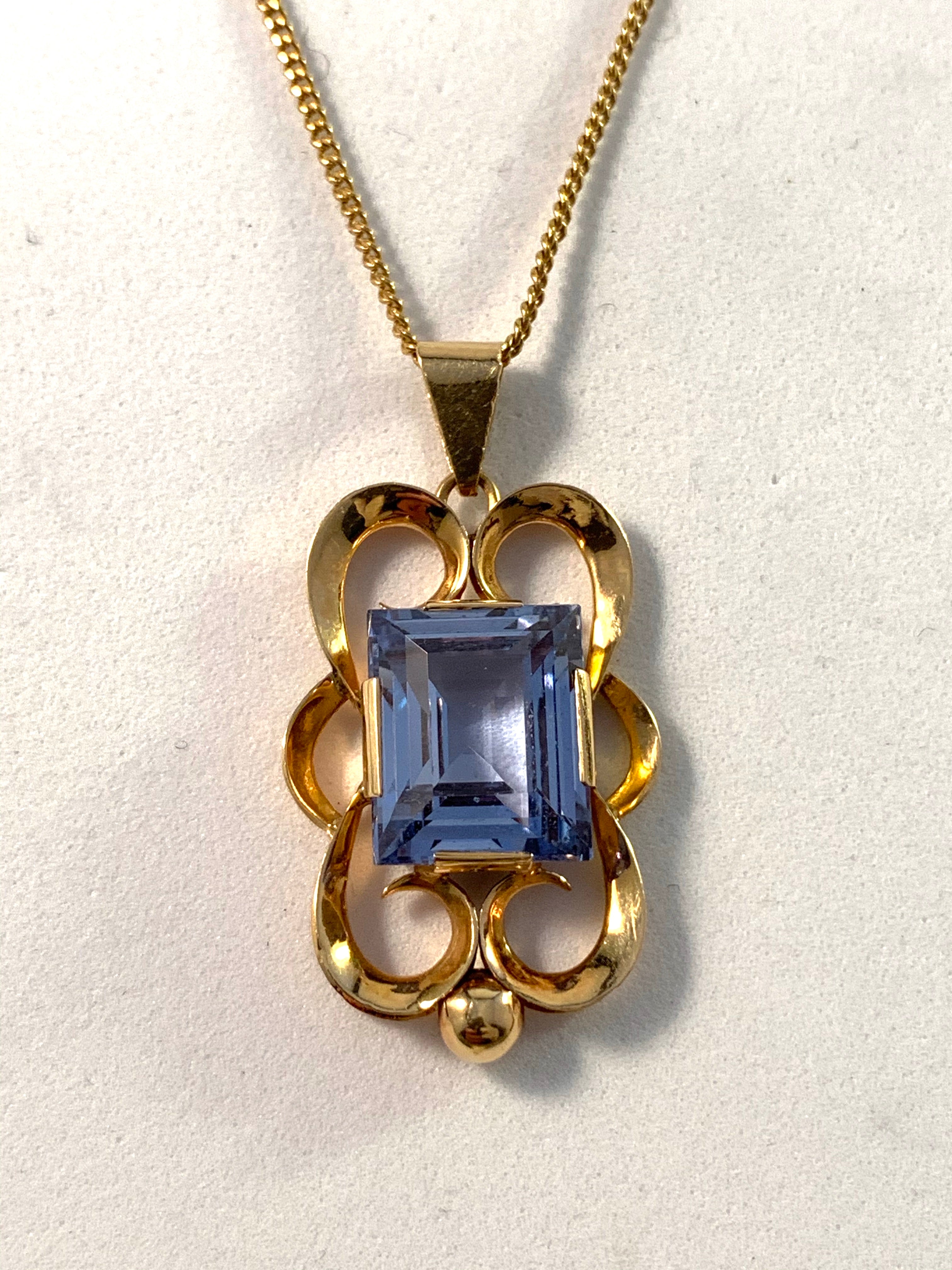 Wonderful 18k gold synthetic spinel mid century pendant necklace in original retailer's box. Fully hallmarked for maker Juvelfabriken, Stockholm Sweden year 1954.