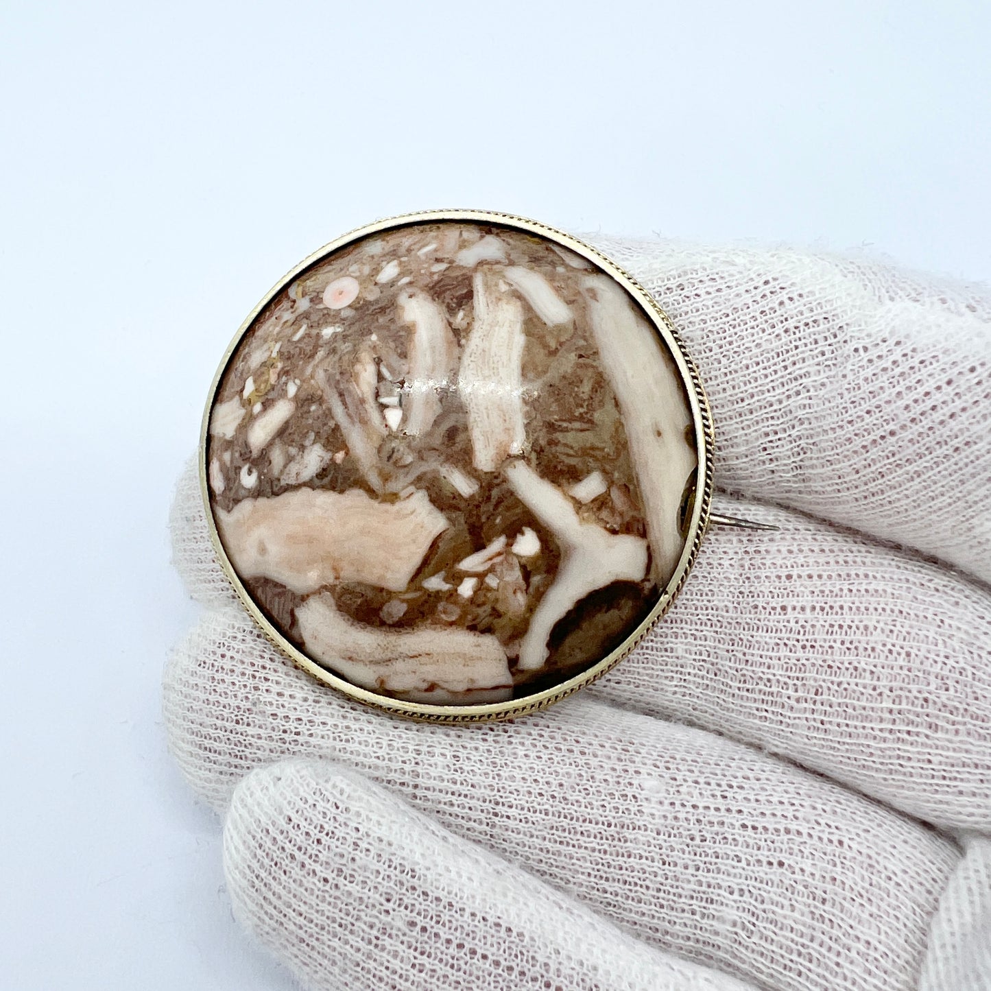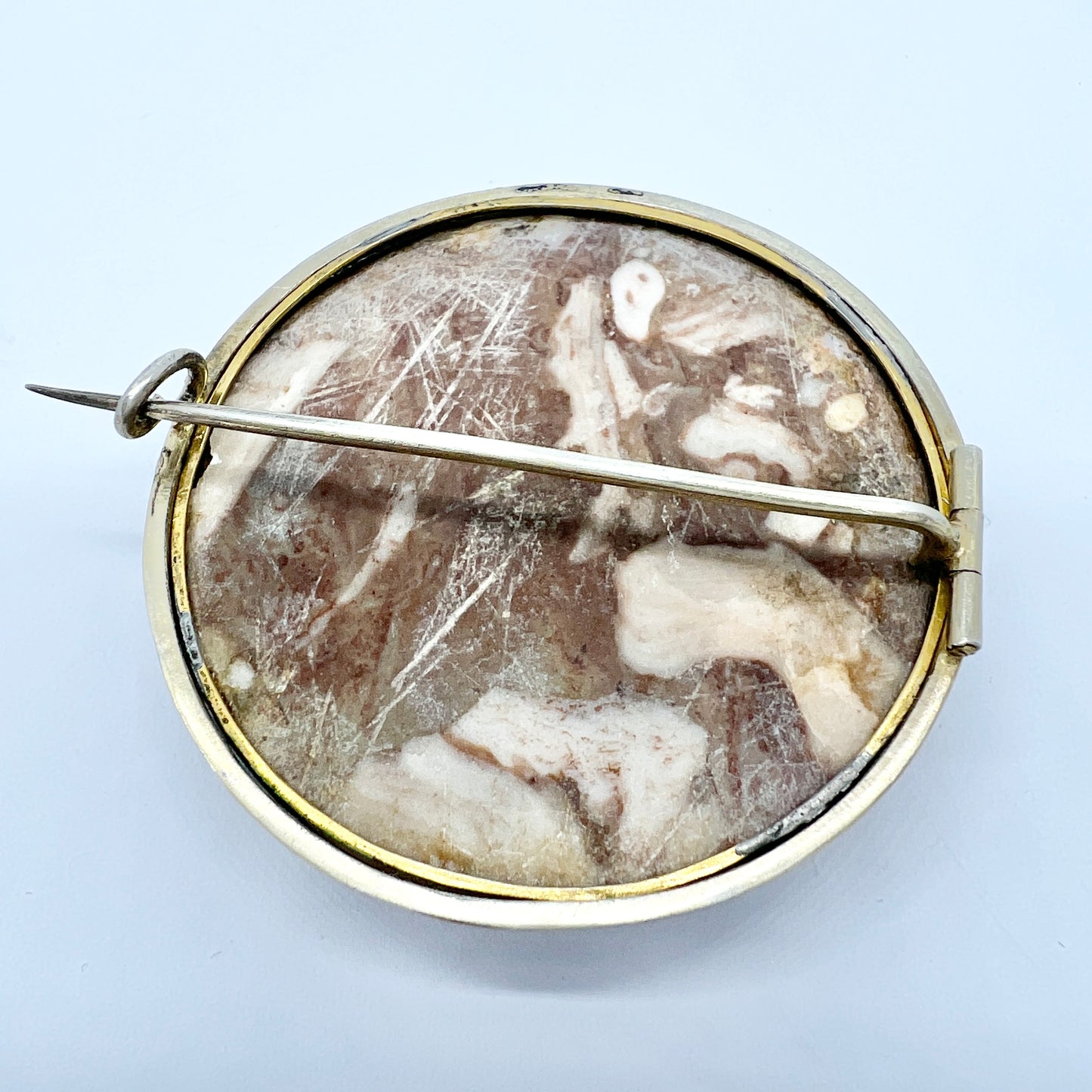 Wonderful antique Victorian gilt silver marble brooch. Hallmarked for Sweden year 1875, indistinct makers mark.