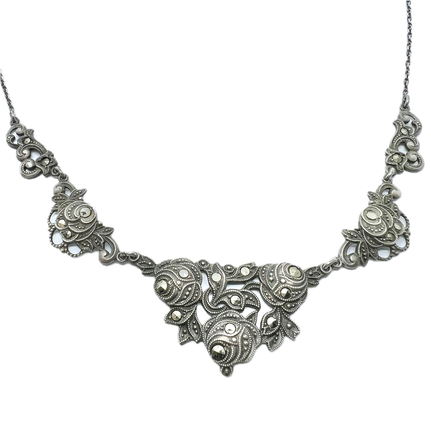 Sweden 1940s. Solid Silver Marcasite Floral Necklace.