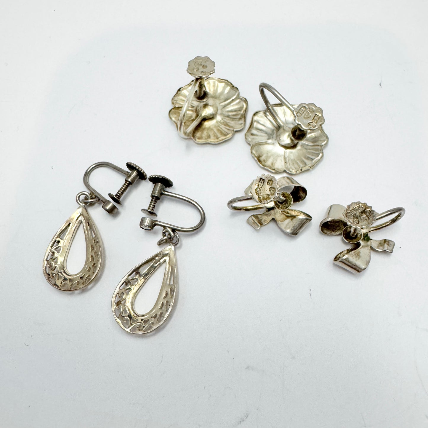 Three charming pair of solid silver screw-back earrings. Hallmarked for Hugo Grun 1947, TreGe 1947 and Swedish control marks 1940s.