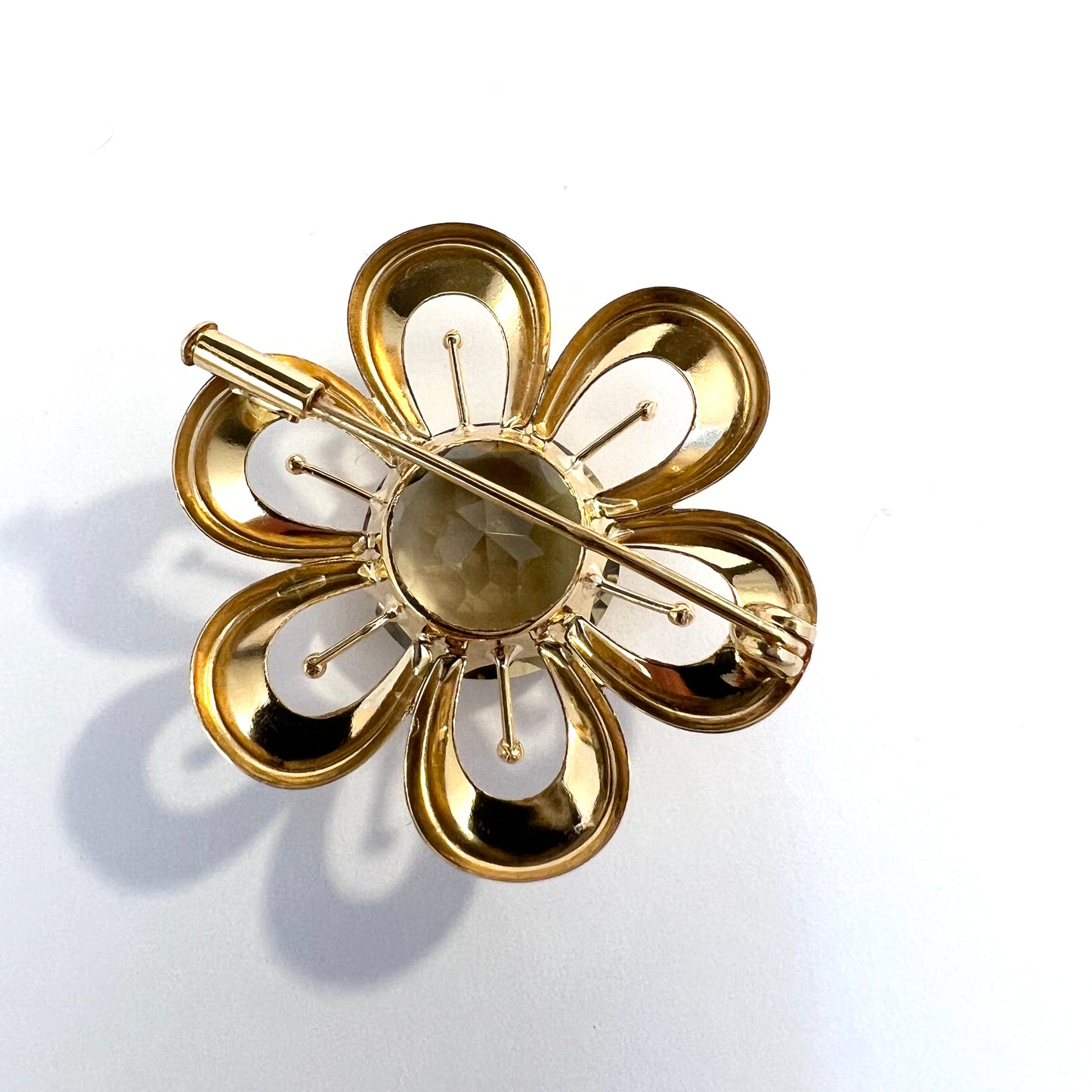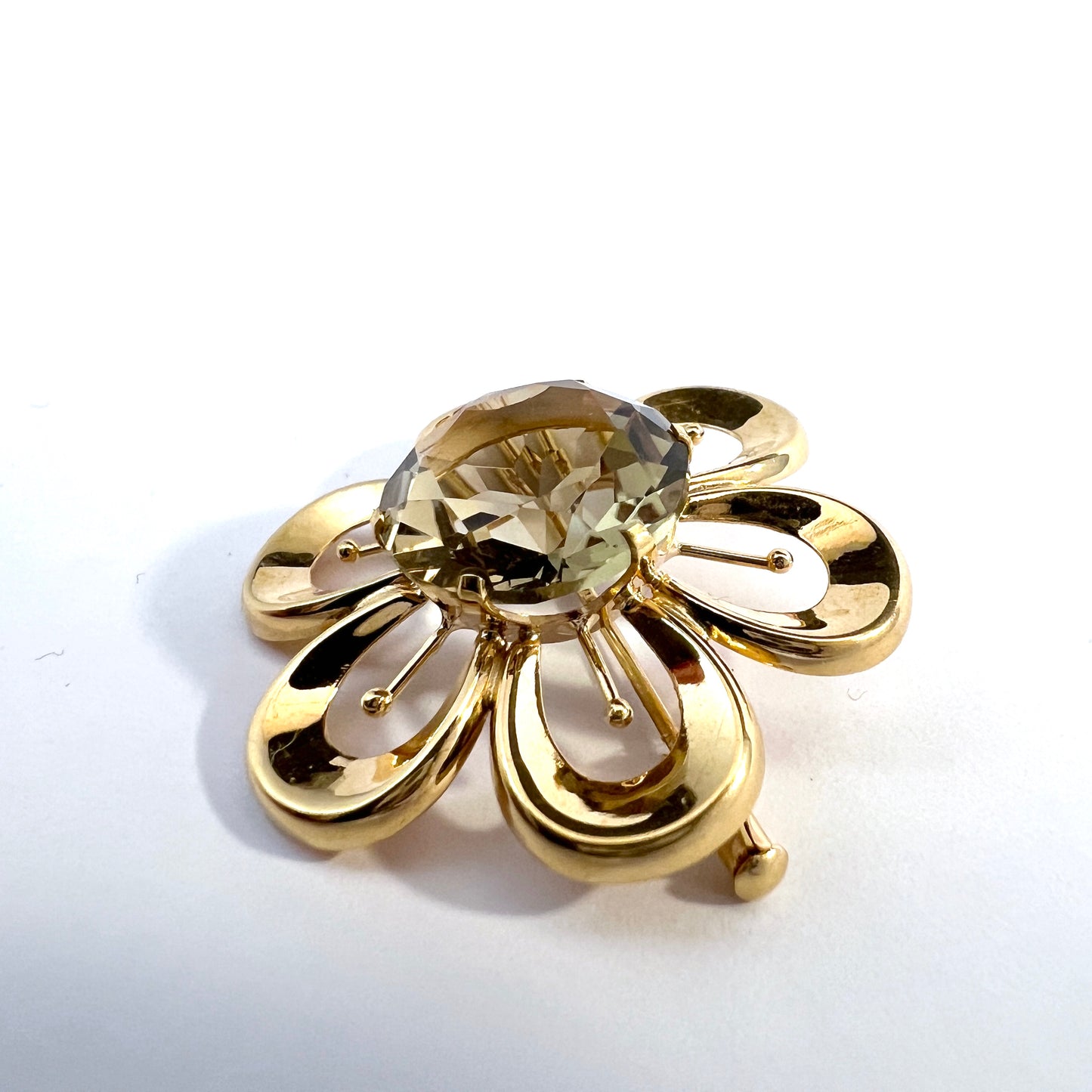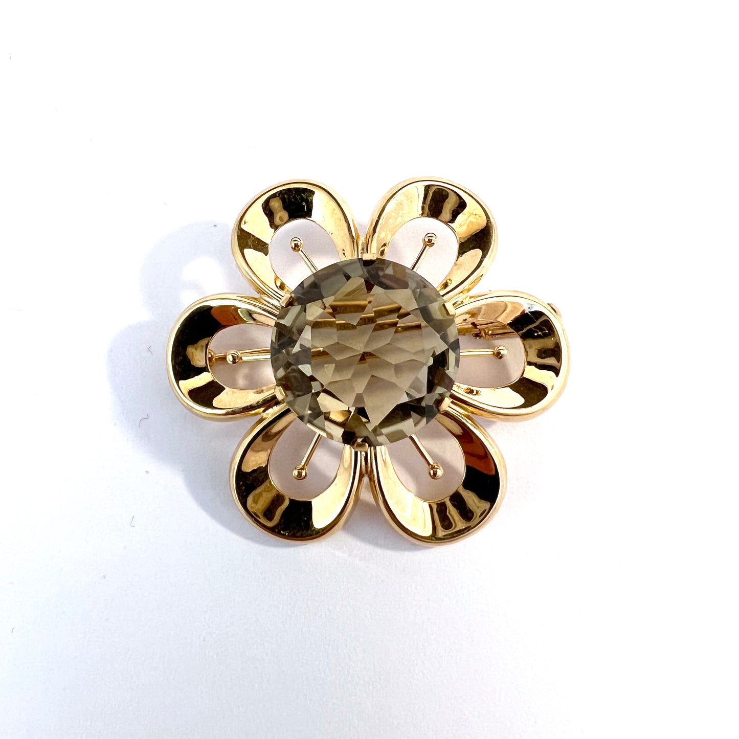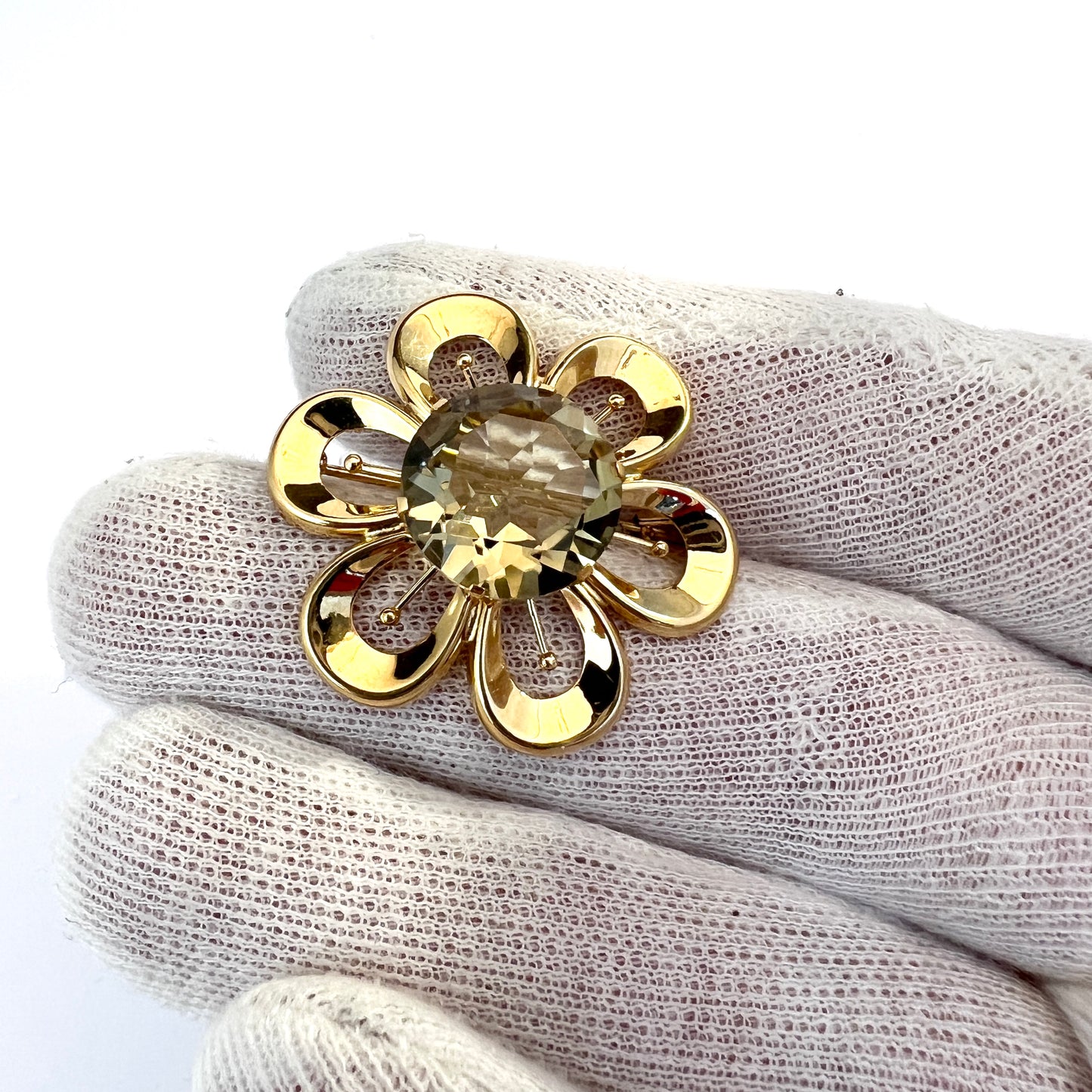 Wonderful mid century 18k gold yellow/brown/green quartz brooch. Hallmarked for 18k gold, Sweden c 1950s. Indistinct makers mark.