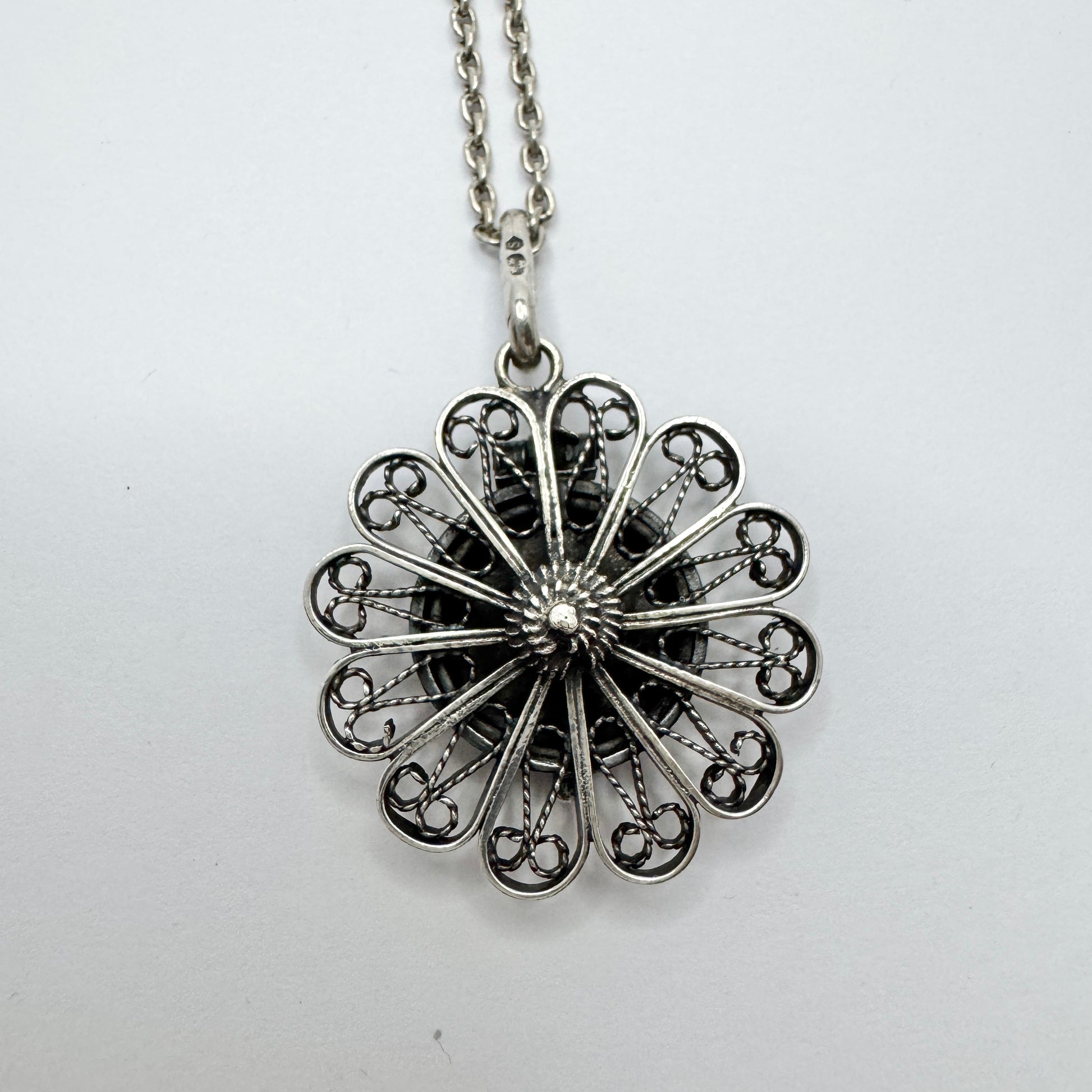 Sweden c 1940s. Solid Silver Filigree Locket Pendant Necklace.
