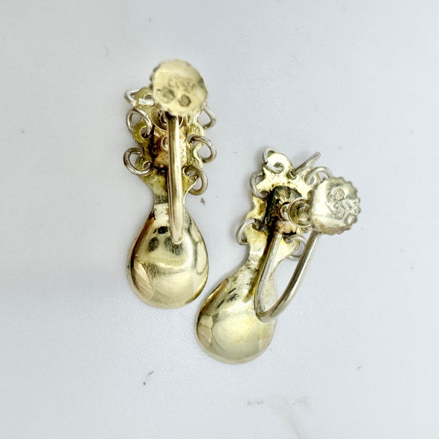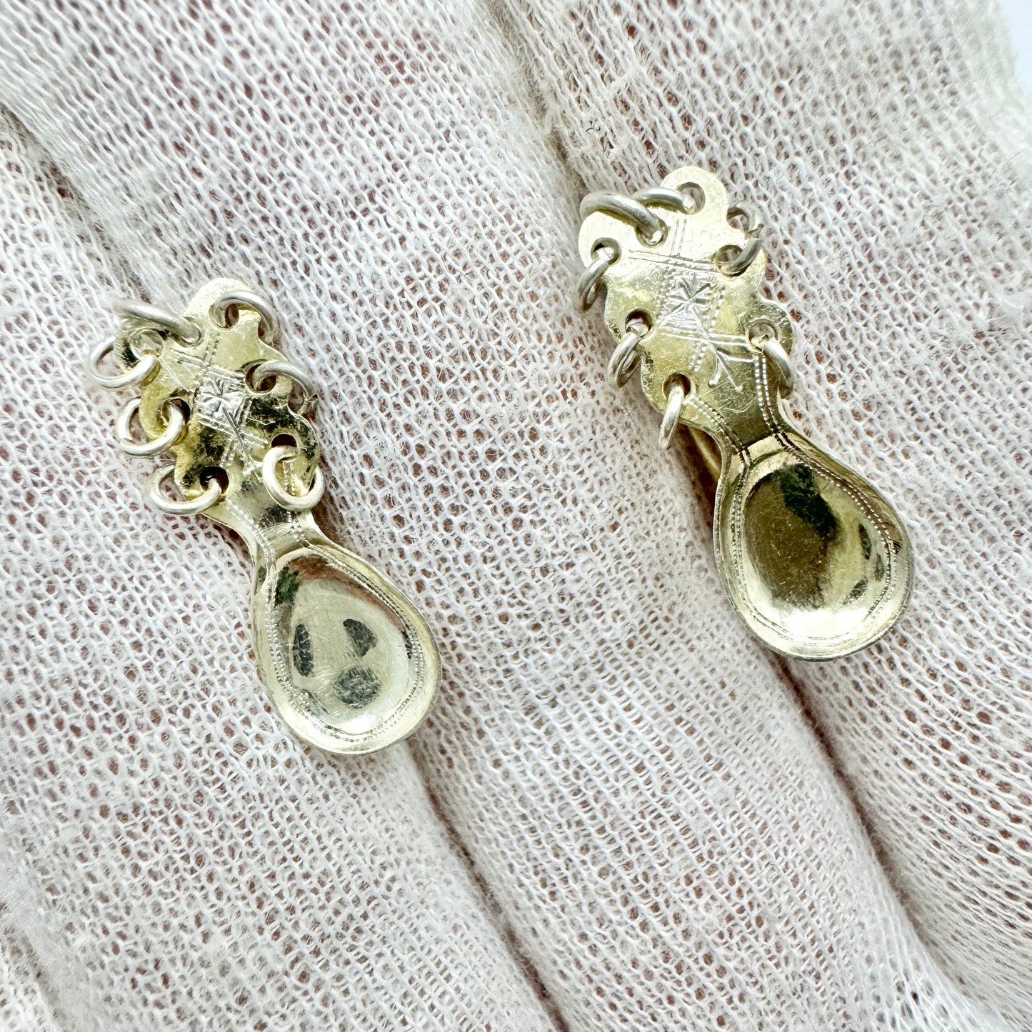 Beautiful vintage gilt solid silver Sami Laplander spoon screw-back earrings. Hallmarked for 835 silver and Swedish control marks. c 1950s